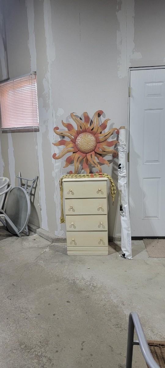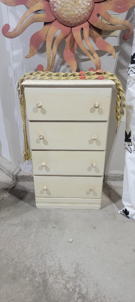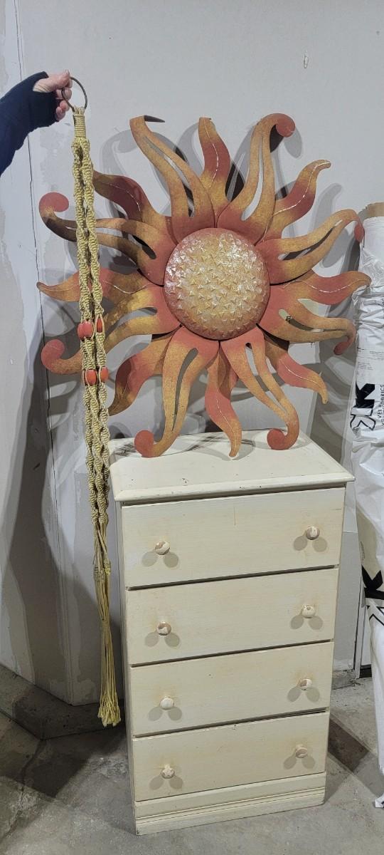 13"D 29"W 26" H 4 drawer chest. Sun yard decor, macrame hanger. Kravet fanric