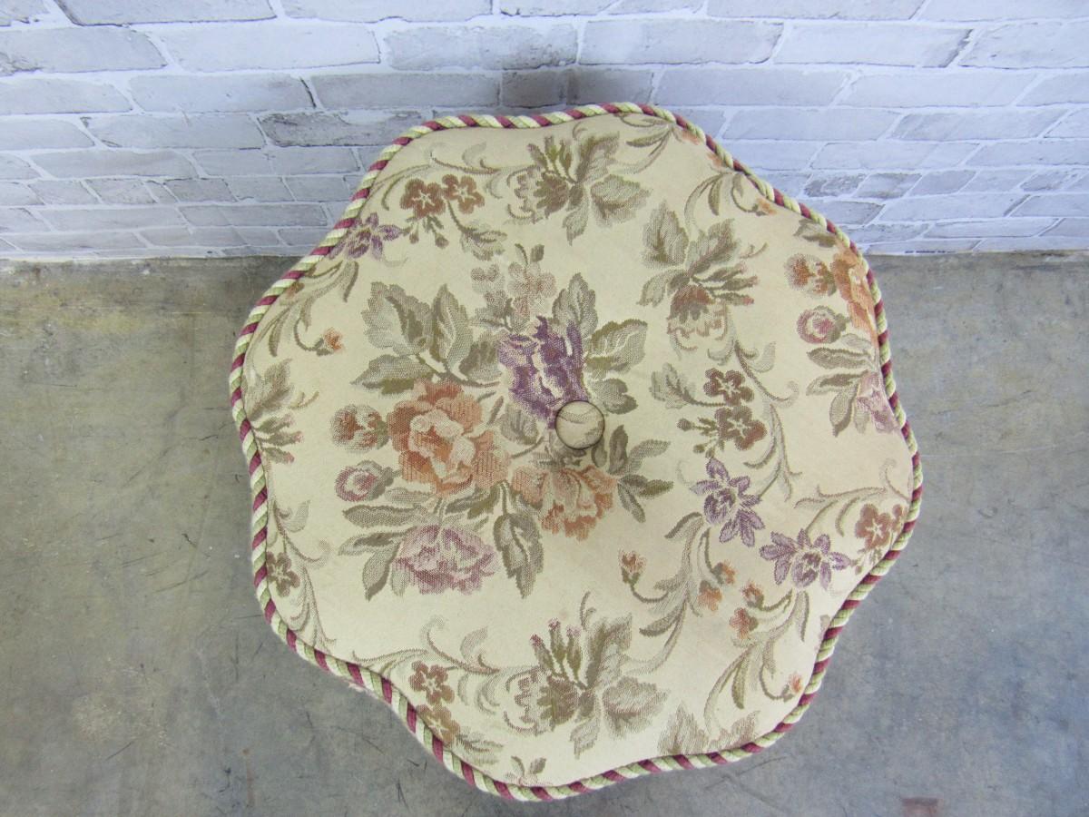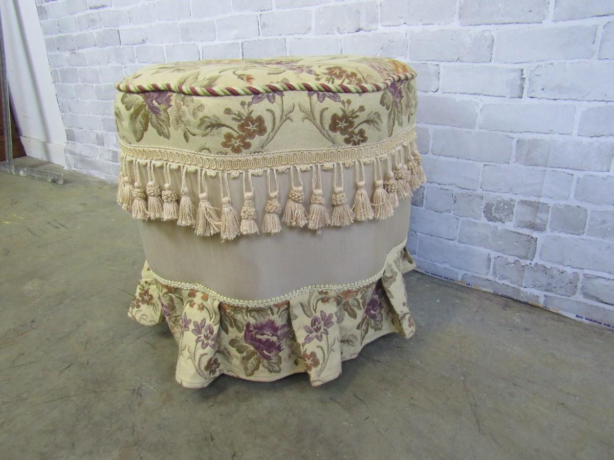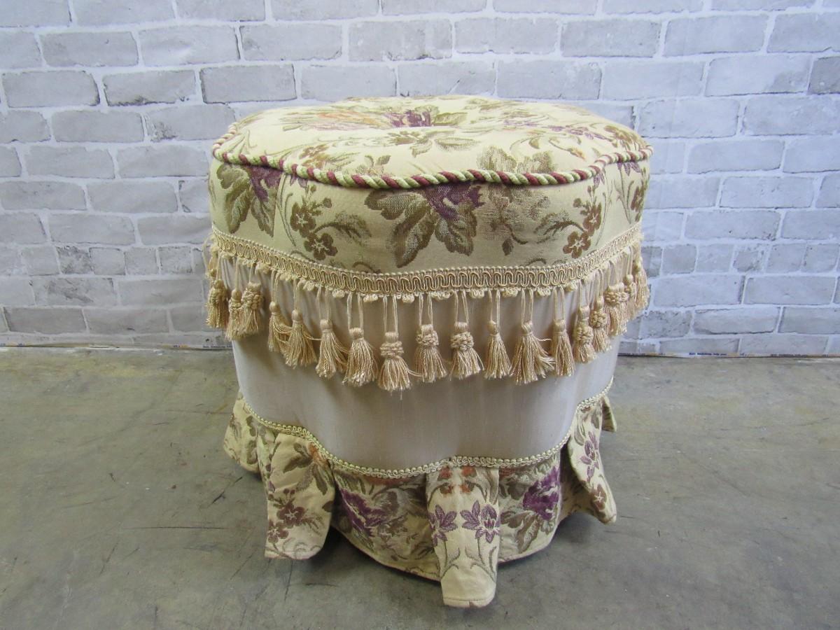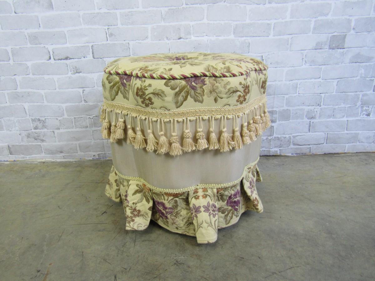 Fabric upholstered scalloped edge ottoman, excellent condition. 18" x approx 19" high.