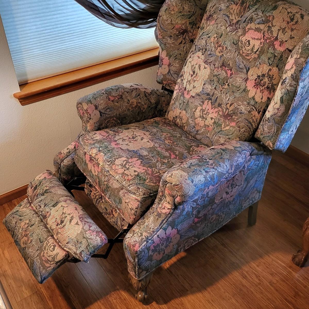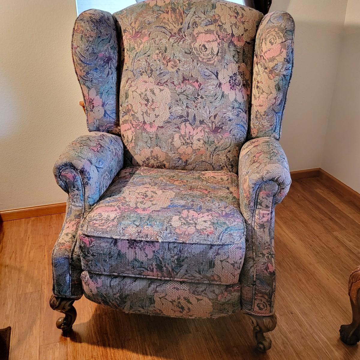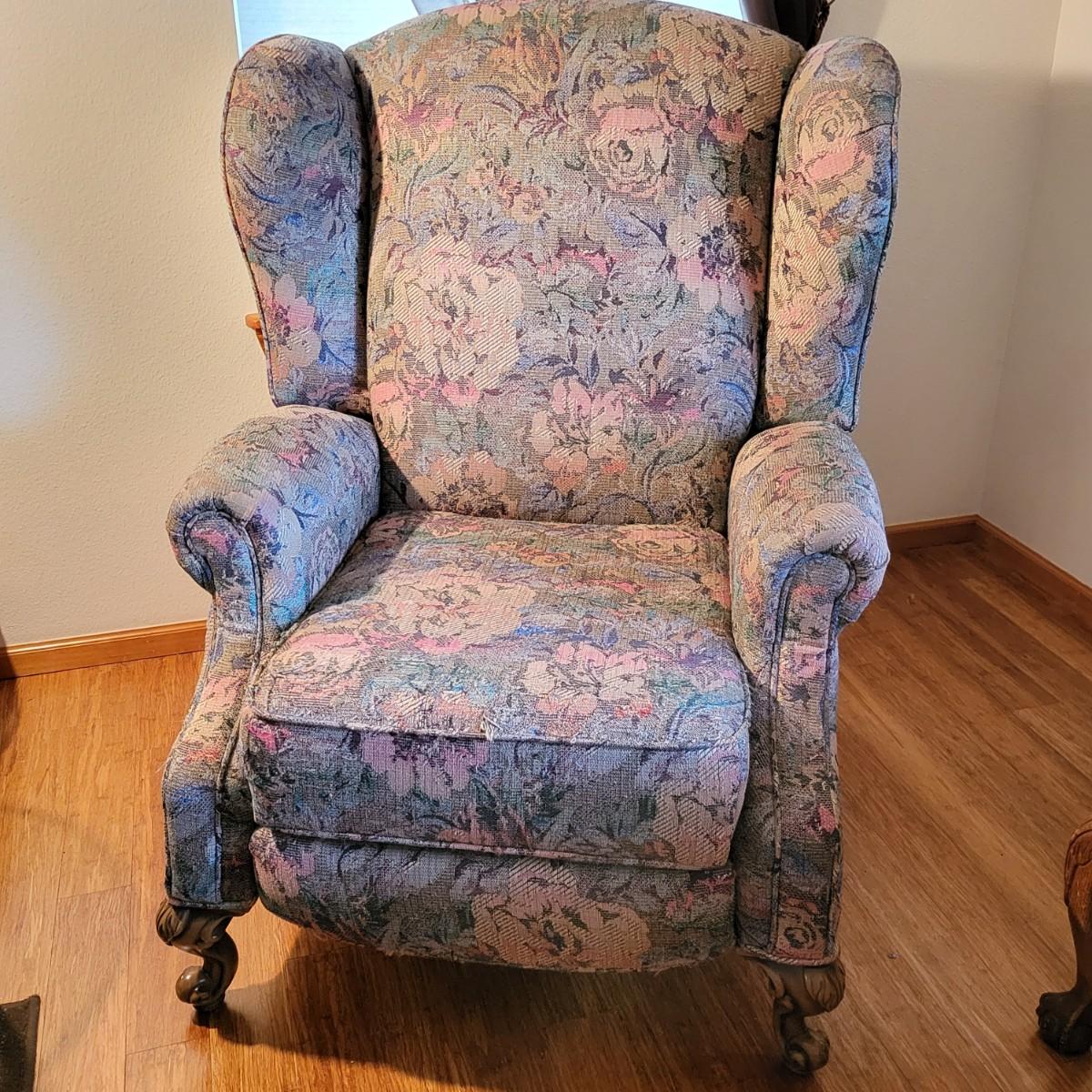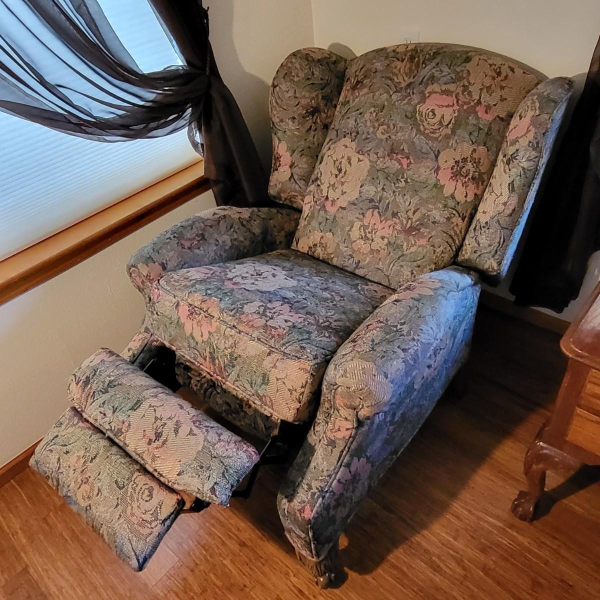 Vintage, Wing Push Back Floral Print Fabric Recliner. Uses your own body weight to recline with ease. In upright position, it measures 31" wide x 31" long x 40" high (at back). Fully reclined is 65" long. Seat cushion size is 20" x 20". Could be a project reupholster but bones are good and functions properly.