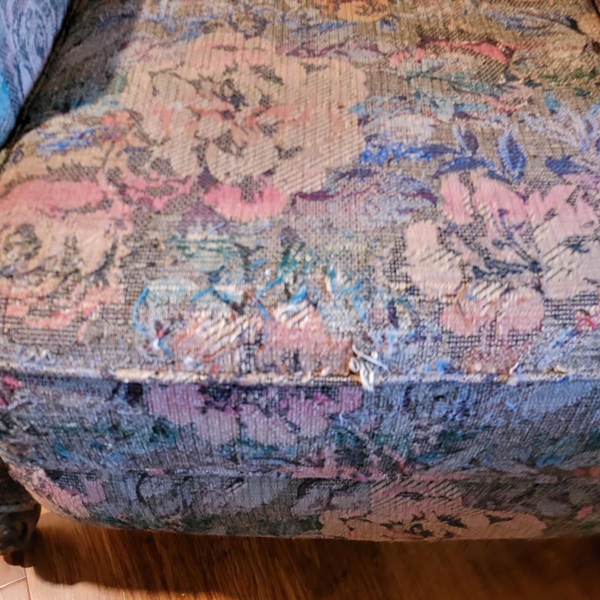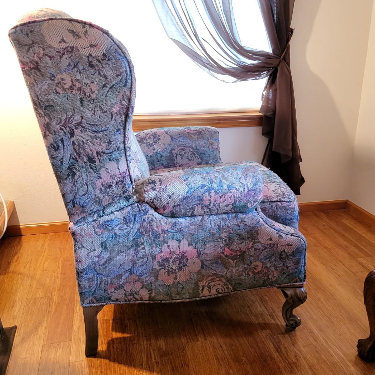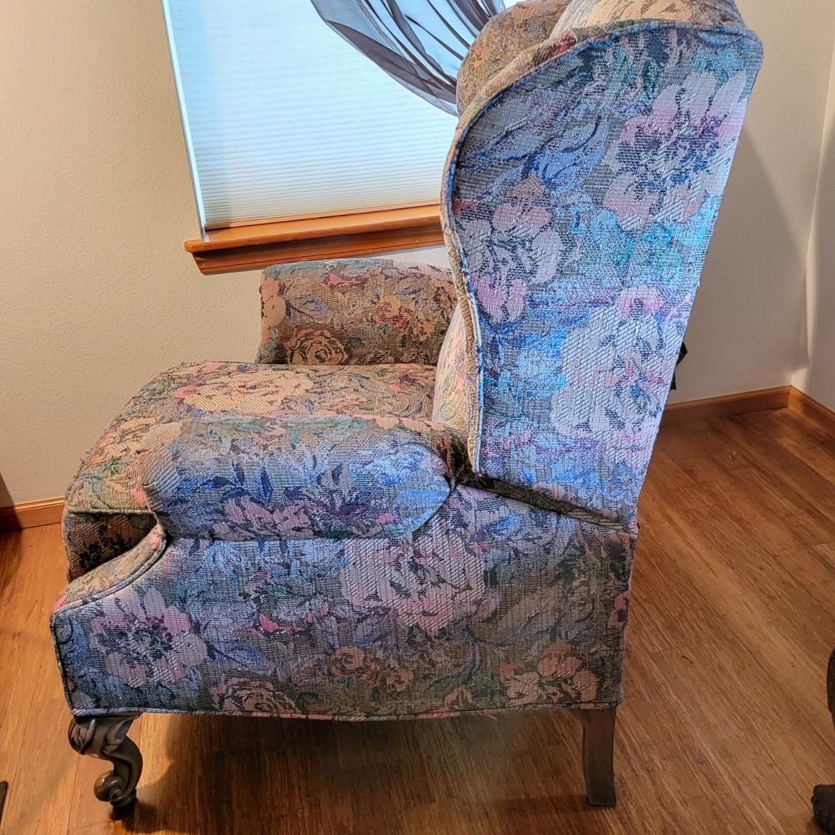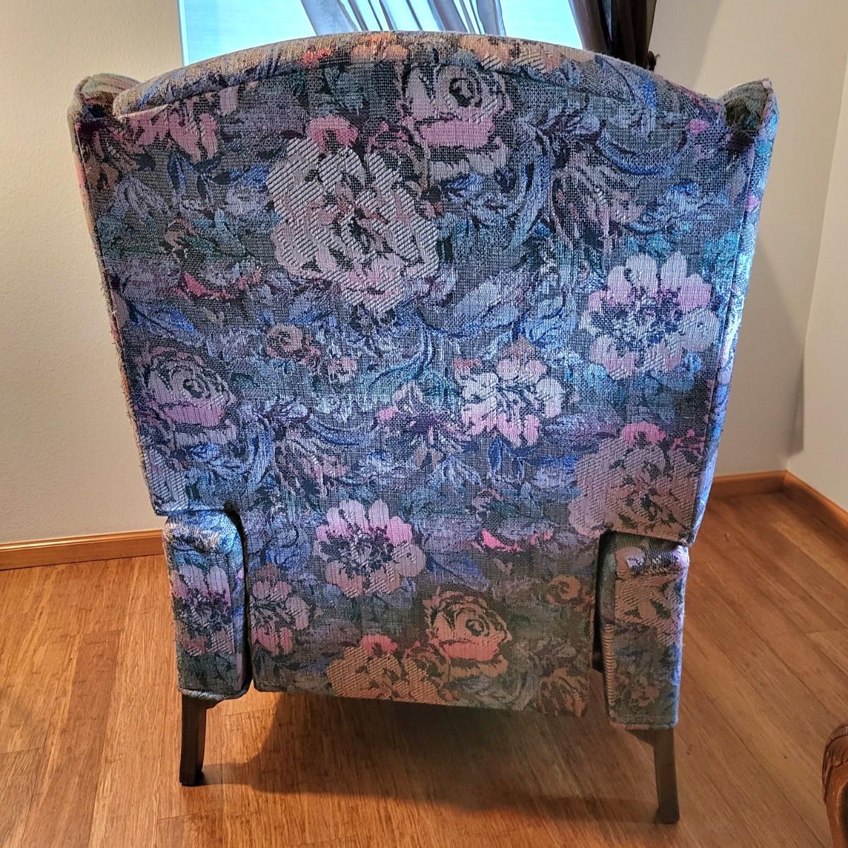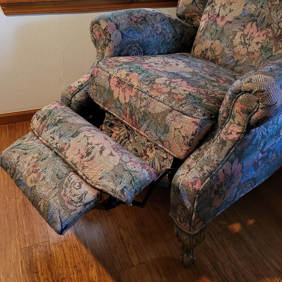 Vintage, Wing Push Back Floral Print Fabric Recliner. Uses your own body weight to recline with ease. In upright position, it measures 31" wide x 31" long x 40" high (at back). Fully reclined is 65" long. Seat cushion size is 20" x 20". Could be a project reupholster but bones are good and functions properly.