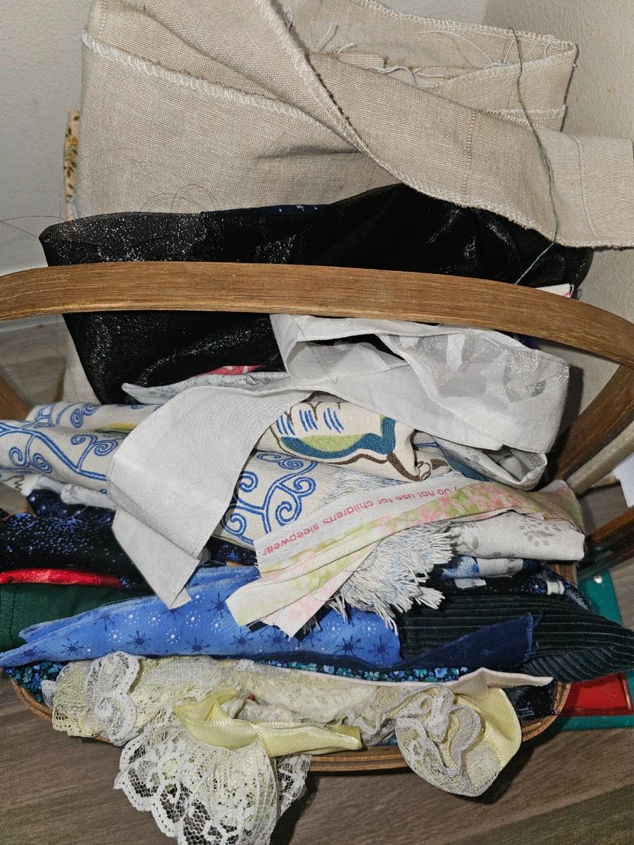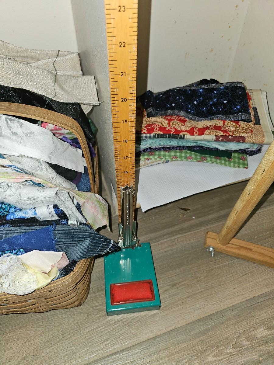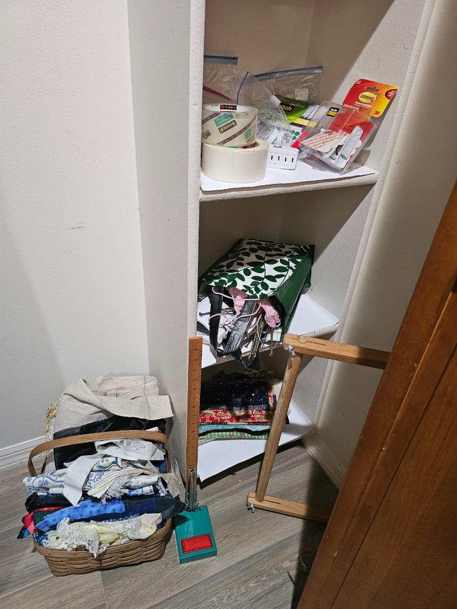 Assorted pieces of cut fabric, yarn, sewing accessories, measuring for hem, knitting needles, assorted office supplies