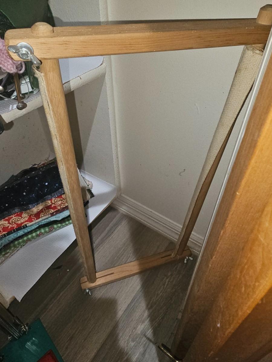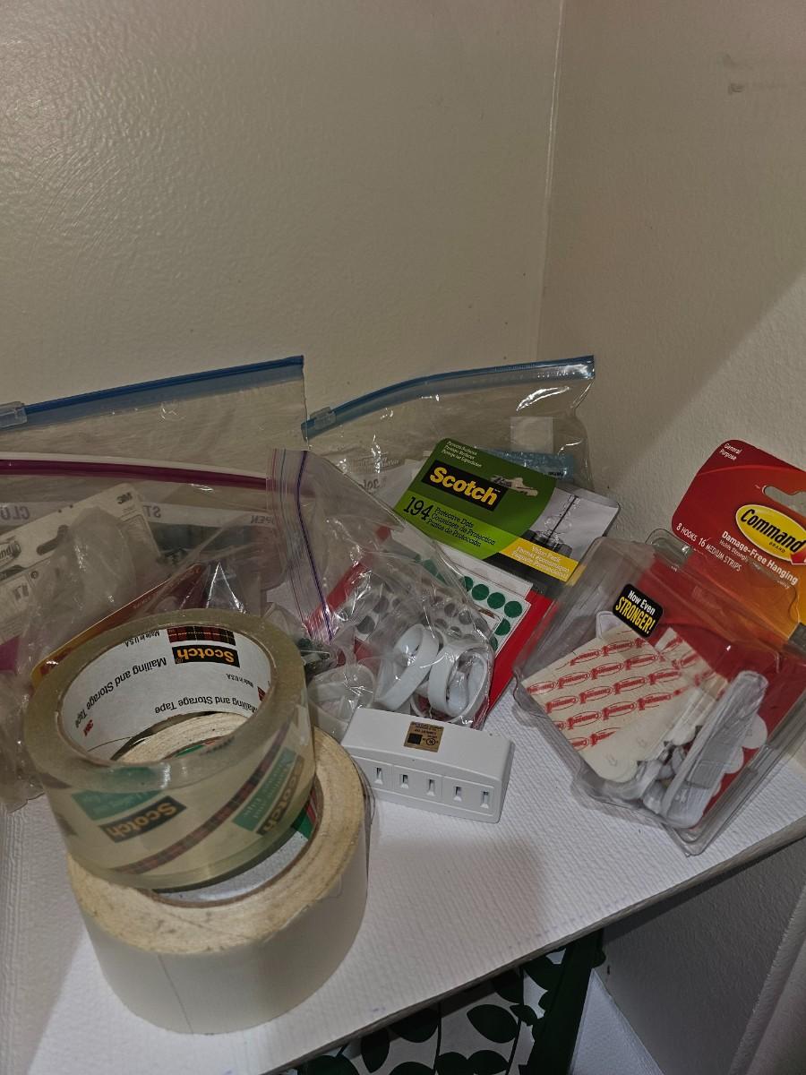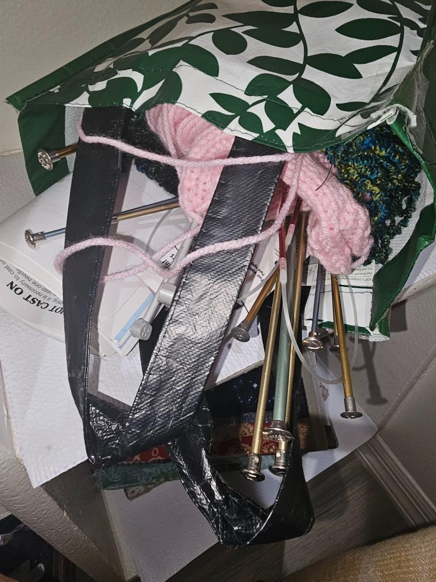 Assorted pieces of cut fabric, yarn, sewing accessories, measuring for hem, knitting needles, assorted office supplies