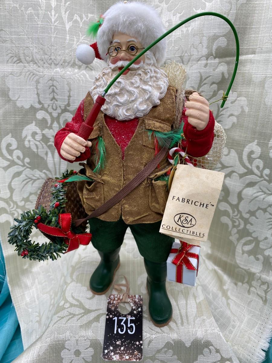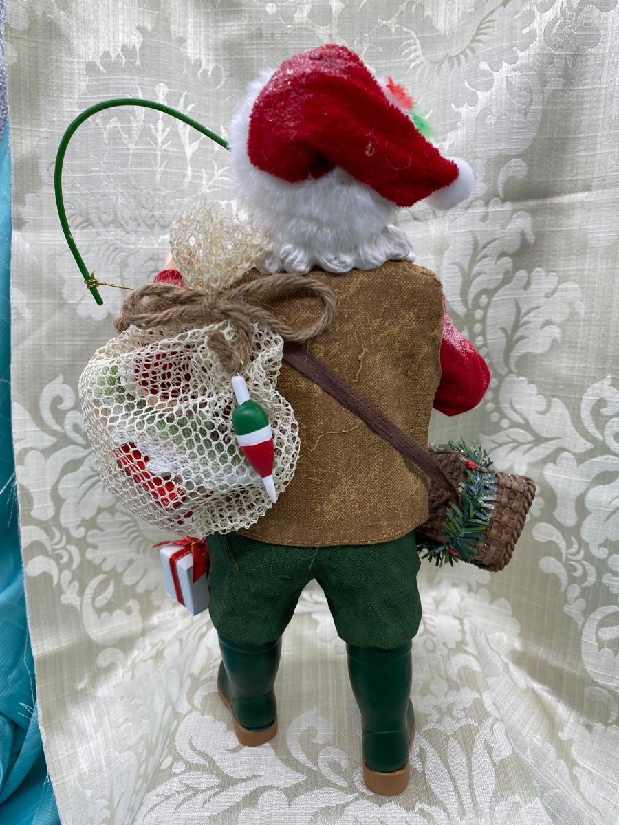 Santa with fishing pole, net, fish basket, waders and boots Good condition, 11 inches tall