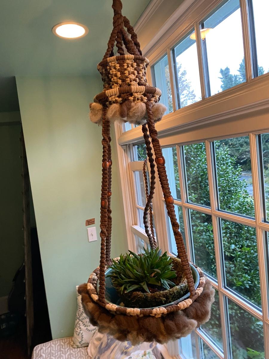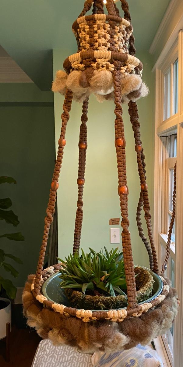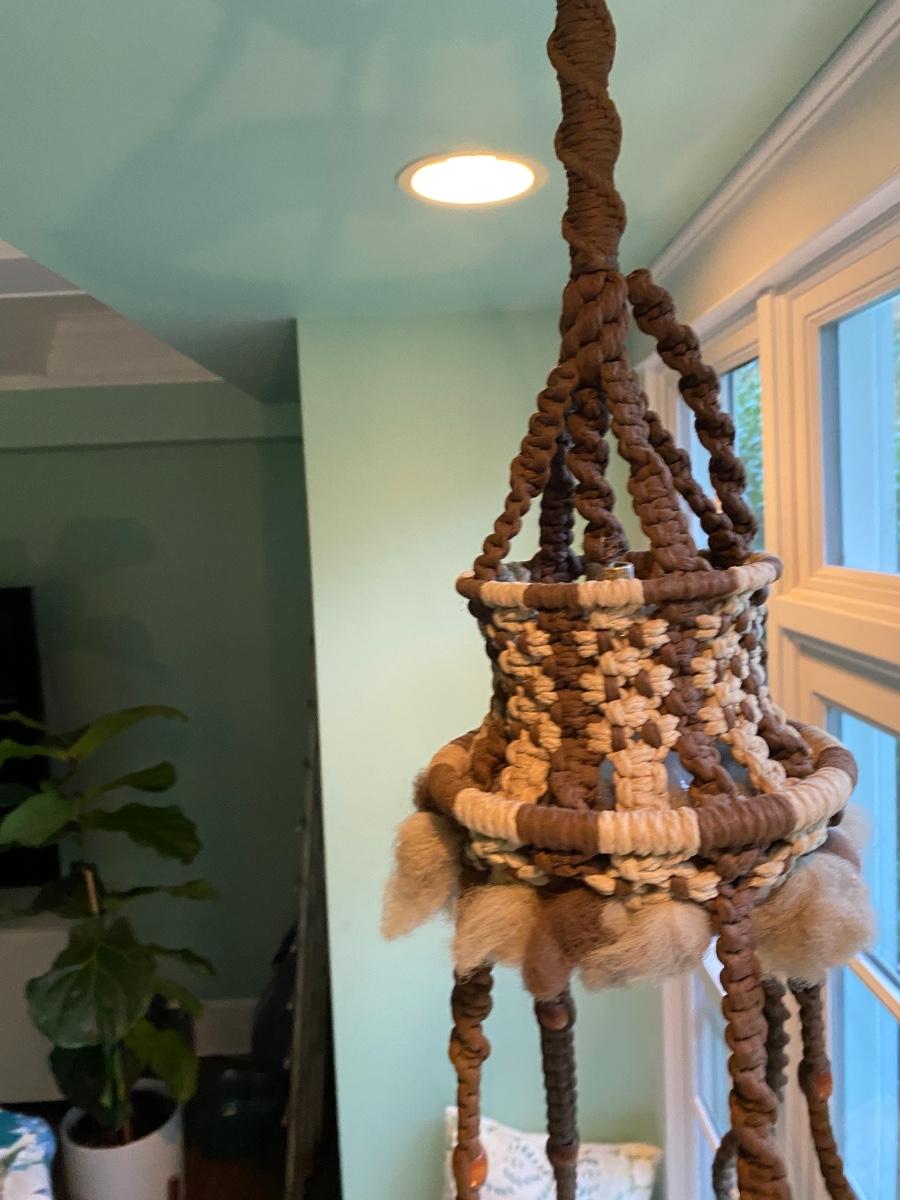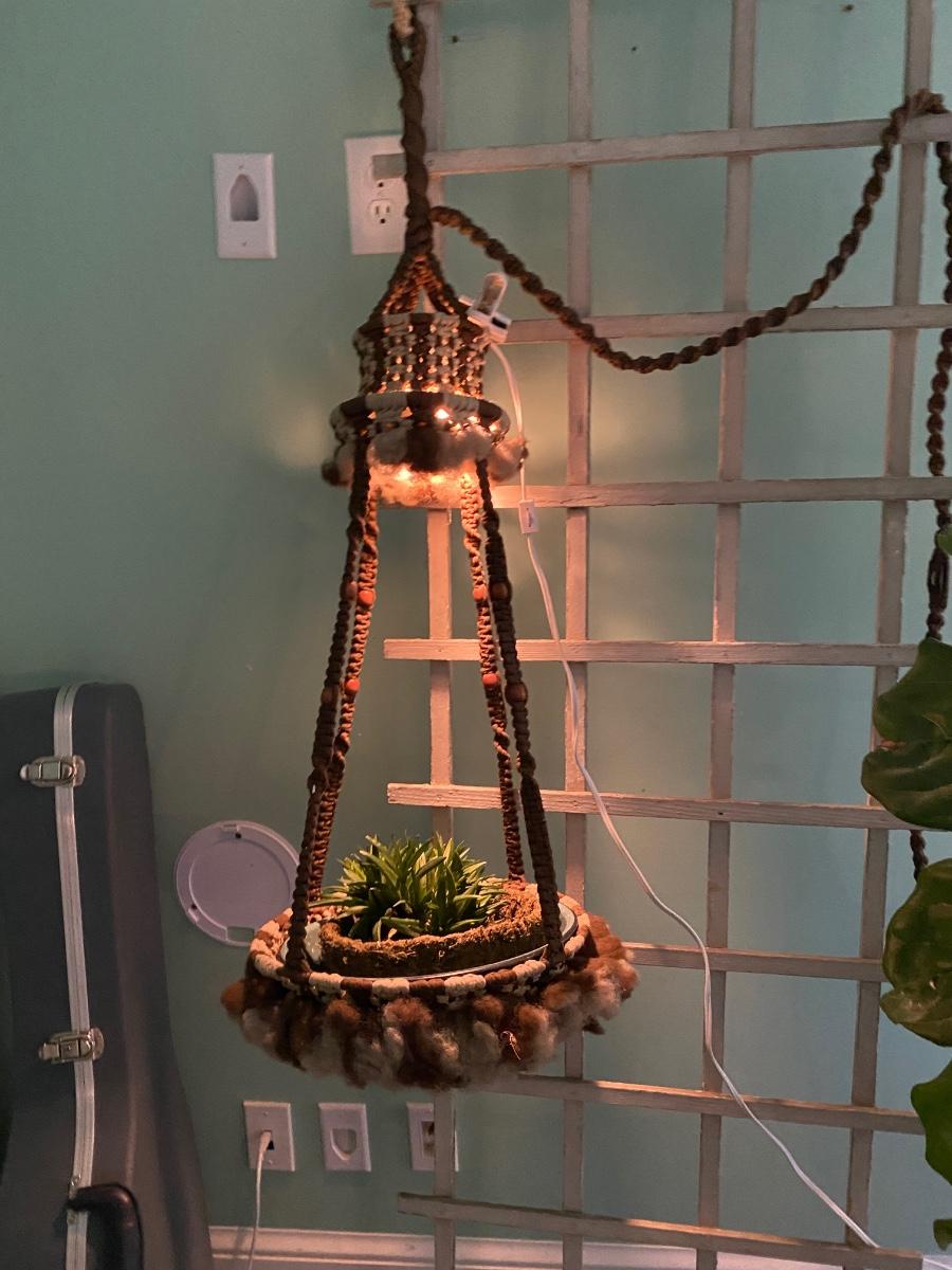 Fabulous 70s macrame hanging planter with light ! RETRO