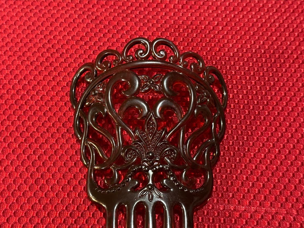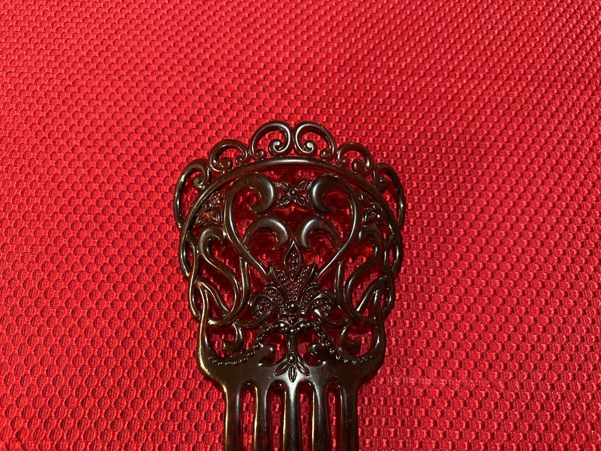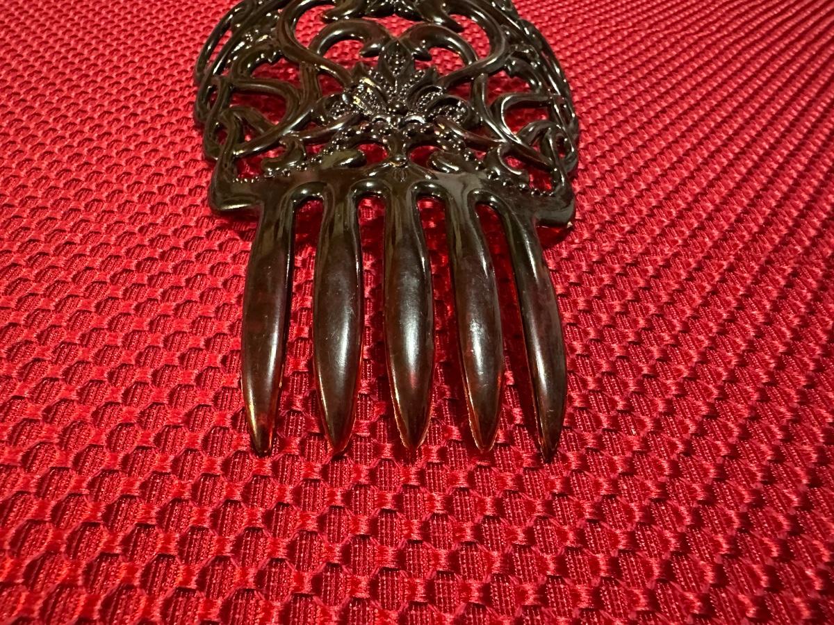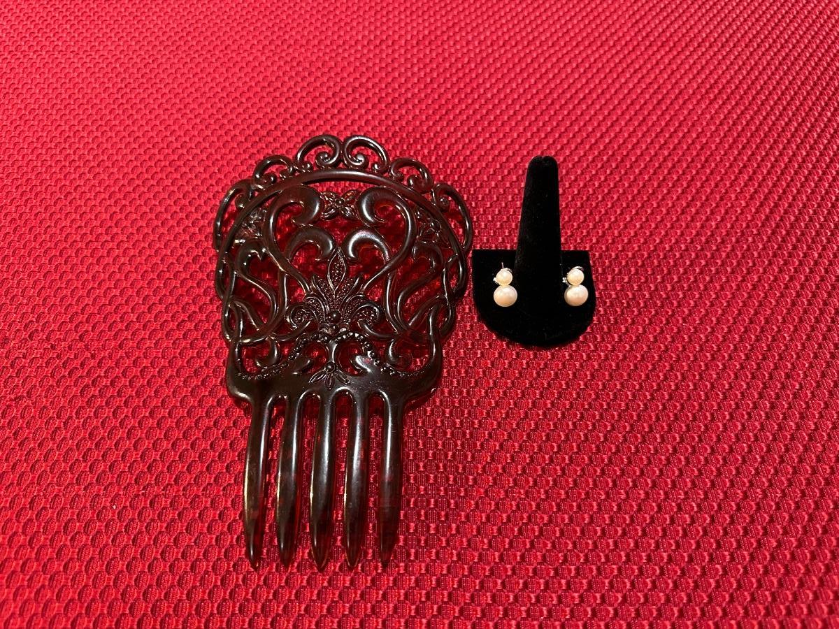 Antique hair comb is in good condition. Pearl earrings are on silver studs.