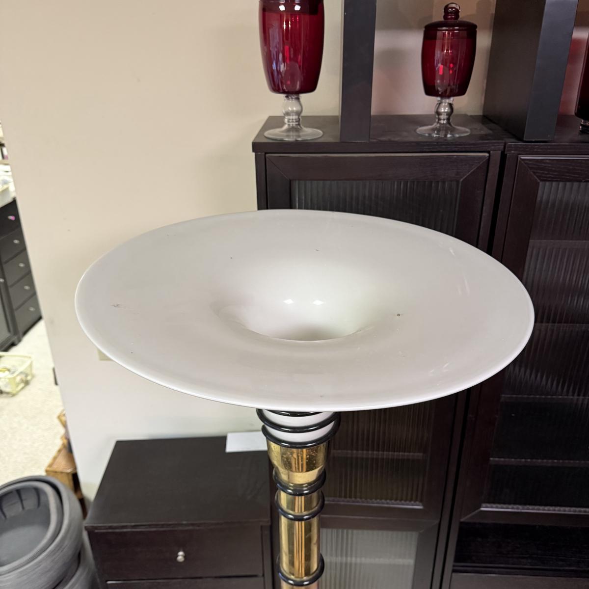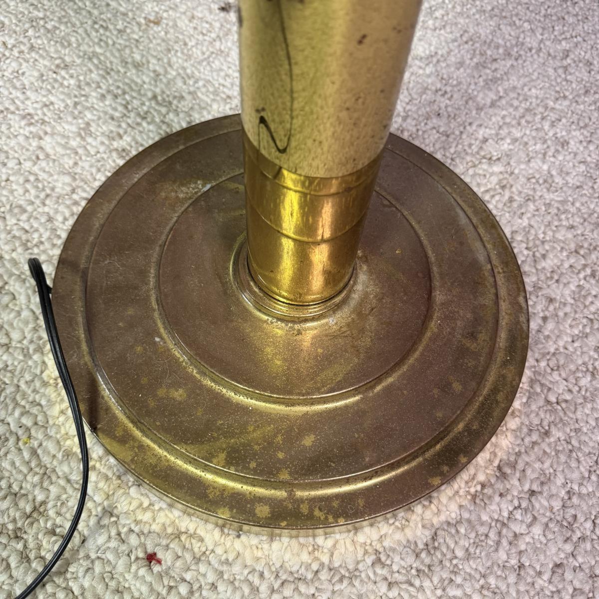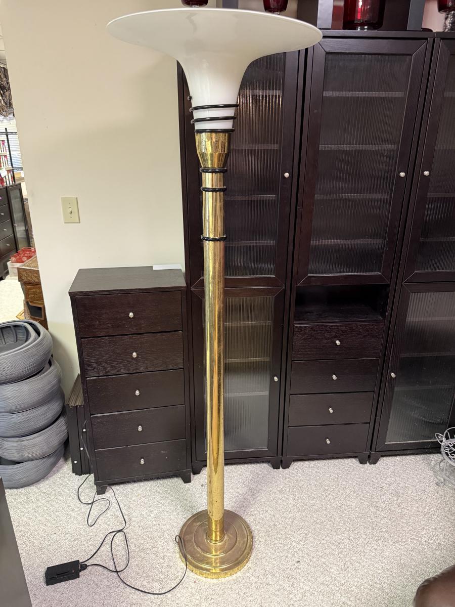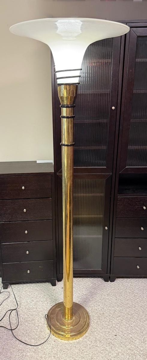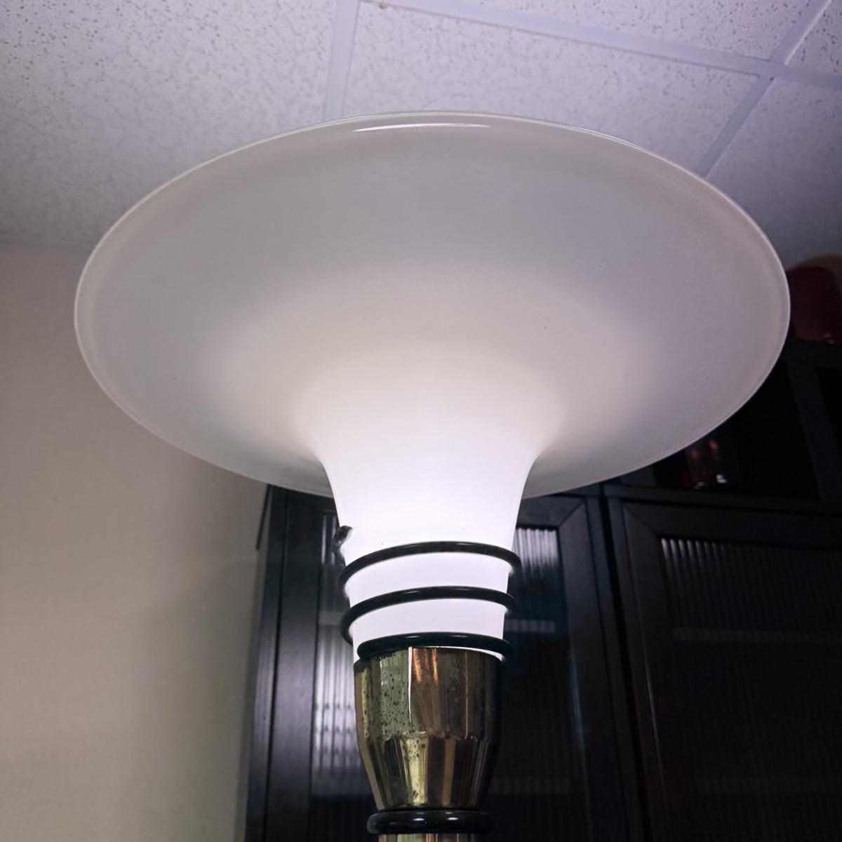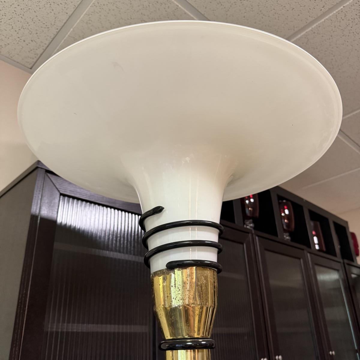 Unique art deco style floor lamp has a brass colored metal base and body, with a torchiere style white glass shade with a spiral of black glass to adorn its base. The shade is 21”D and the base is 12”D. The lamp is 68.5”H. The lamp powered on when plugged in. It has an attached Westek brand dimmer. The metal on the lamp shows some rust/wear and there is a crack at the top of the metal.