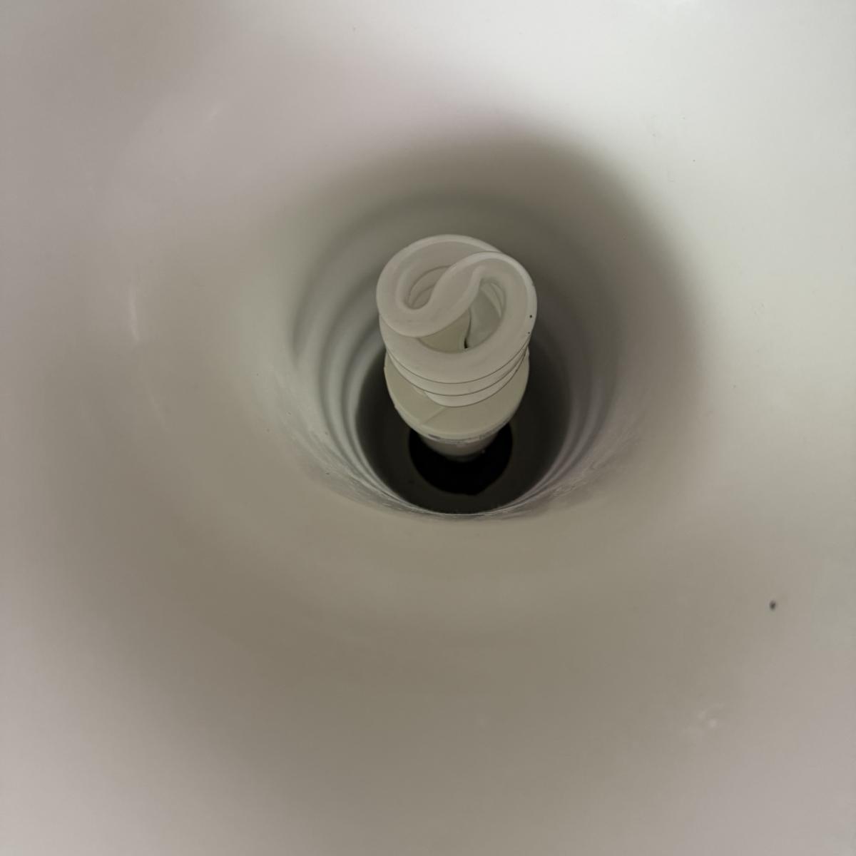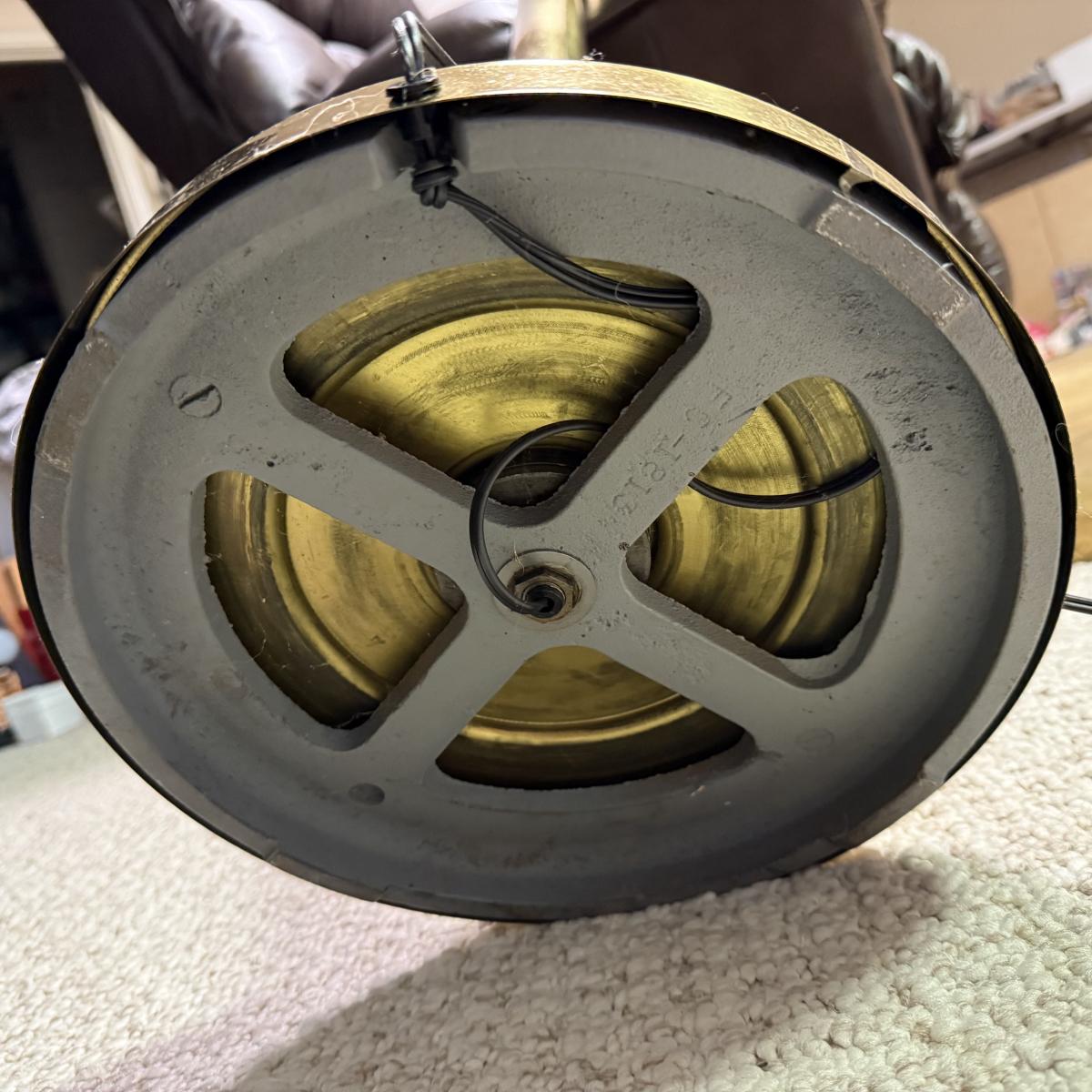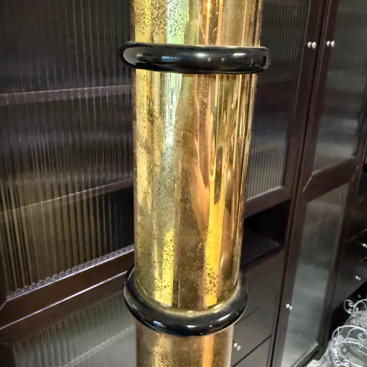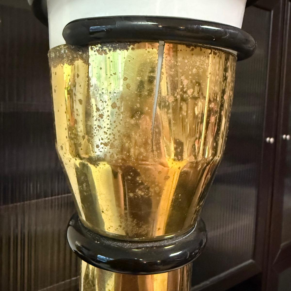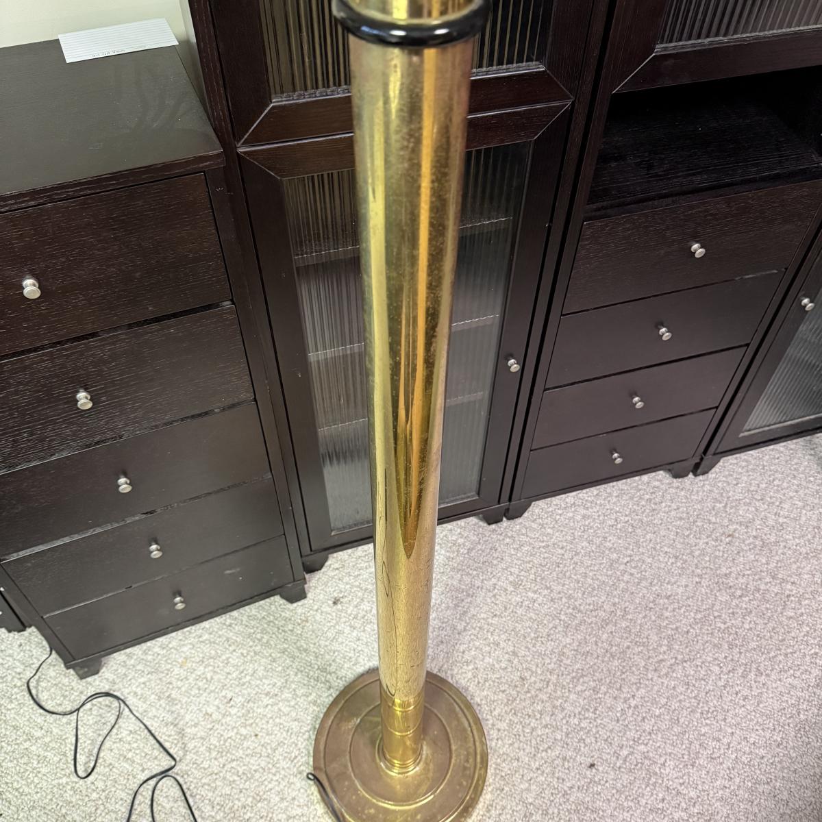Unique art deco style floor lamp has a brass colored metal base and body, with a torchiere style white glass shade with a spiral of black glass to adorn its base. The shade is 21”D and the base is 12”D. The lamp is 68.5”H. The lamp powered on when plugged in. It has an attached Westek brand dimmer. The metal on the lamp shows some rust/wear and there is a crack at the top of the metal.