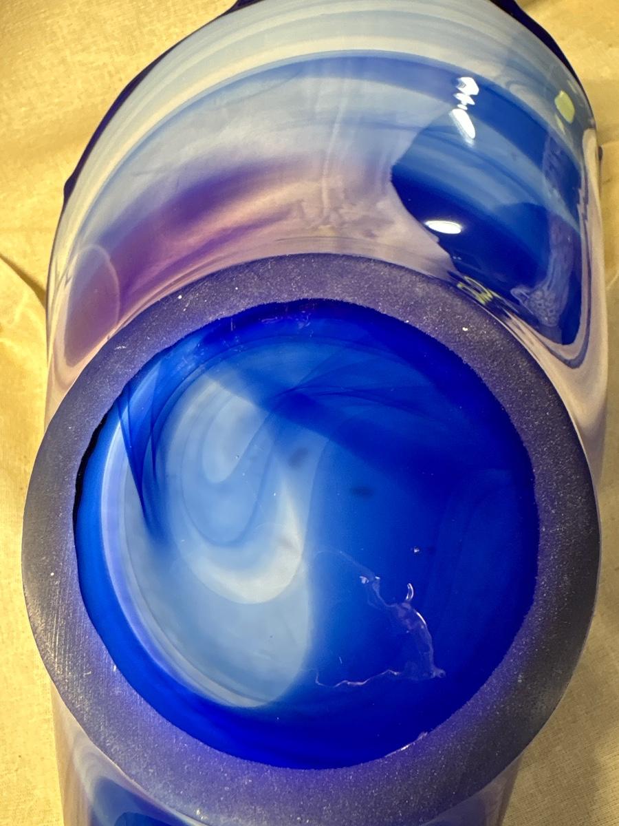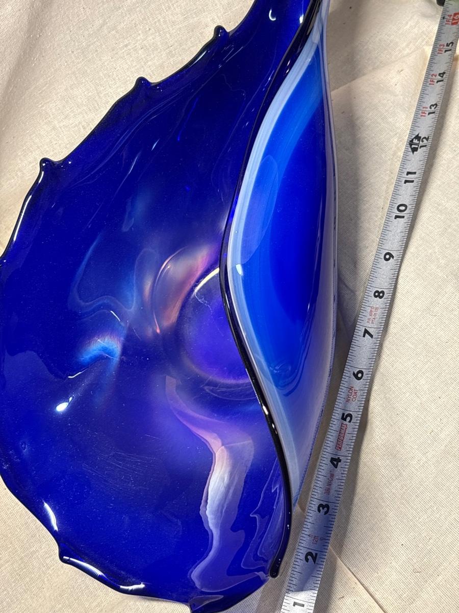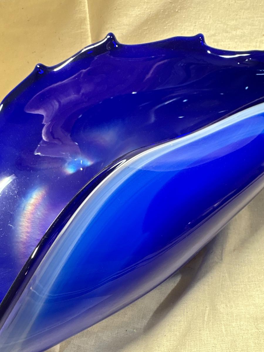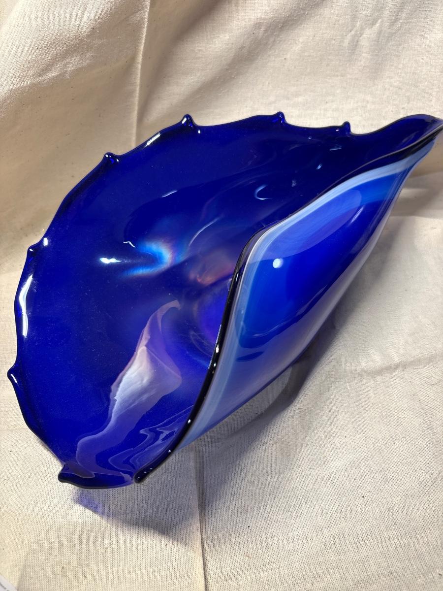 Free form blue art glass centerpiece bowl. Brilliant blue tones, believed to be polish made.