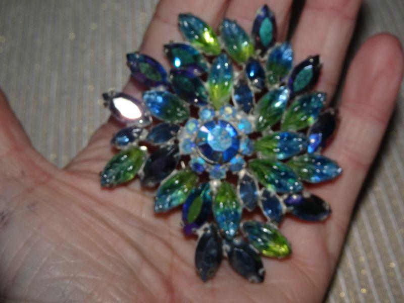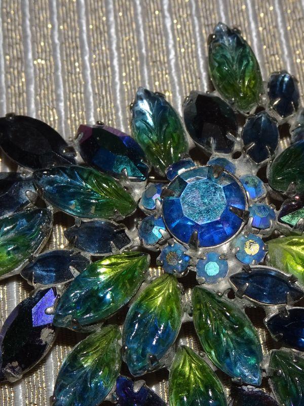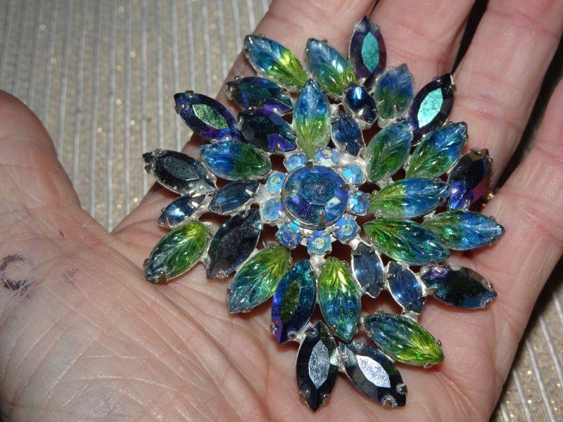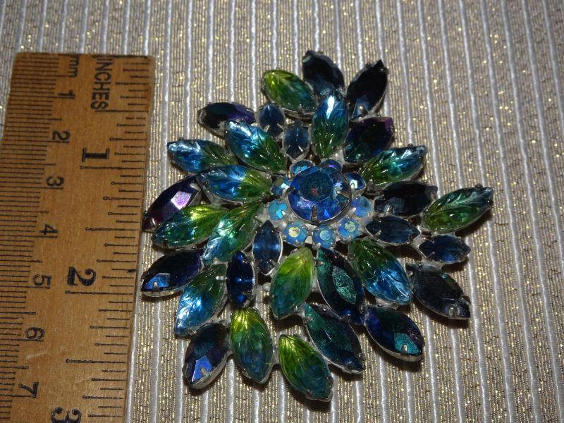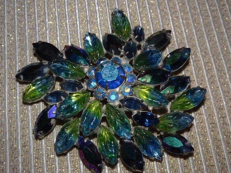 Fabulous Blue & Green Rhinestone Brooch