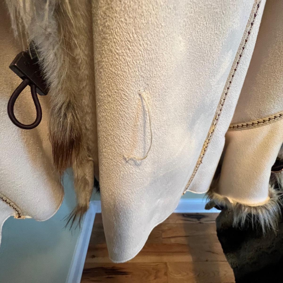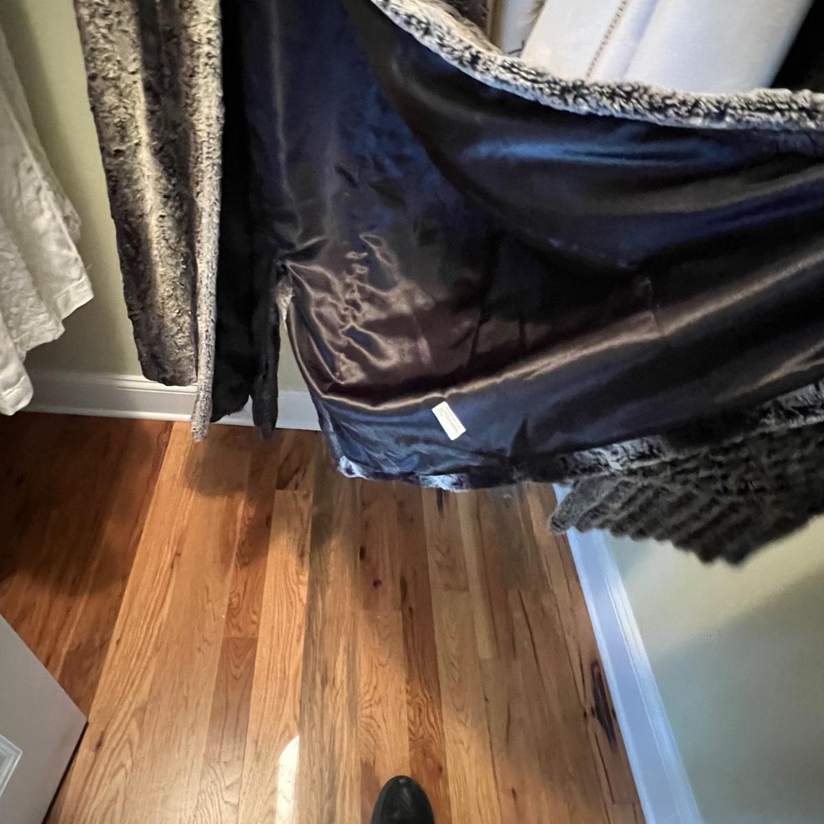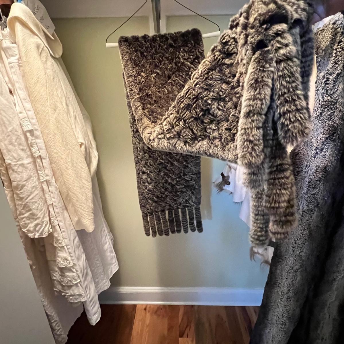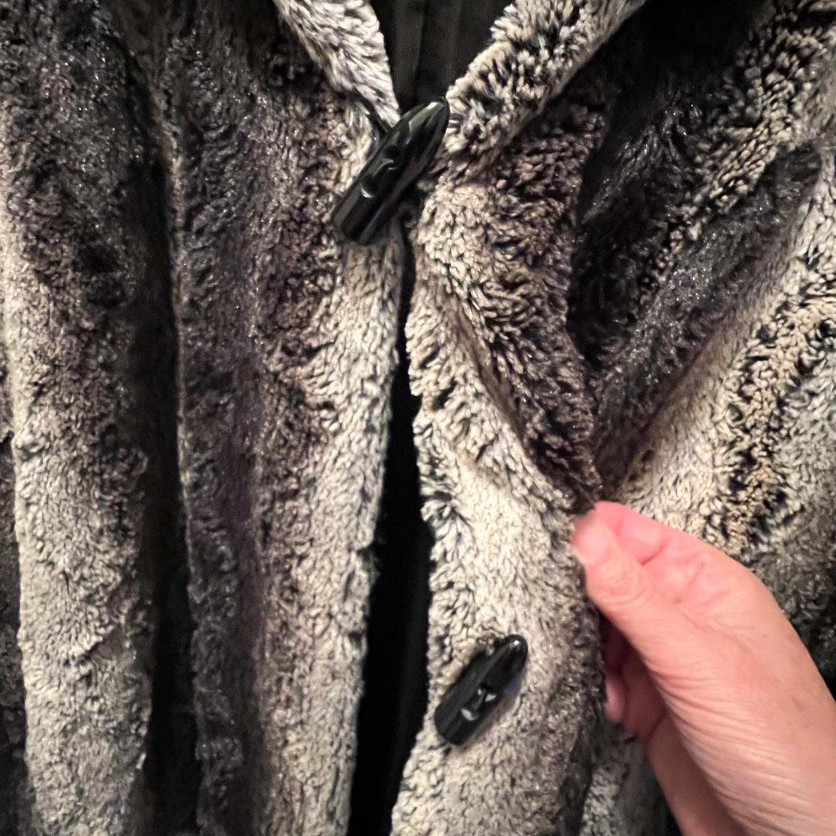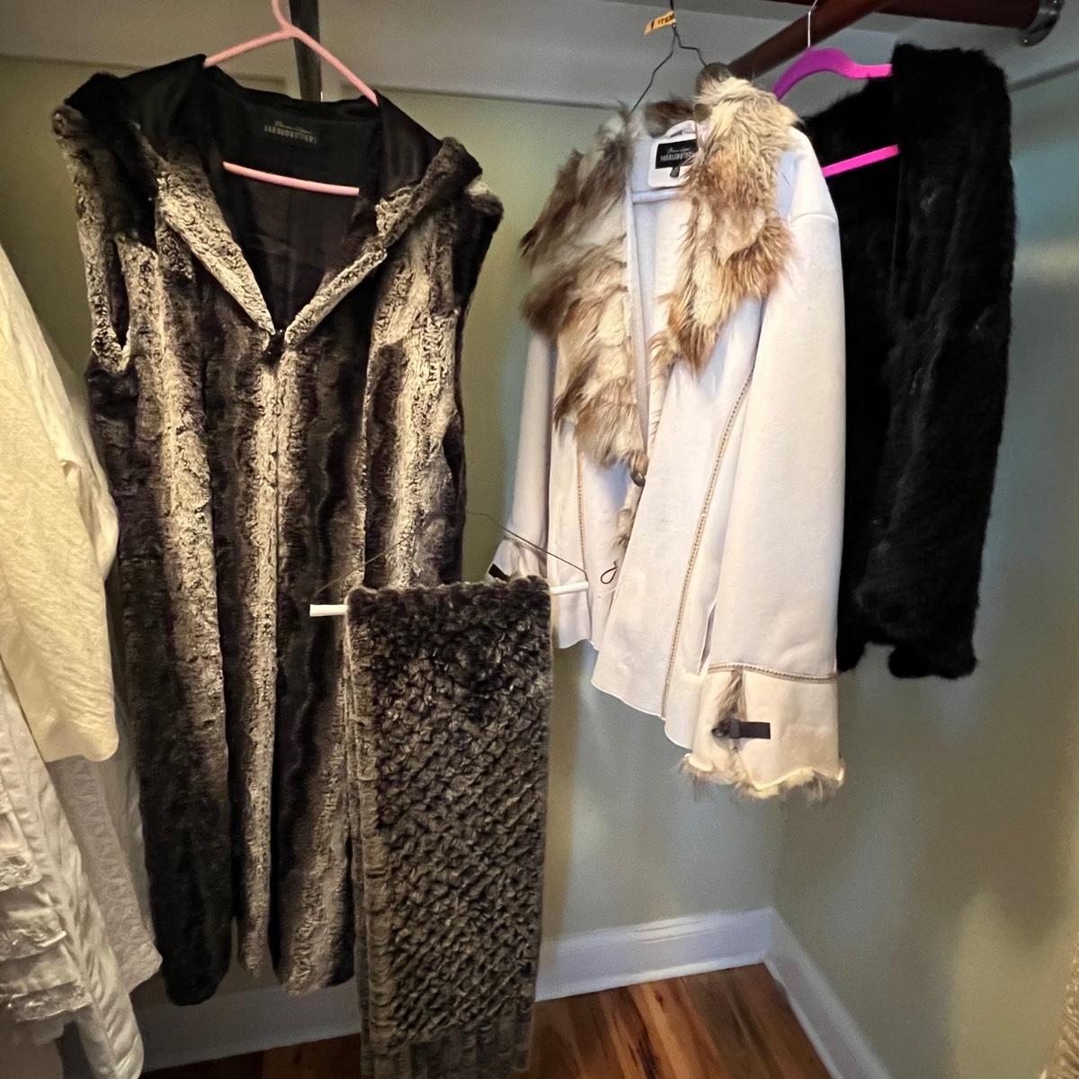 A sheerling style camel colored coat with faux fur collar and an ankle length faux fur sleeveless jacket are by Donna Salyer’s Fabulous Furs and are both size 2X. Note the sheerling jacket is missing a button. Lot also includes a super soft black poncho and long gray scarf, both have no labels.