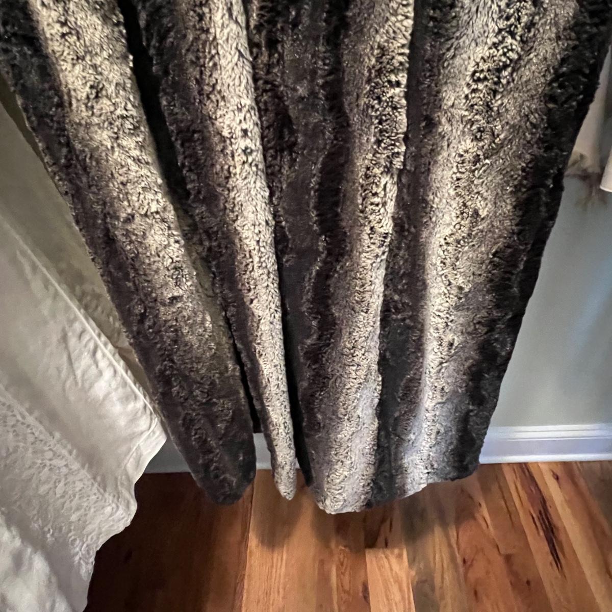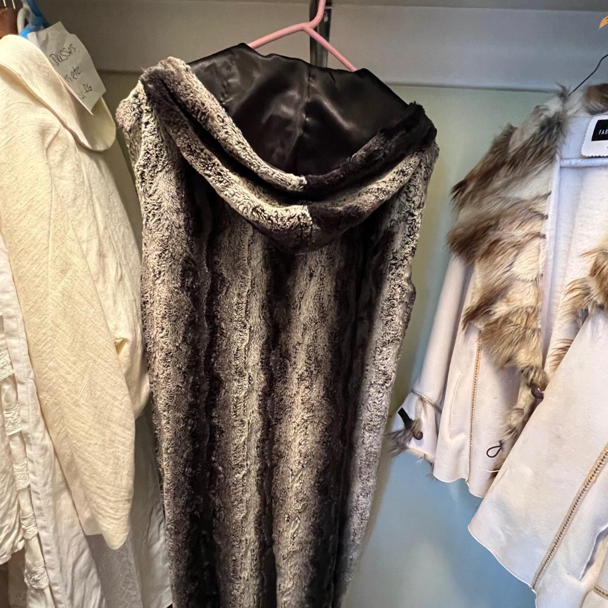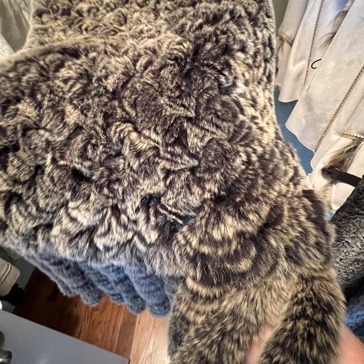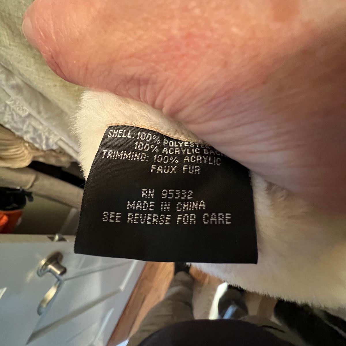 A sheerling style camel colored coat with faux fur collar and an ankle length faux fur sleeveless jacket are by Donna Salyer’s Fabulous Furs and are both size 2X. Note the sheerling jacket is missing a button. Lot also includes a super soft black poncho and long gray scarf, both have no labels.