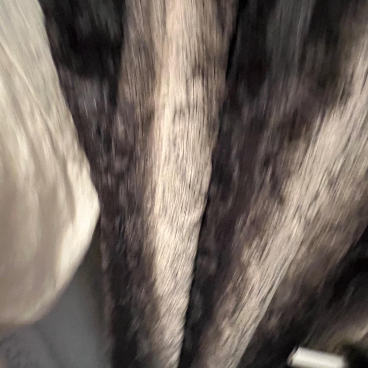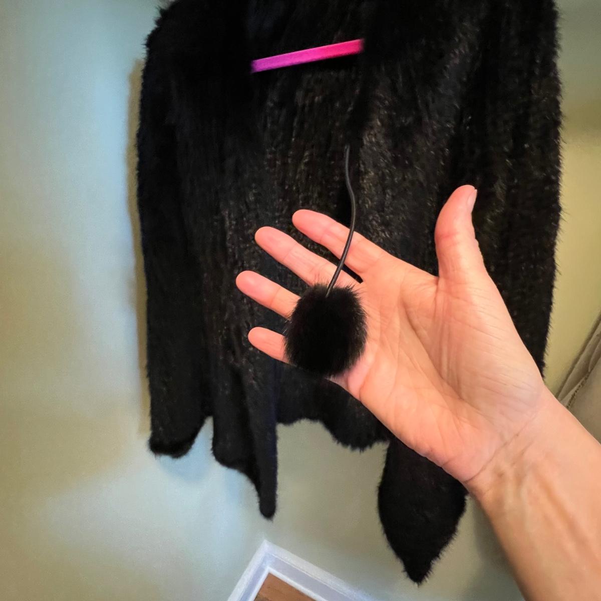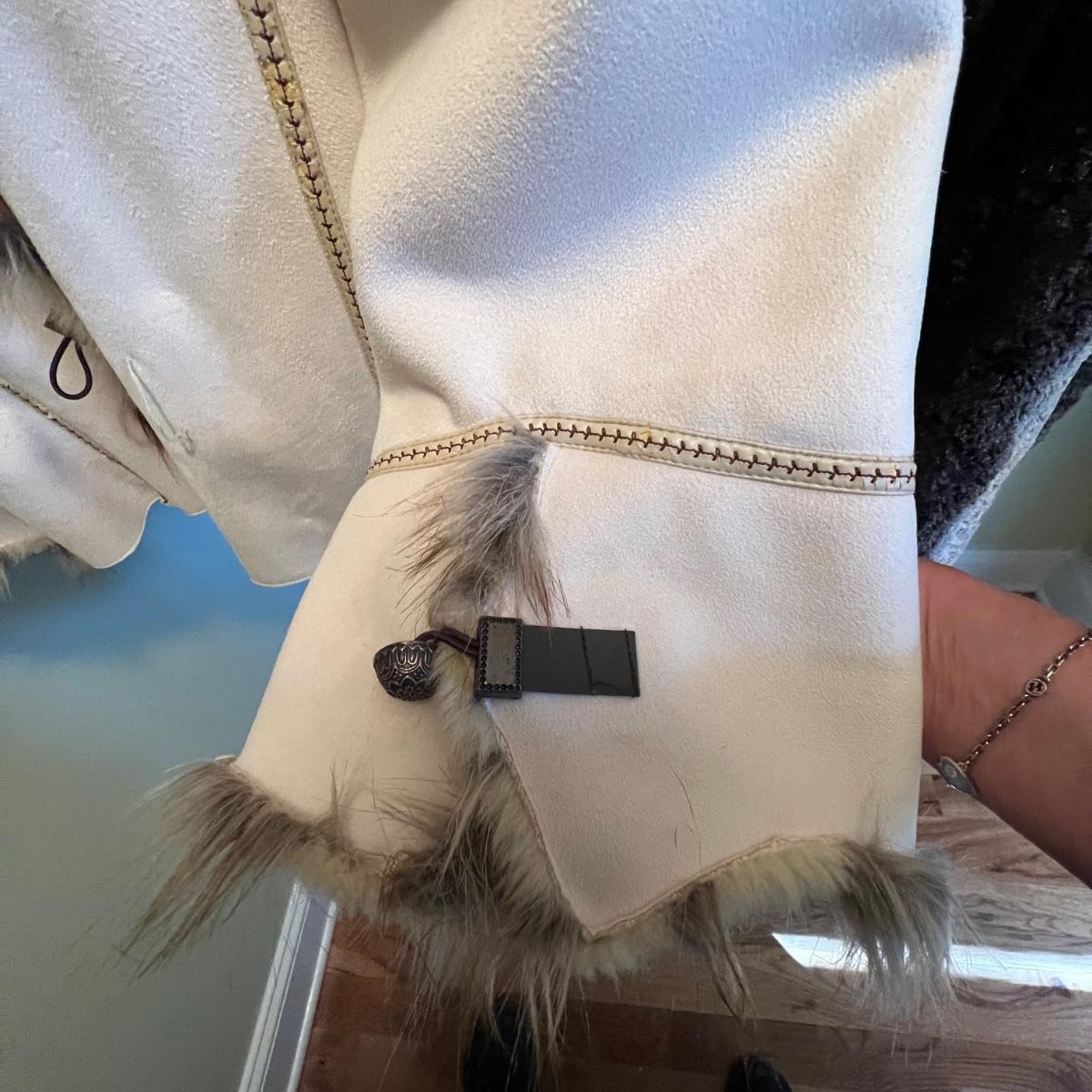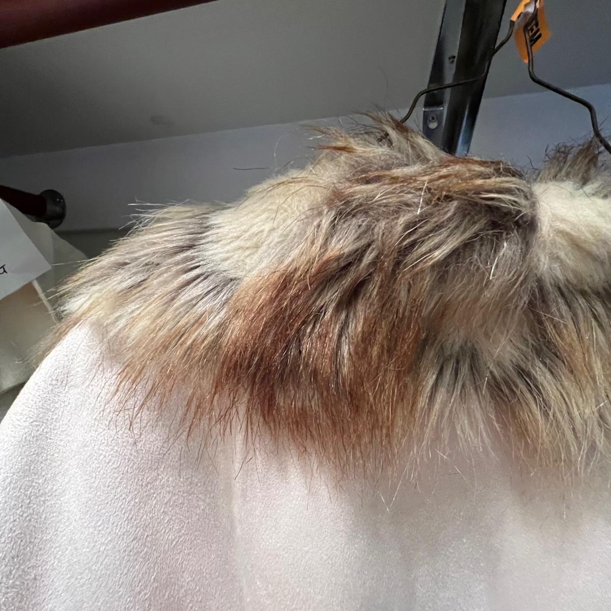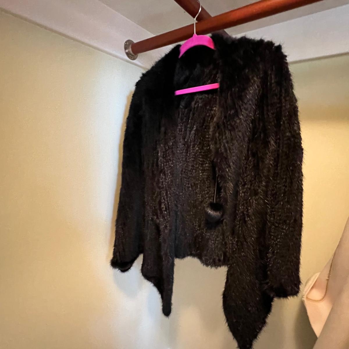 A sheerling style camel colored coat with faux fur collar and an ankle length faux fur sleeveless jacket are by Donna Salyer’s Fabulous Furs and are both size 2X. Note the sheerling jacket is missing a button. Lot also includes a super soft black poncho and long gray scarf, both have no labels.
