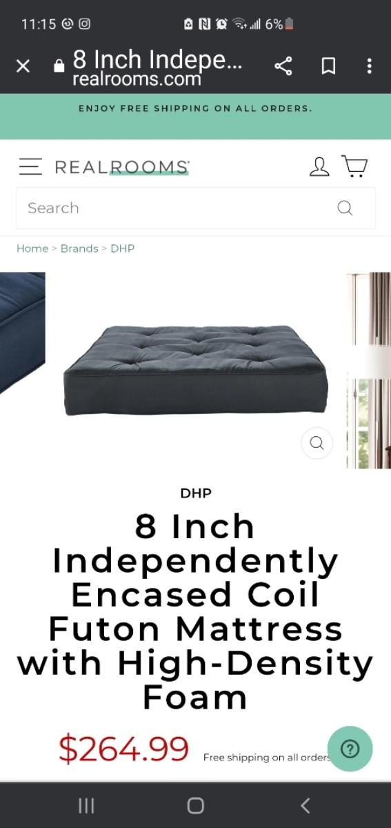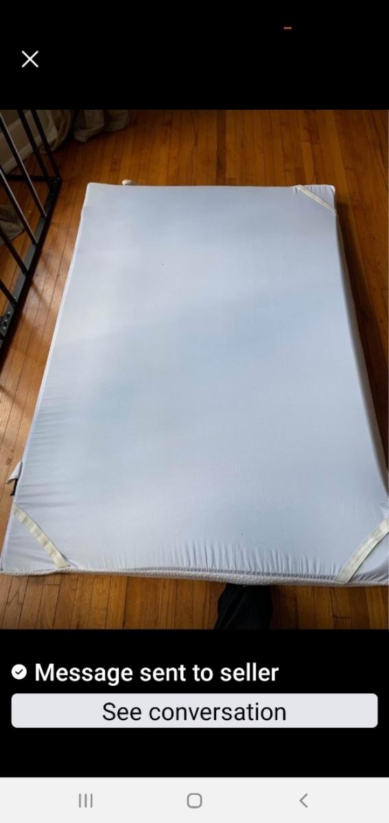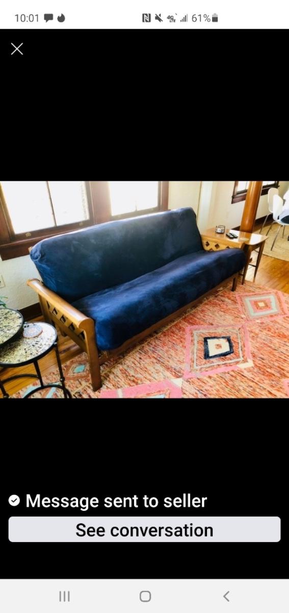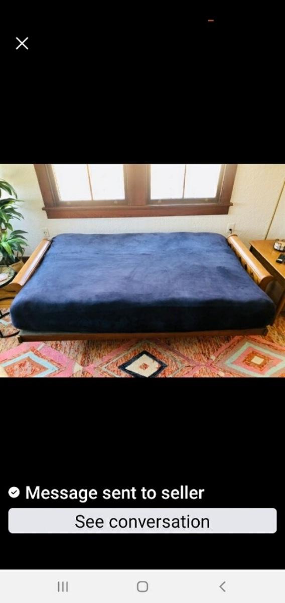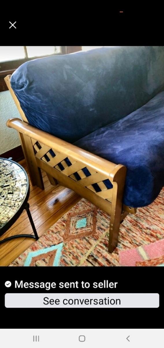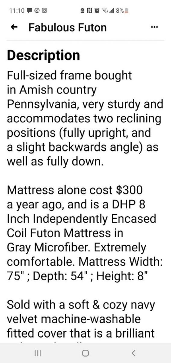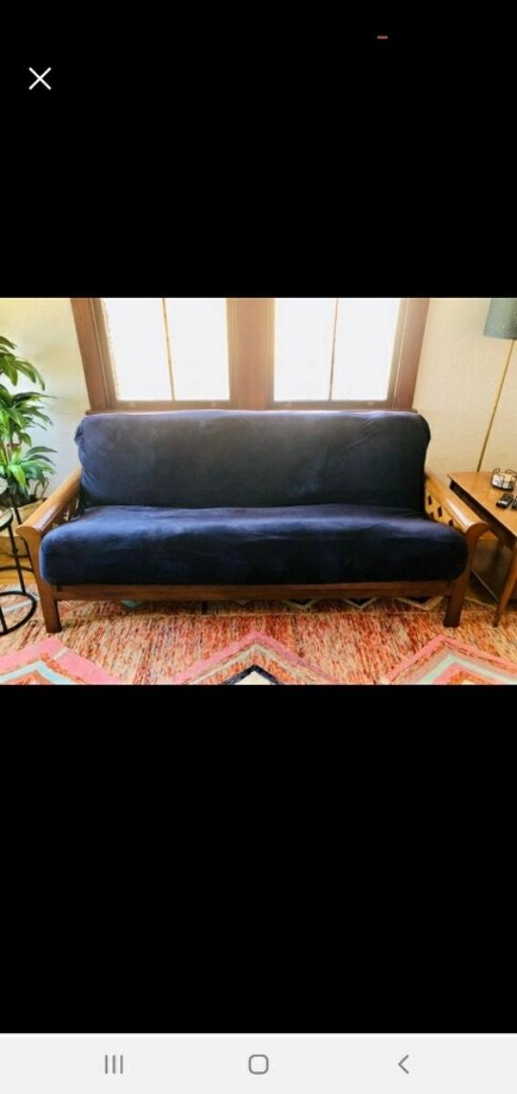Fabulous futon - bought in Amish country, very comfortable with an 8” memory foam mattress and a memory foam mattress pad that is removable. Has a velvet navy blue washable fitted cover. Two reclining positions, and fully down. MUST BRING HELP TO MOVE DOWN STAIRS!