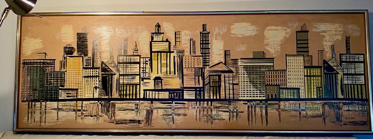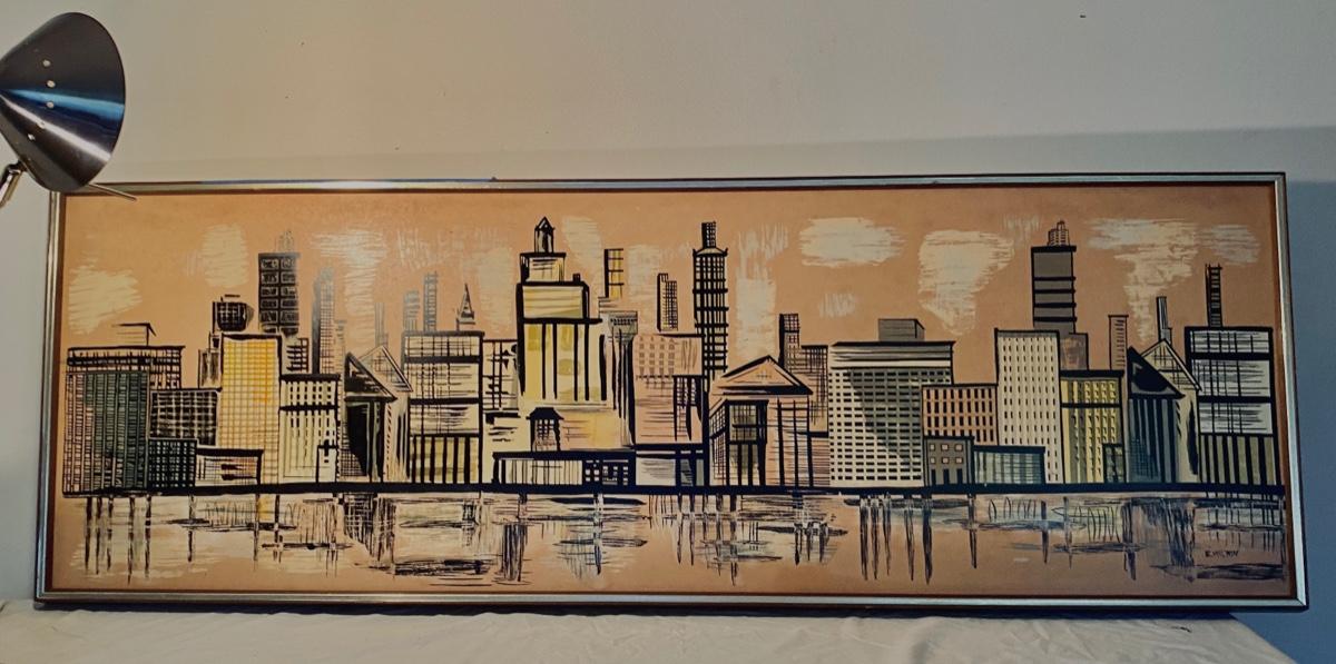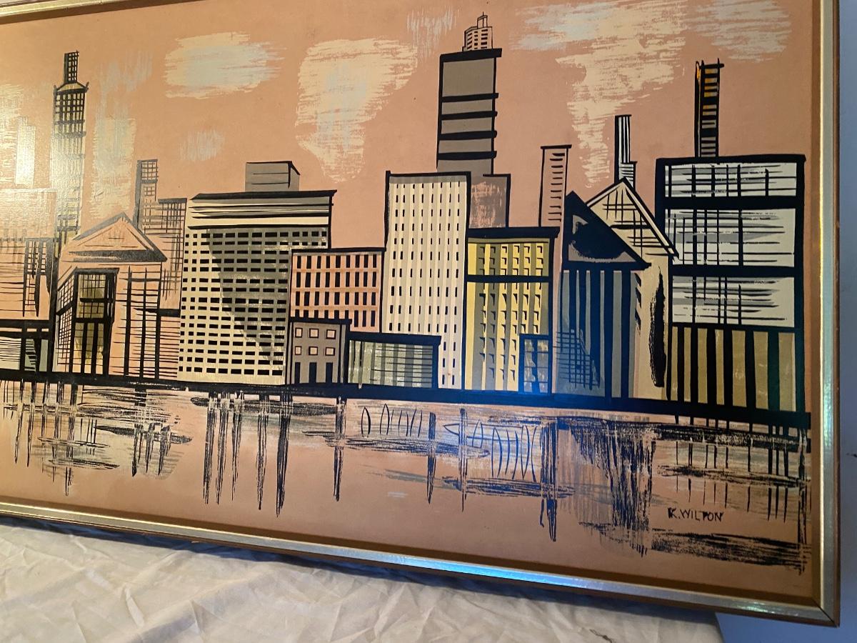 Such a fabulous over 5ft long 1950s wall art . Printed by Turner Wall Accessories, signed K. Wilton features fabulous modernist NYC skyline.. Measures 61” long, 22” high. Wood frame with chrome edge as shown. Excellent condition.
