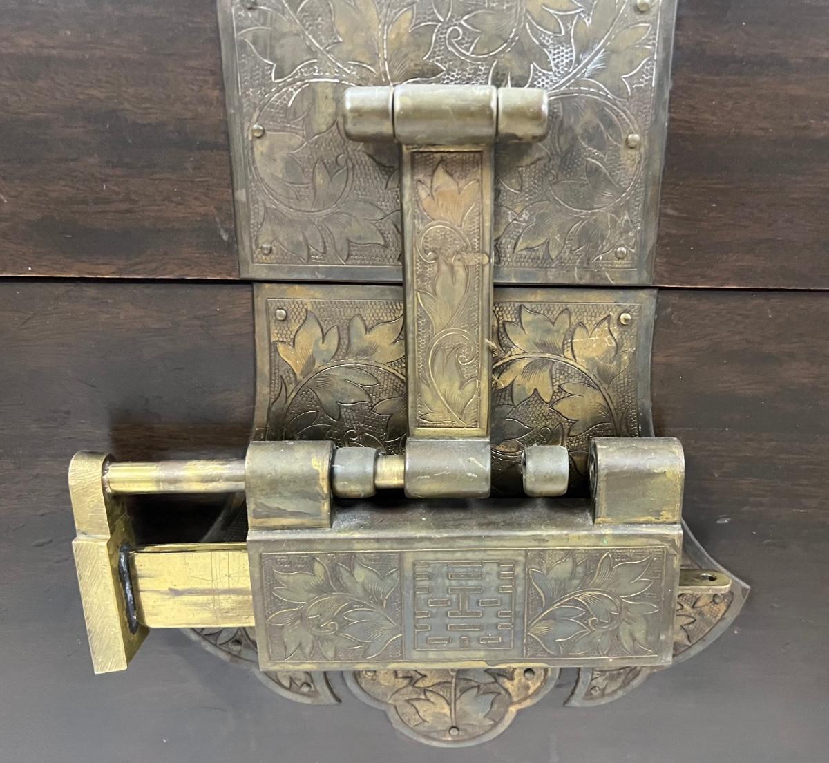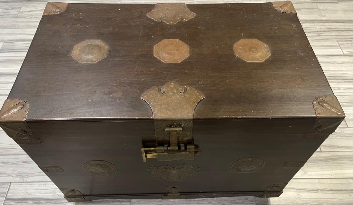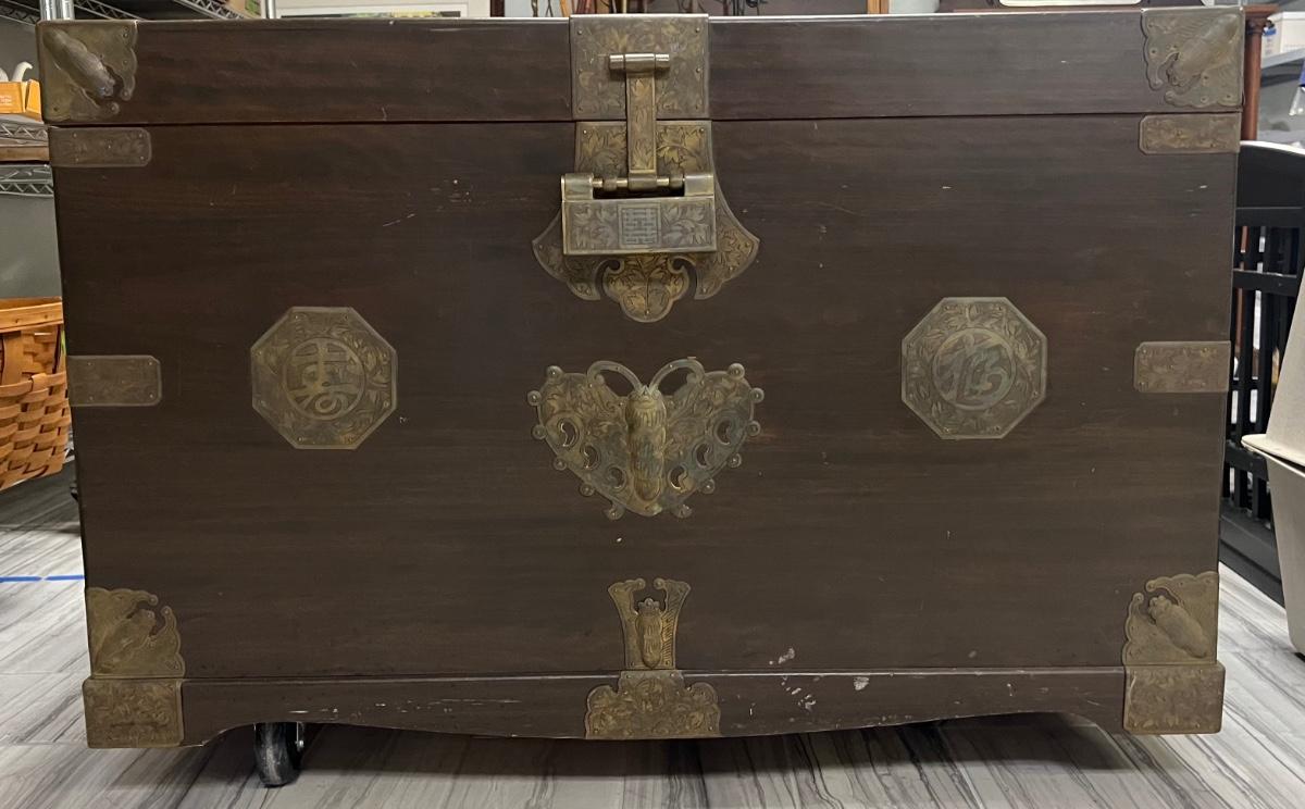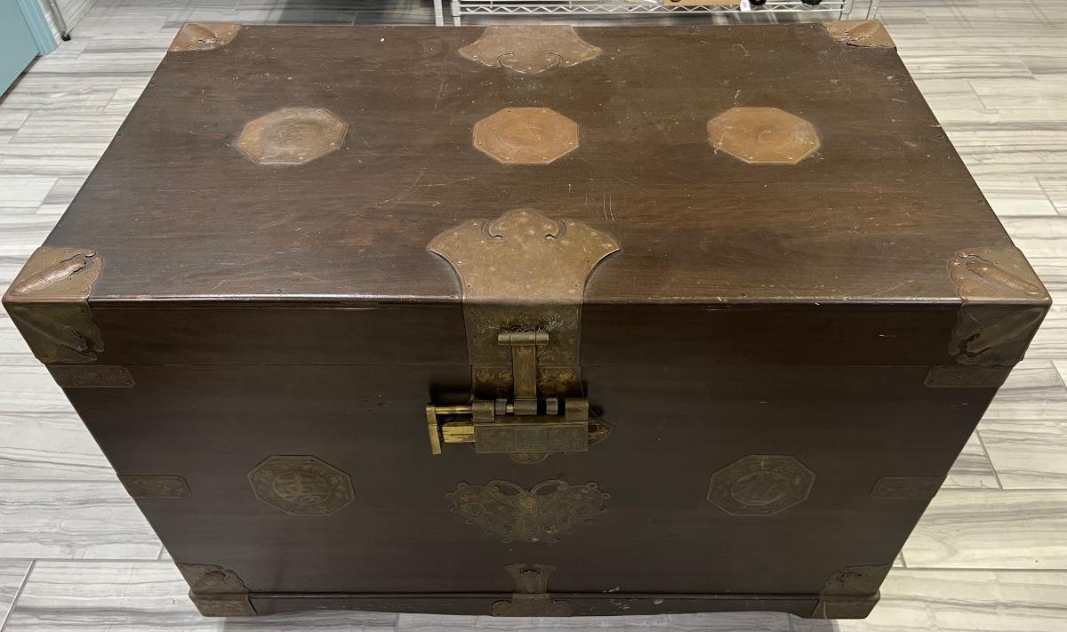 This has highly ornate copper accents. The inner tray is intact. The lock is in working order. Includes key. Age related wear. Does not include furniture dollies. Measurement: 38"W x 23"D x 26"H. [LA]