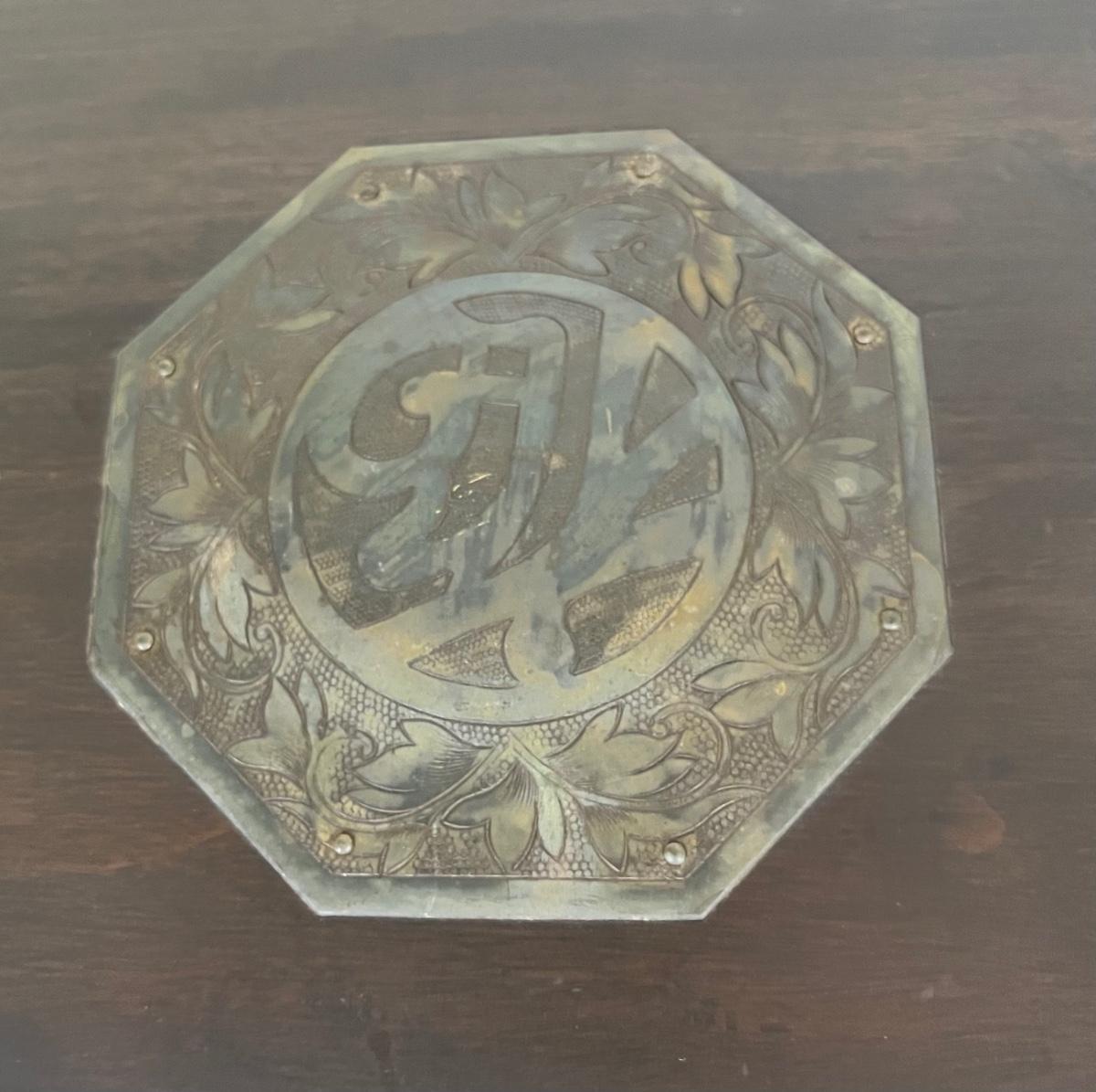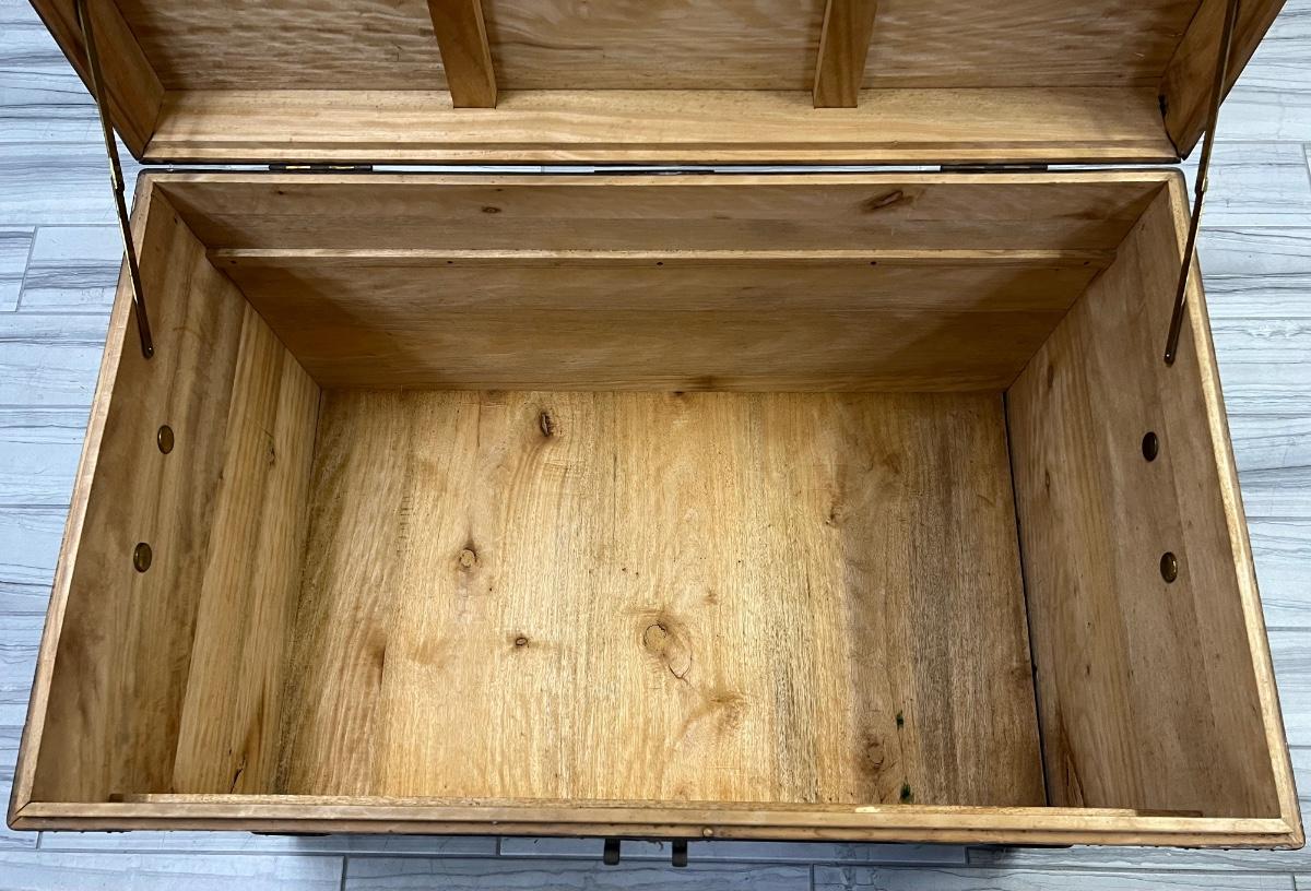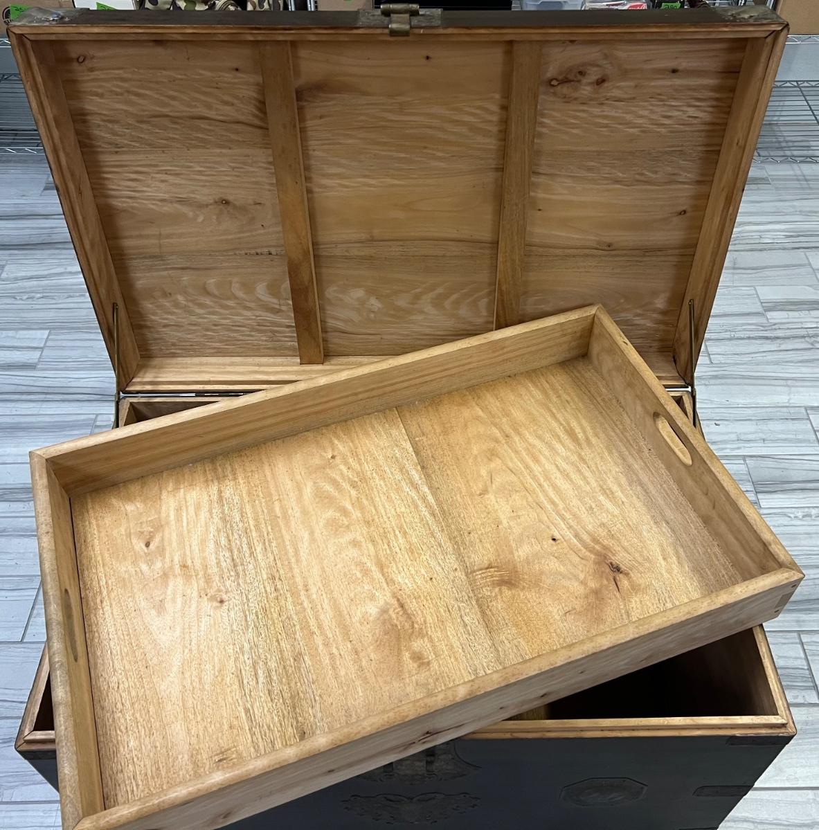 This has highly ornate copper accents. The inner tray is intact. The lock is in working order. Includes key. Age related wear. Does not include furniture dollies. Measurement: 38"W x 23"D x 26"H. [LA]