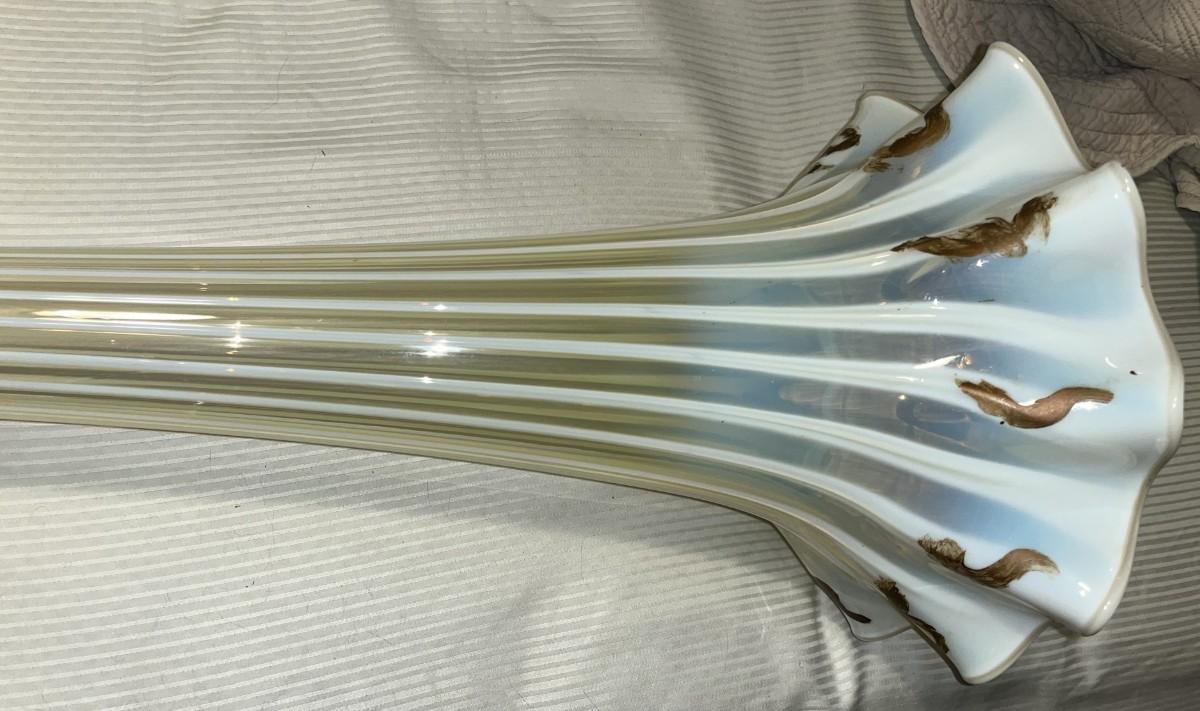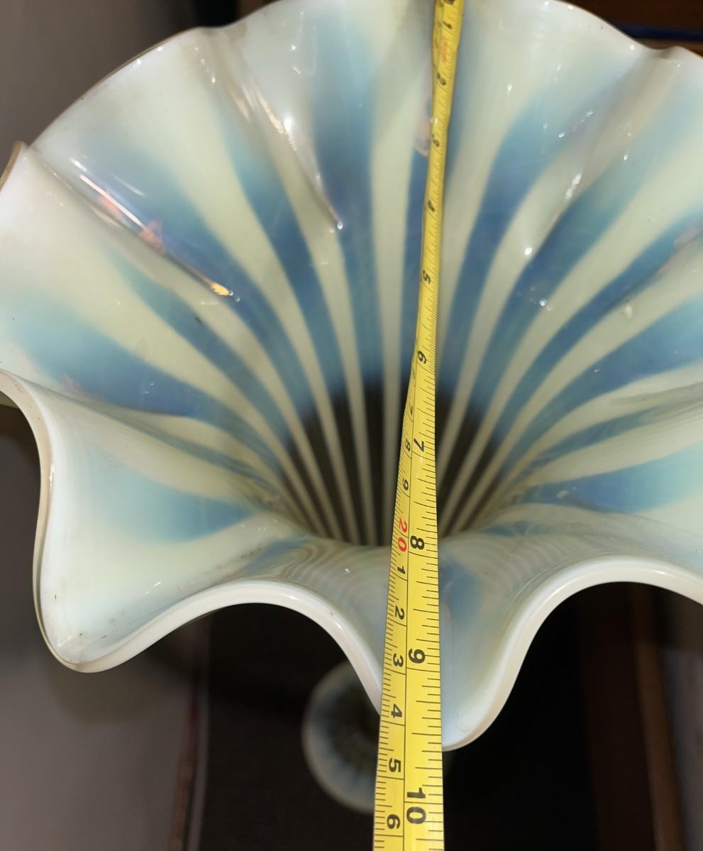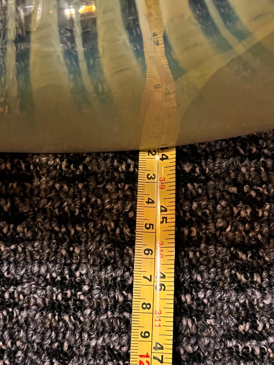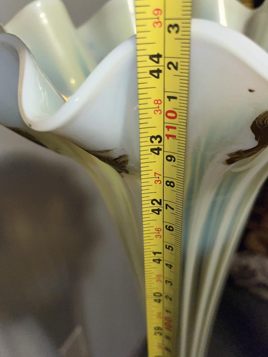 I've never seen one this tall before or since this one ! It is just over 44" tall. Base is 9 1/2" diameter .The fluted opening at the top is also 9 1/2" diameter . Looks to me like someone reinforced the base with tape, painted that and then added painted "swirls" at the top. I do not see any damage , NO chips No splits No cracks . This item can be shipped if the winner informs me, pays for the shipping and MUST INSURE it. Domestic shipping only on this one .