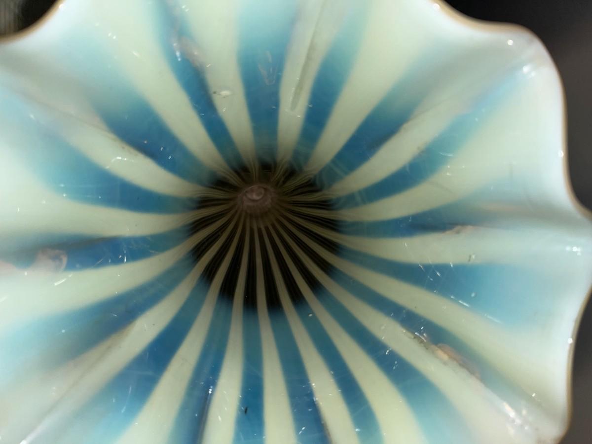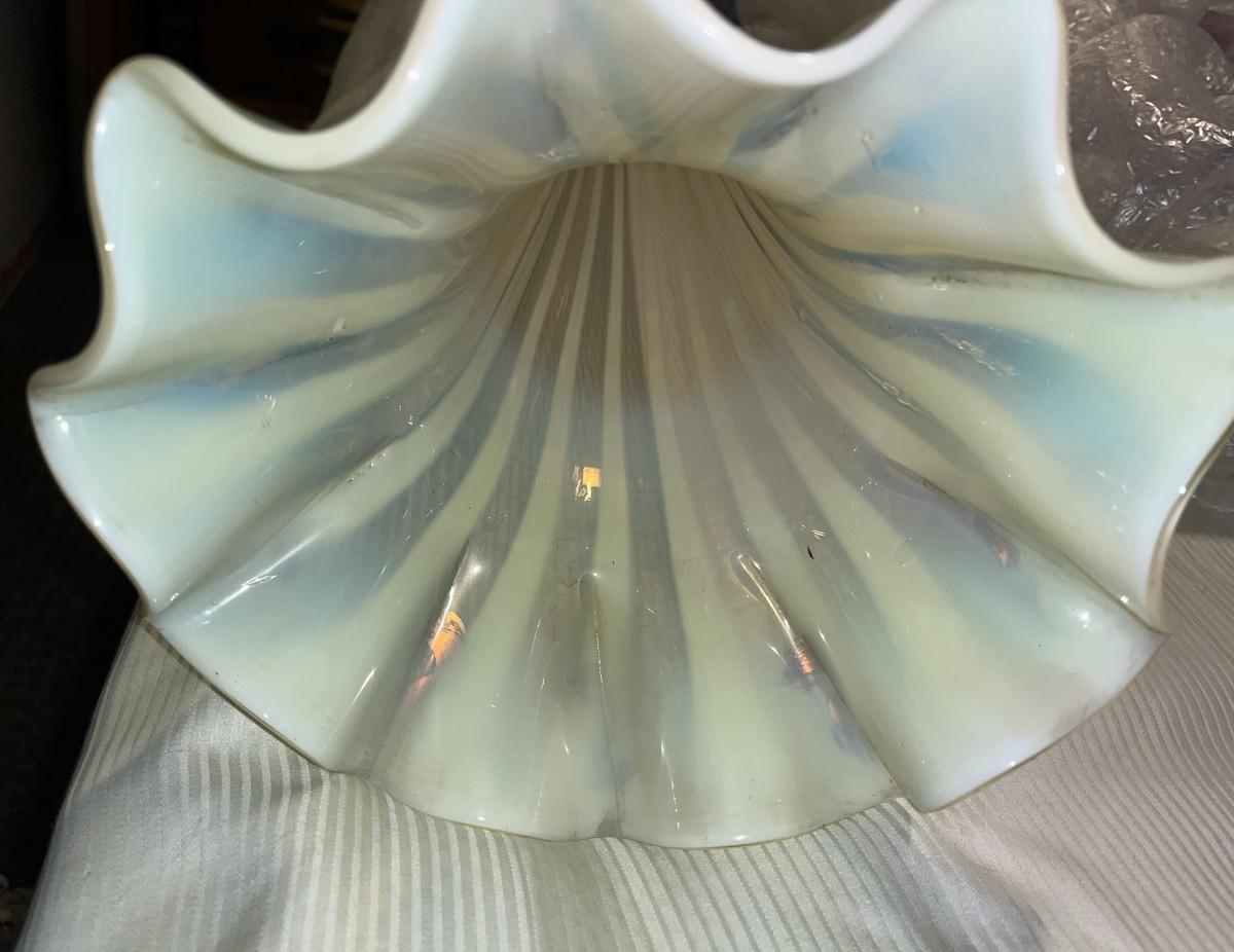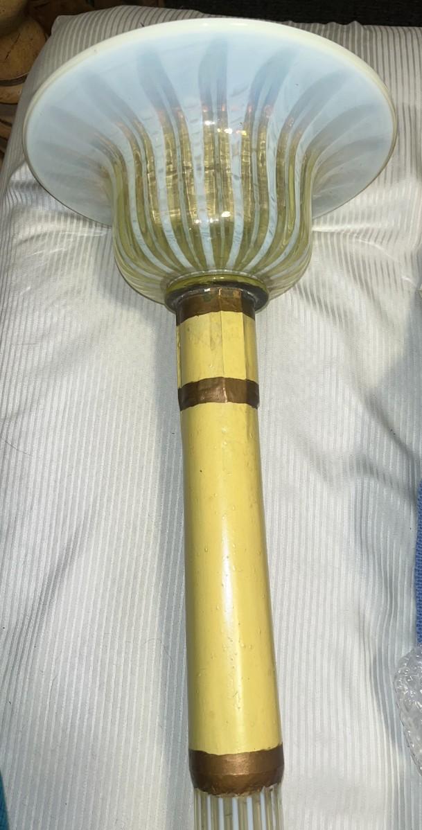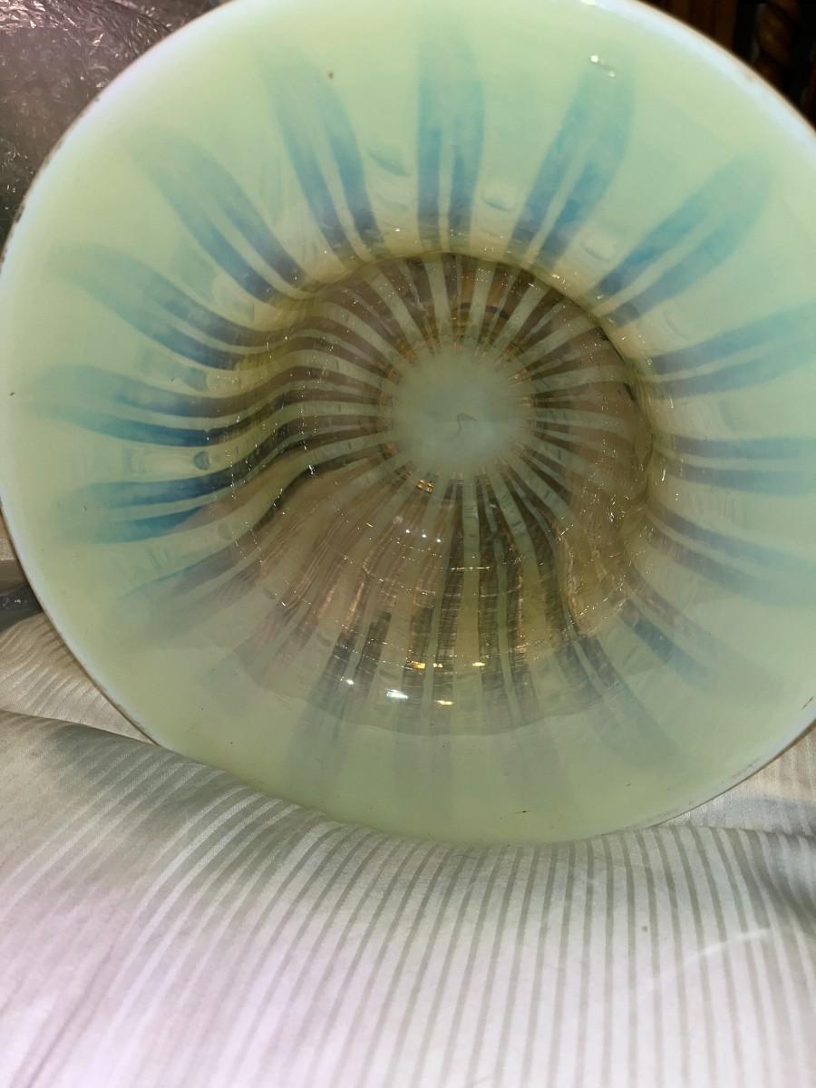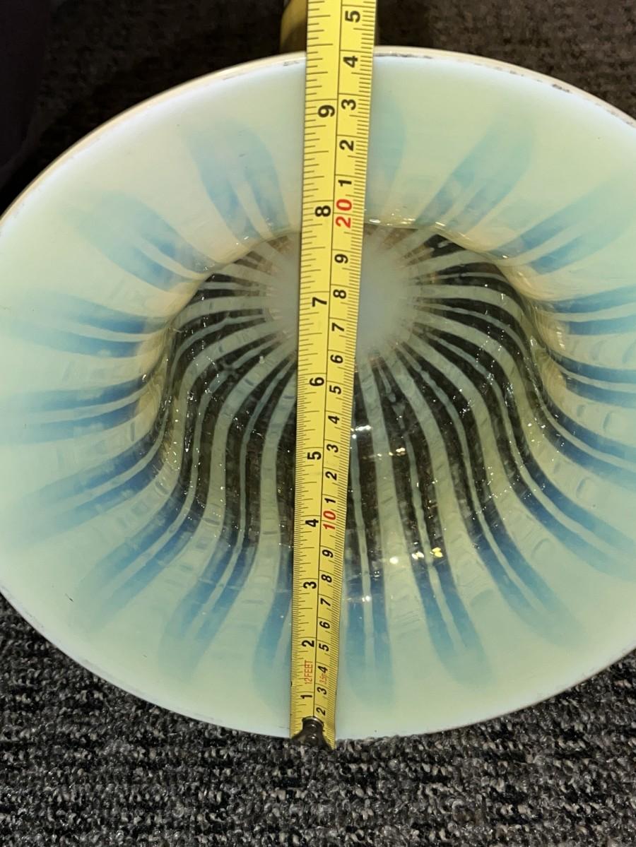 I've never seen one this tall before or since this one ! It is just over 44" tall. Base is 9 1/2" diameter .The fluted opening at the top is also 9 1/2" diameter . Looks to me like someone reinforced the base with tape, painted that and then added painted "swirls" at the top. I do not see any damage , NO chips No splits No cracks . This item can be shipped if the winner informs me, pays for the shipping and MUST INSURE it. Domestic shipping only on this one .