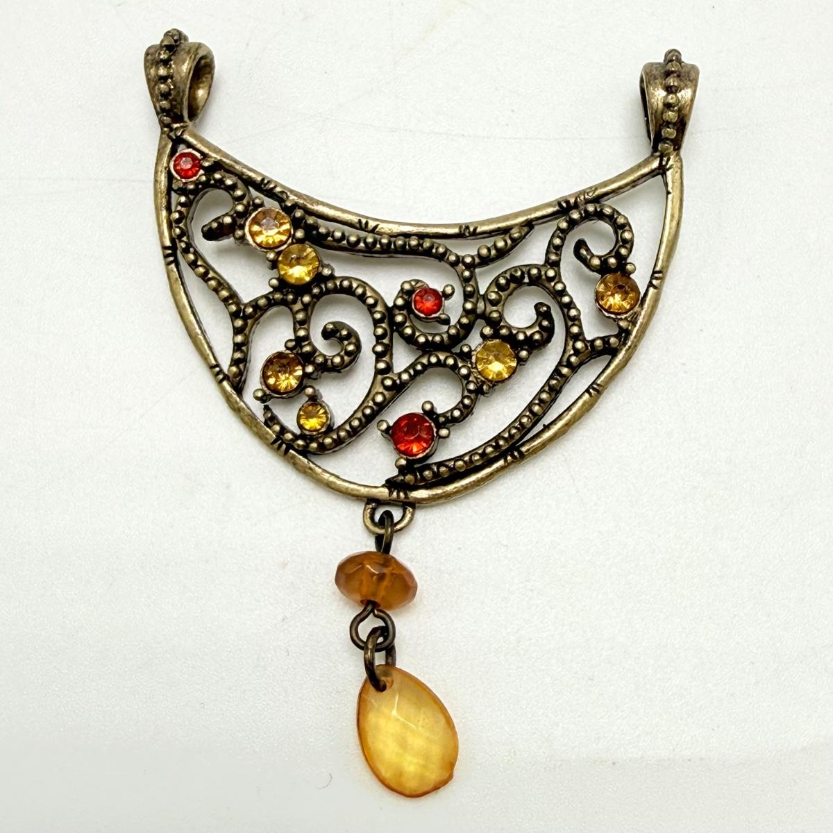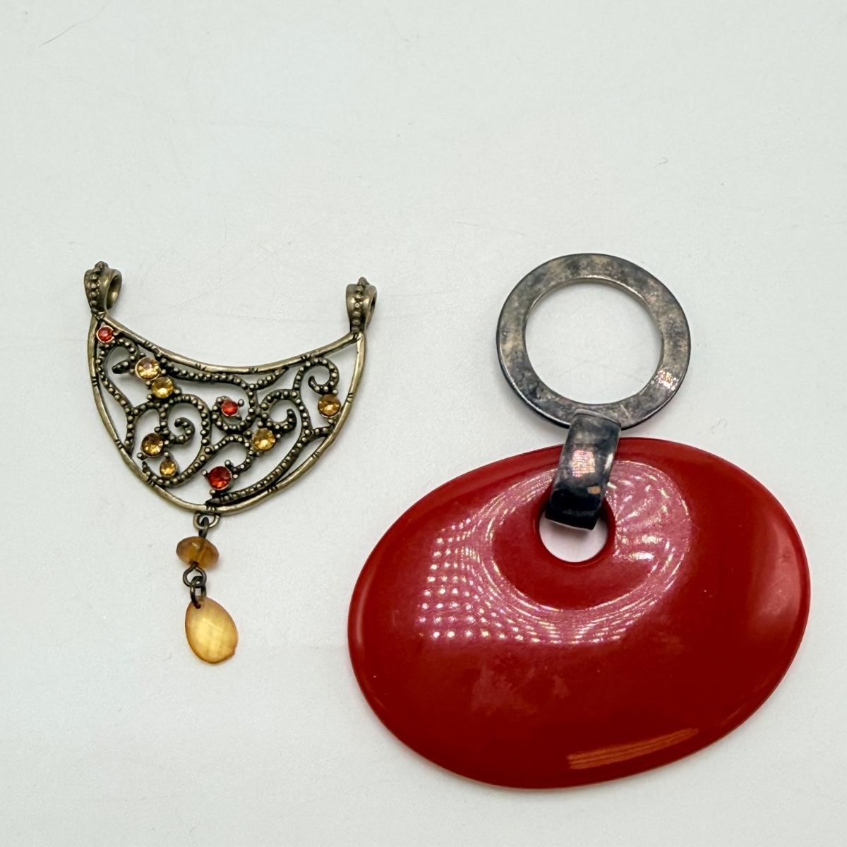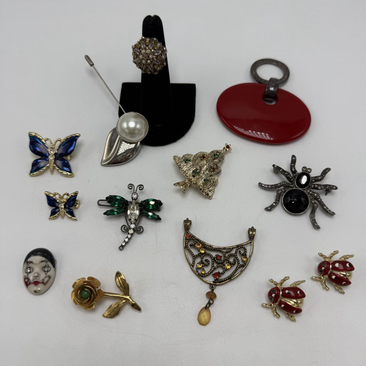 Ten fun and fabulous brooches, two pendants, and a ring. The stick style brooch is marked ‘Ferragamo’ and is about 3.5“ long. The ring is adjustable in size. Please see photos for inventory and details.