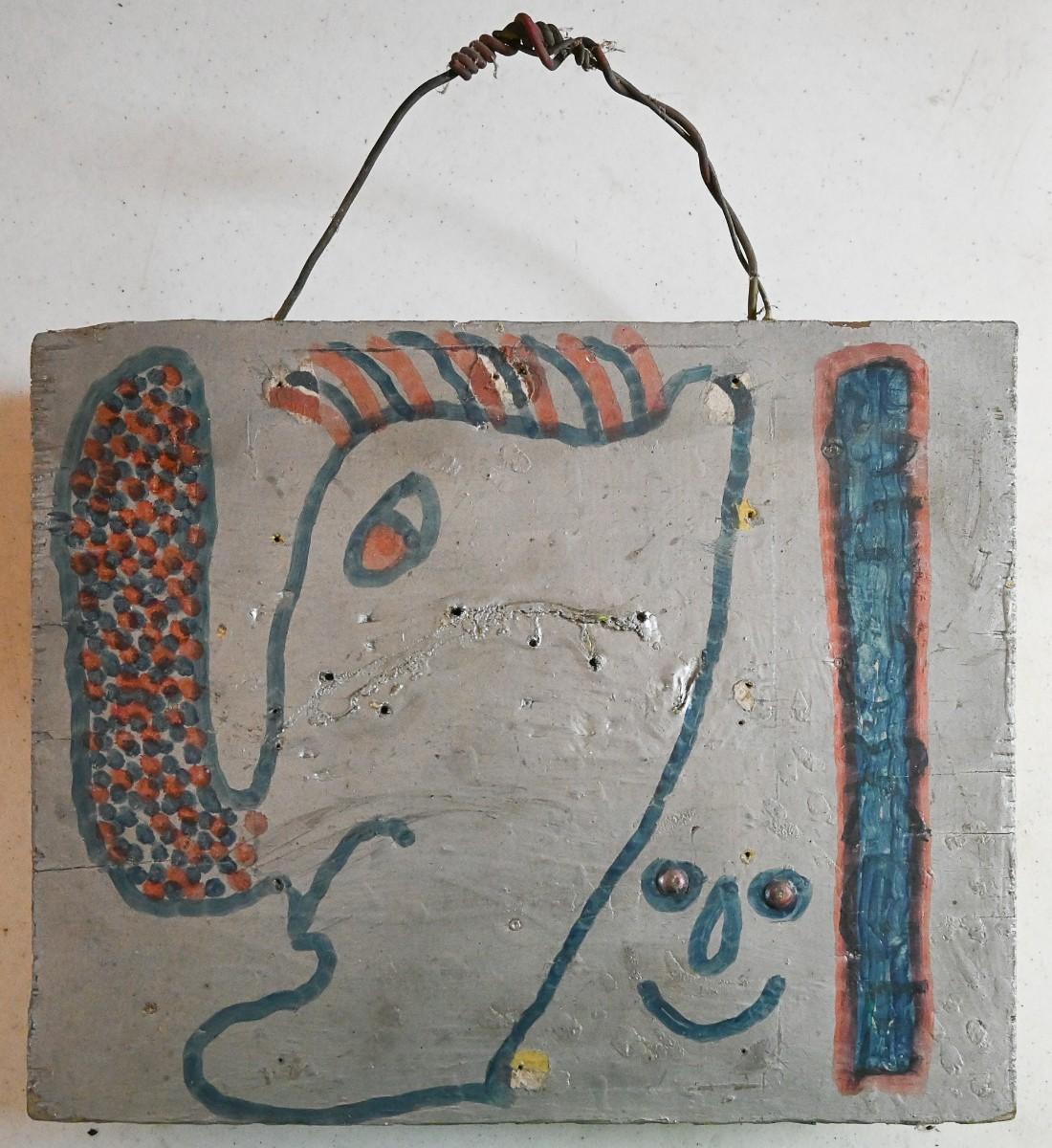 A face painted on boards by Michigan artist Albert “‹“Kid” Mertz. Mixed media. Approx. 11" x 13.5" x 3". Please note, listed dimensions does not include the wire hanger.