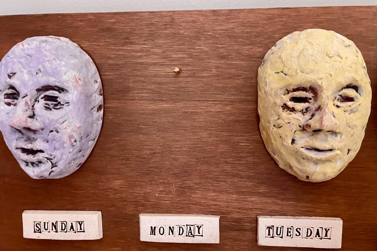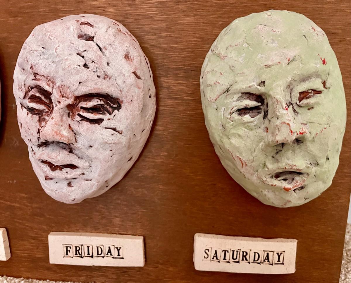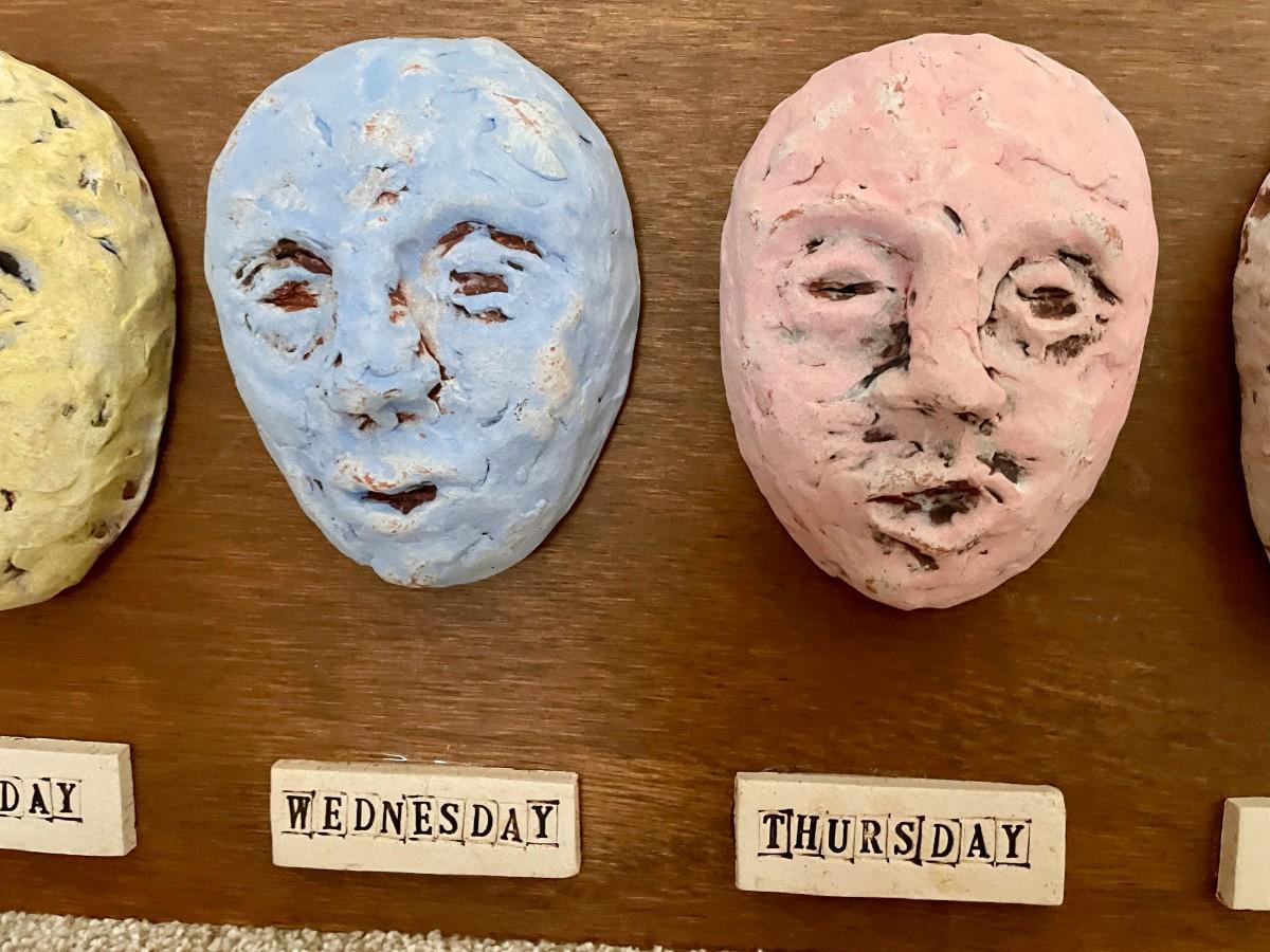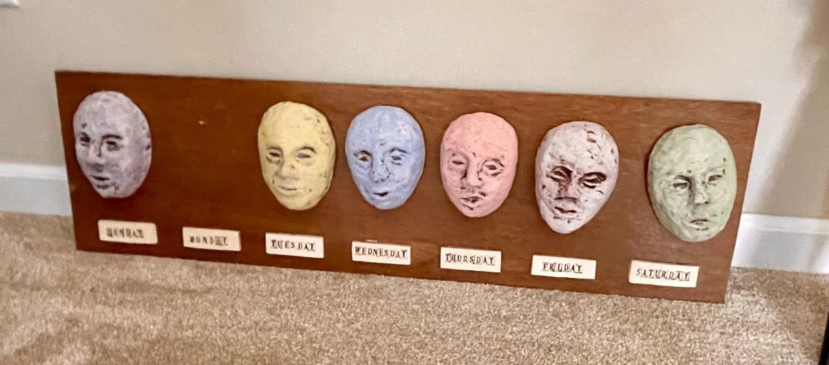 Very Unique! Move the Faces for the Days of the Week! Clay Faces on Wood Board. 32x.9.5