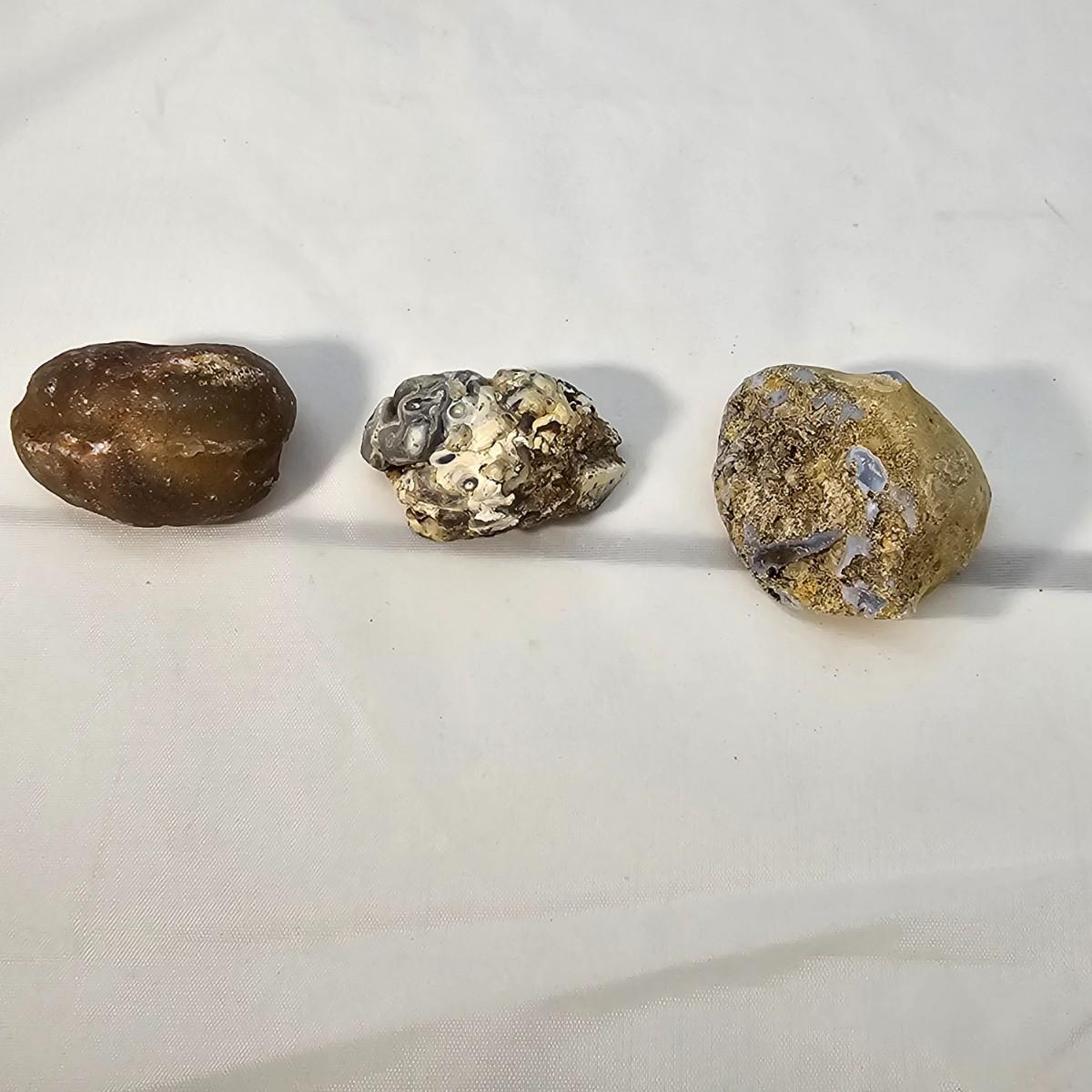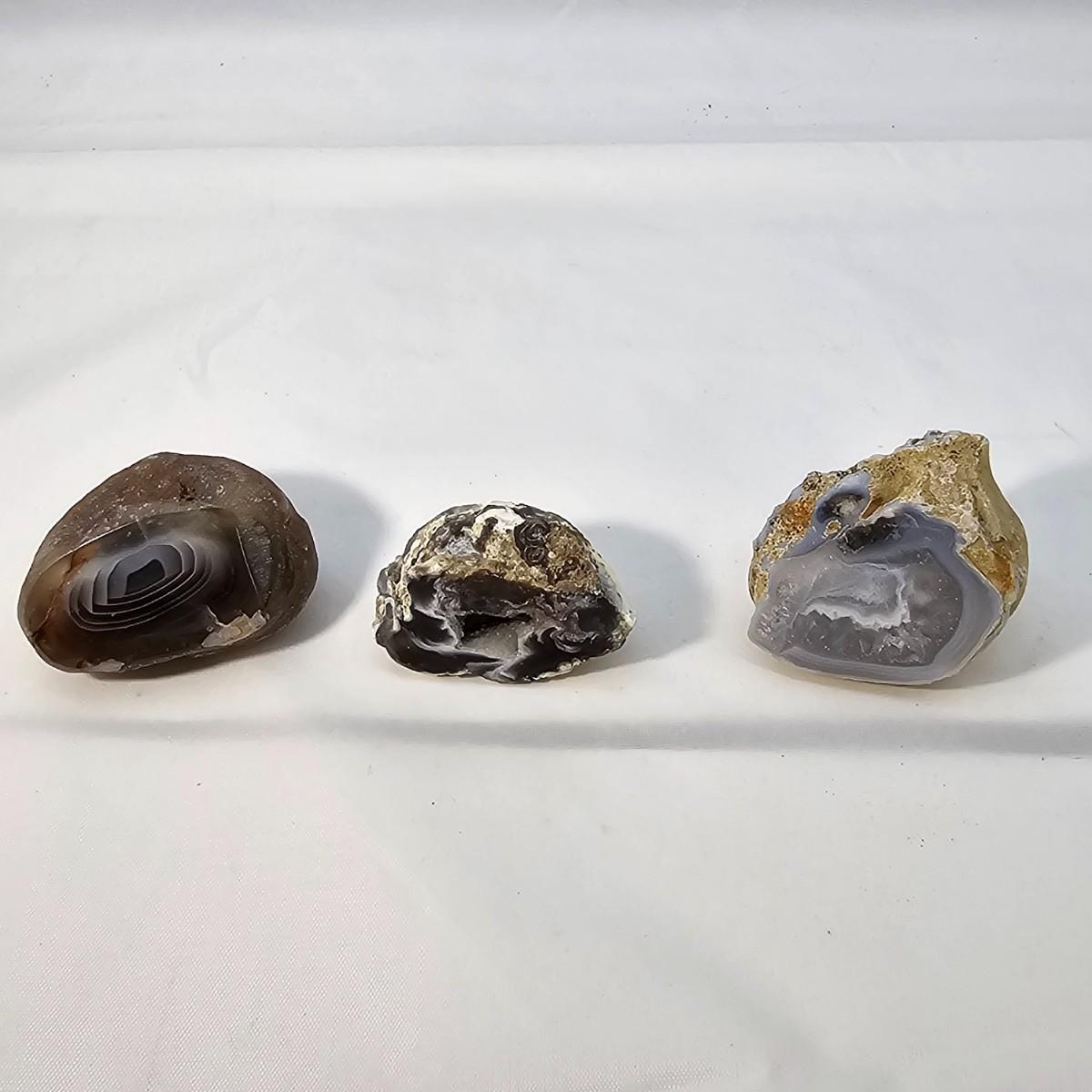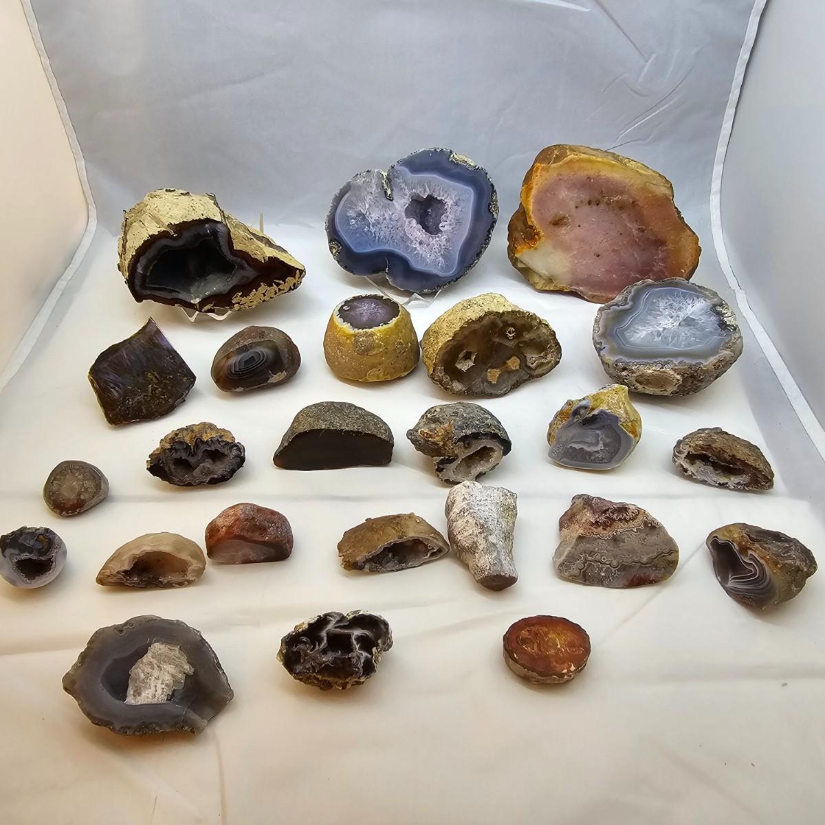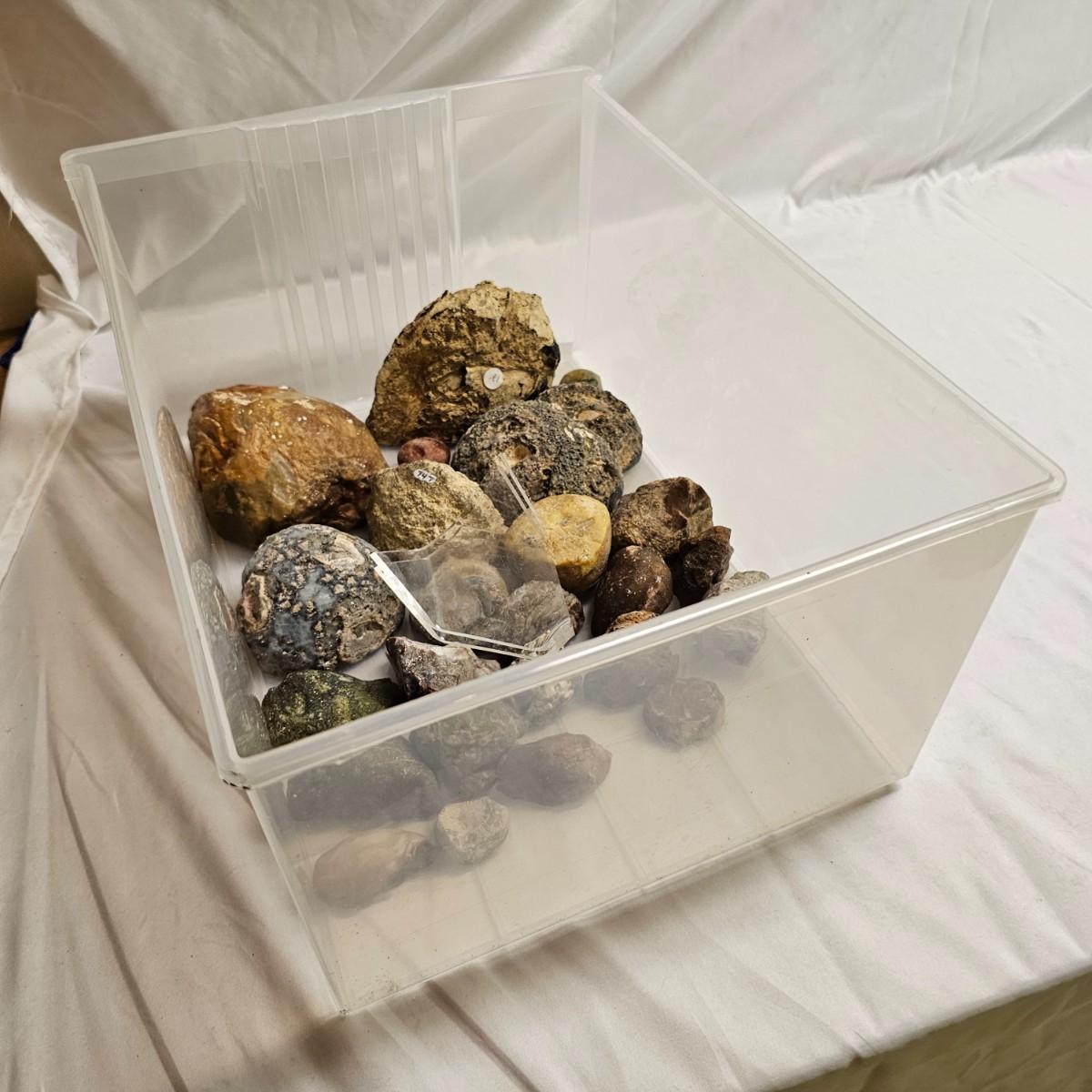 All of these pieces have been cut and polished on one side only, just a face look at the beauty within. Hard shell matrix on the outside, these appear to be agates and nodules. Some display areas are only an inch or so, to take advantage of the natural beauty of the stone. The largest piece is 5" x 3" x 4"H, smallest is about 1" all around. Stands and bin included. See photos for details. Shipping available. Please note that any price tag seen on an item was not put there by Sterling Transitions and does not reflect the current value of the item. All sales are final. No returns or refunds. Please bid accordingly.