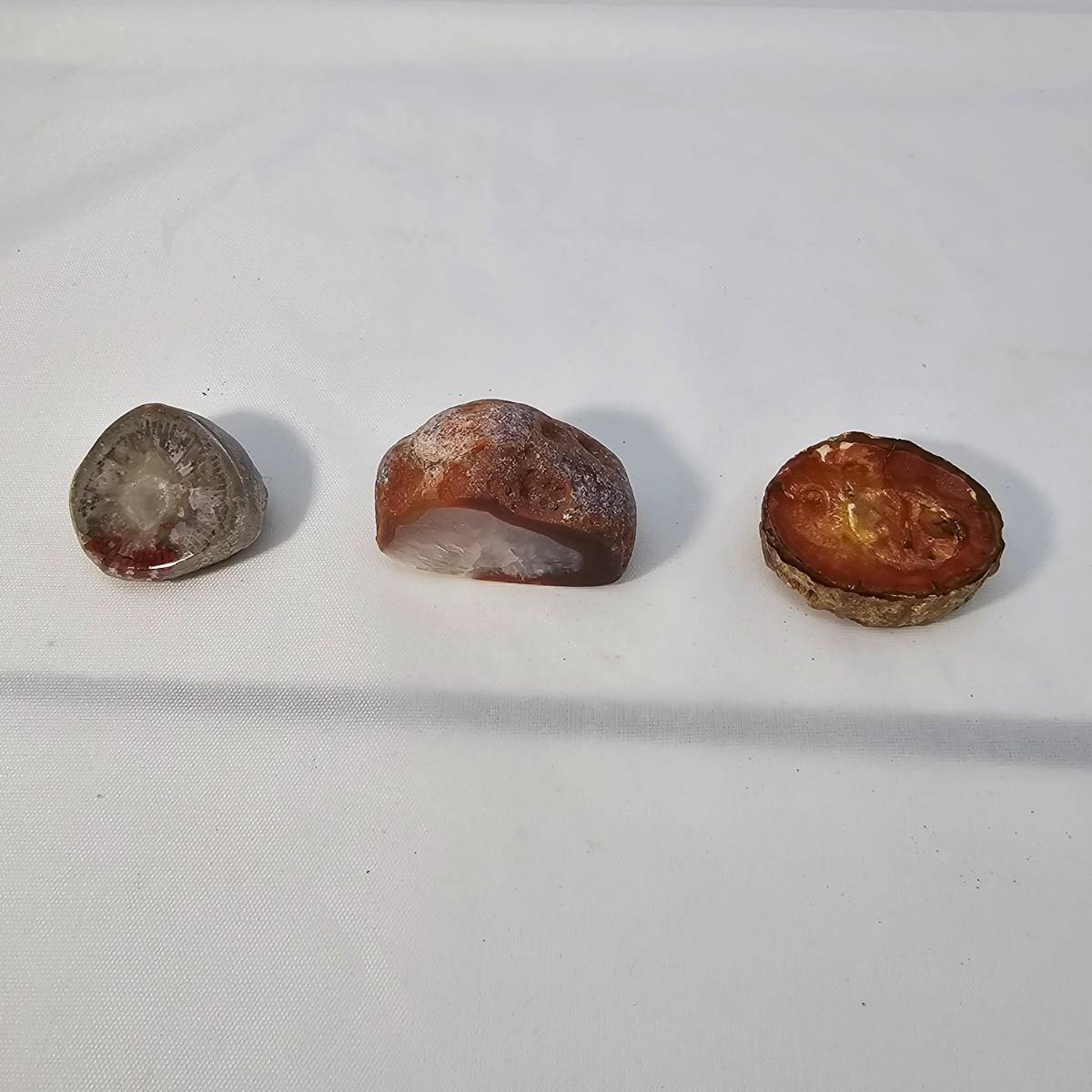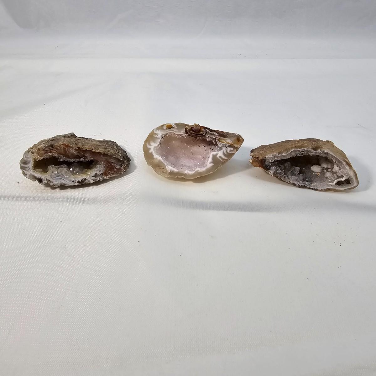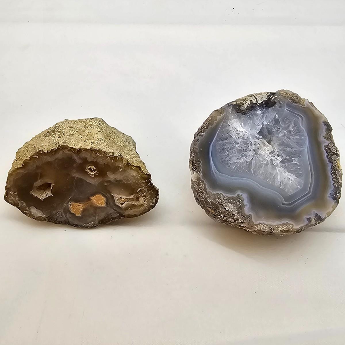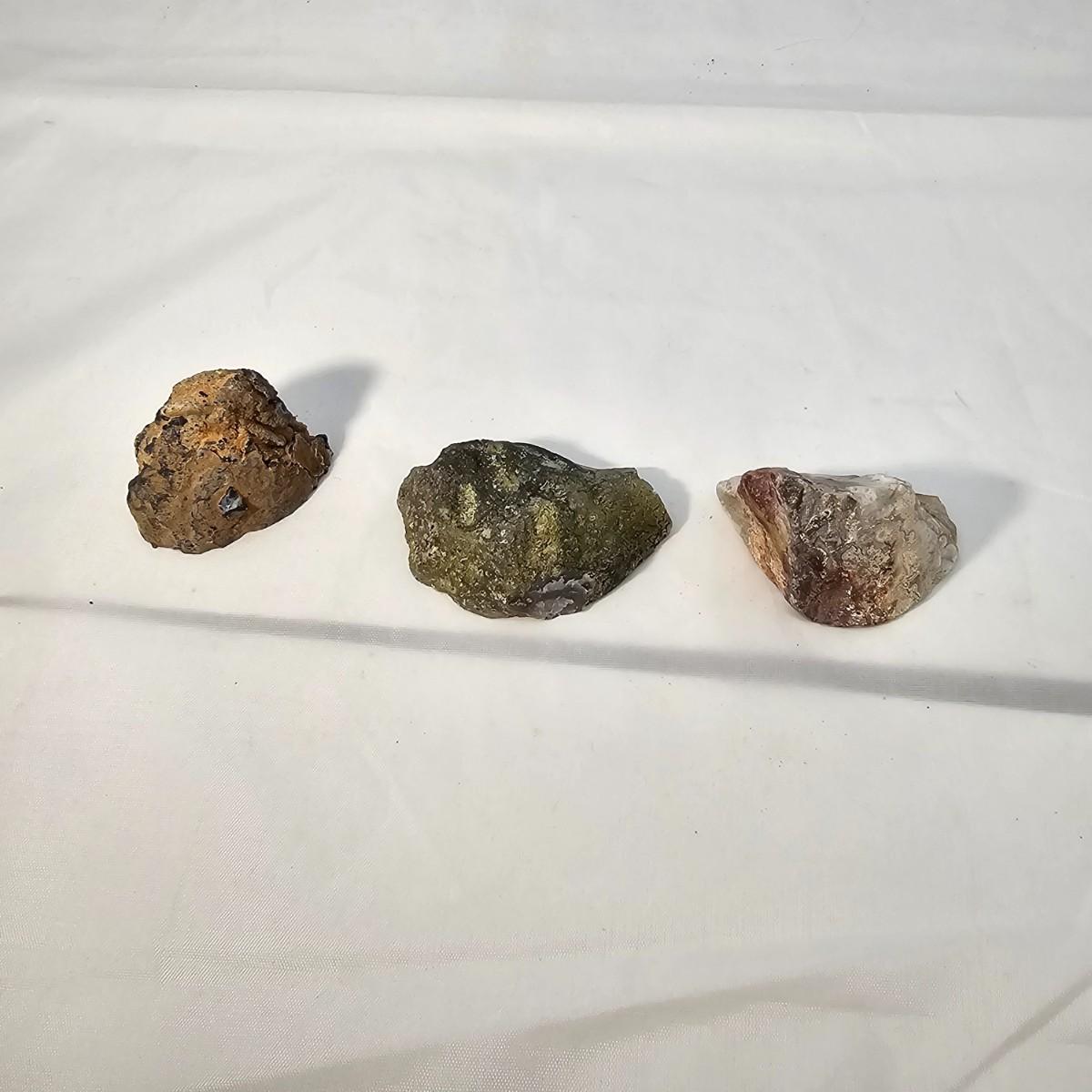 All of these pieces have been cut and polished on one side only, just a face look at the beauty within. Hard shell matrix on the outside, these appear to be agates and nodules. Some display areas are only an inch or so, to take advantage of the natural beauty of the stone. The largest piece is 5" x 3" x 4"H, smallest is about 1" all around. Stands and bin included. See photos for details. Shipping available. Please note that any price tag seen on an item was not put there by Sterling Transitions and does not reflect the current value of the item. All sales are final. No returns or refunds. Please bid accordingly.