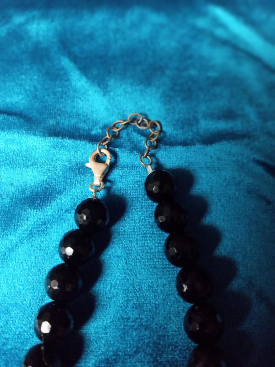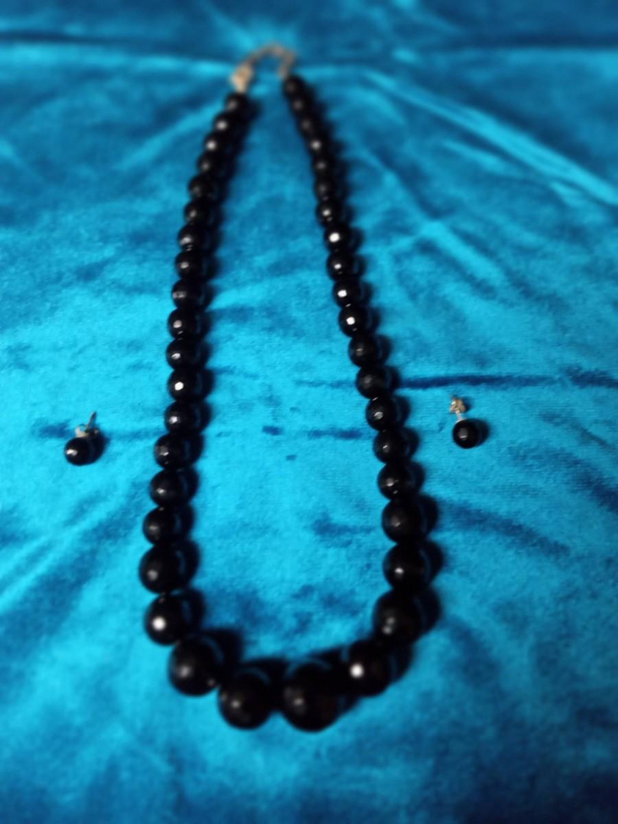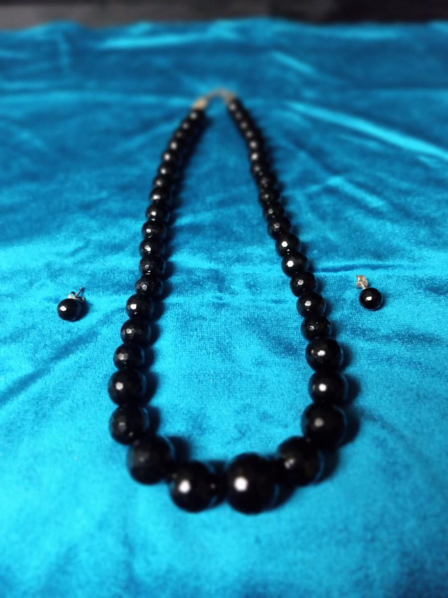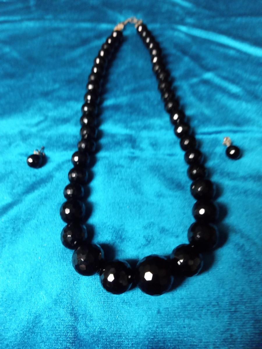 FACETED BLACK GLASS BEADED NECKLACE AND EARRINGS W/STERLING CLASP/POSTS