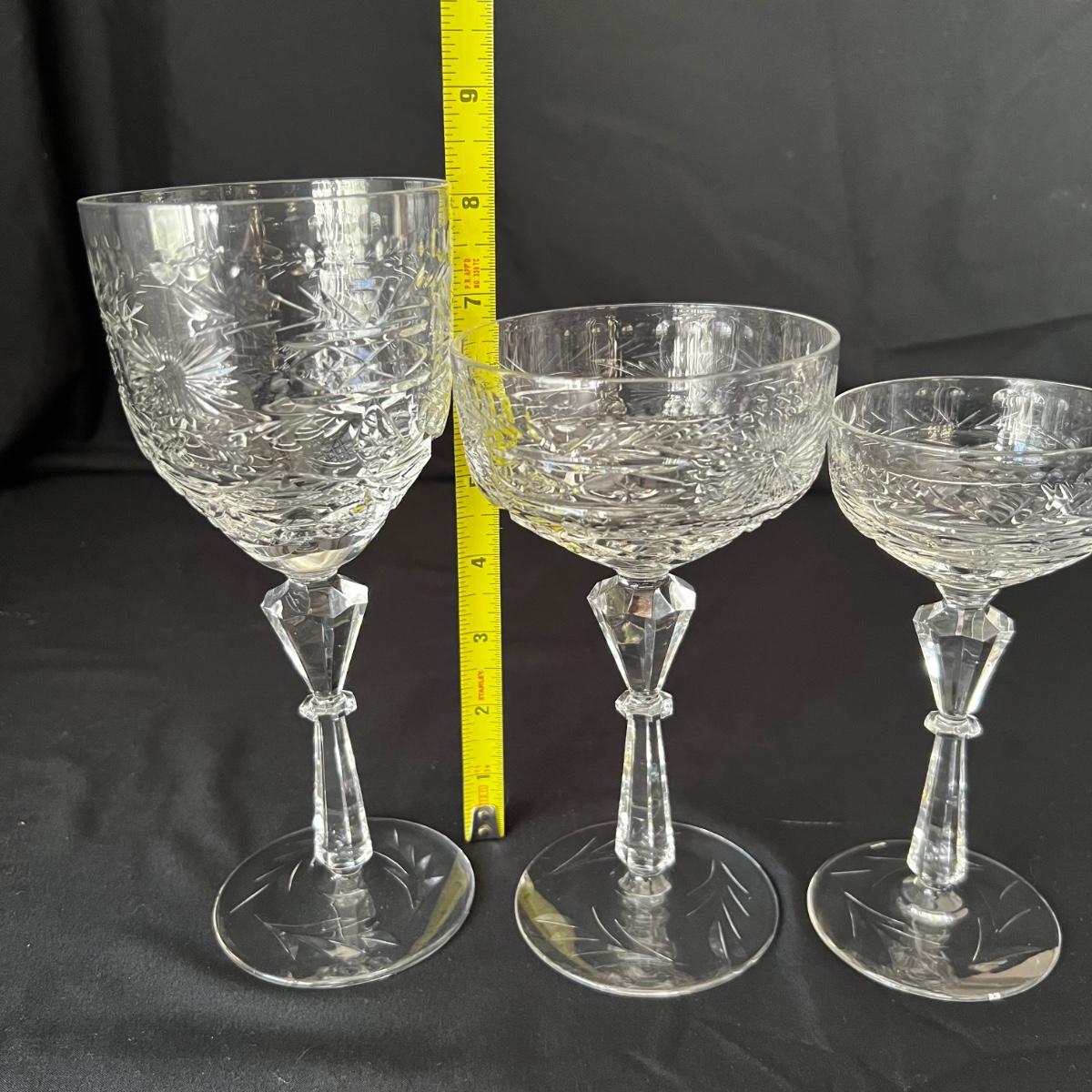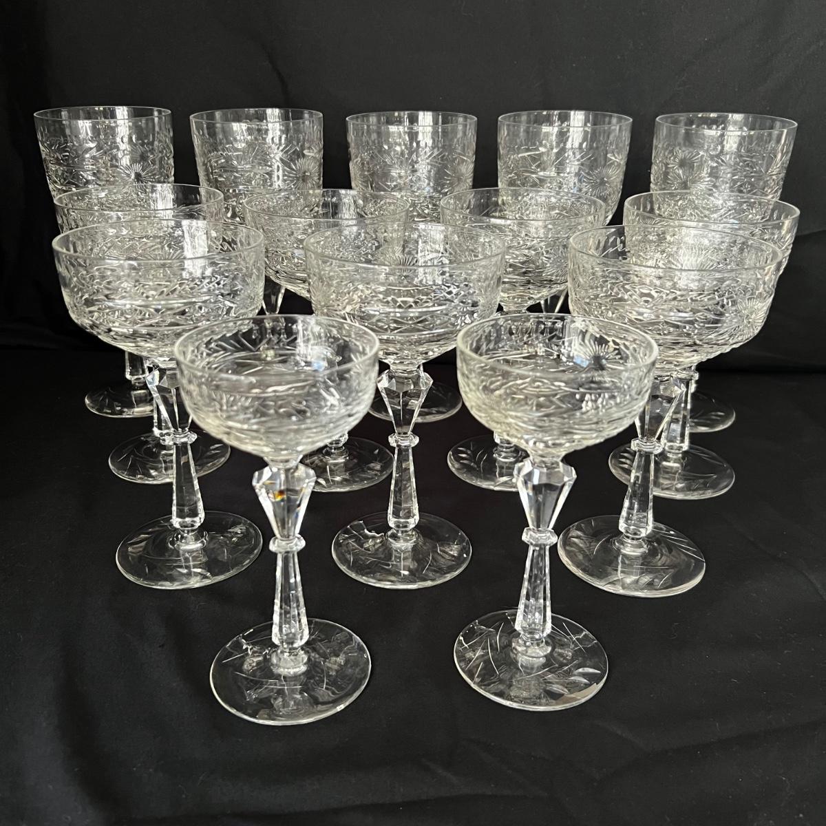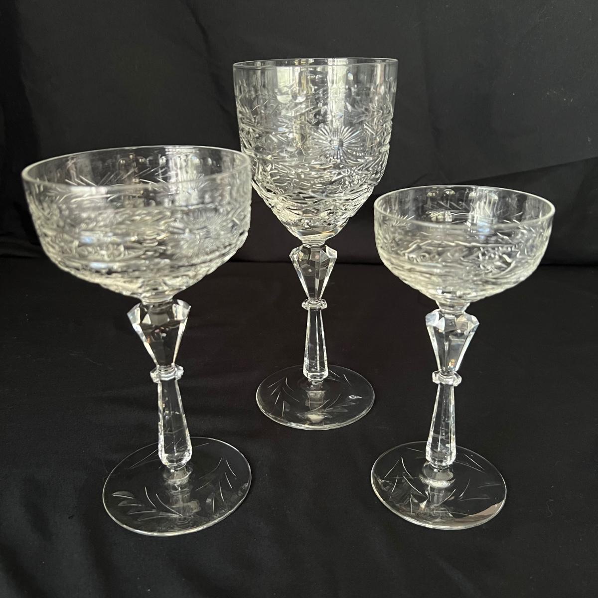 Beautiful set of etched glasses featuring a sunburst and hatch design. All have faceted stems. Five red wine, seven champagne/cocktail glasses plus a smaller pair that match the seven in shape.