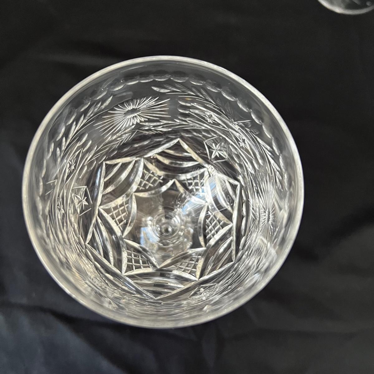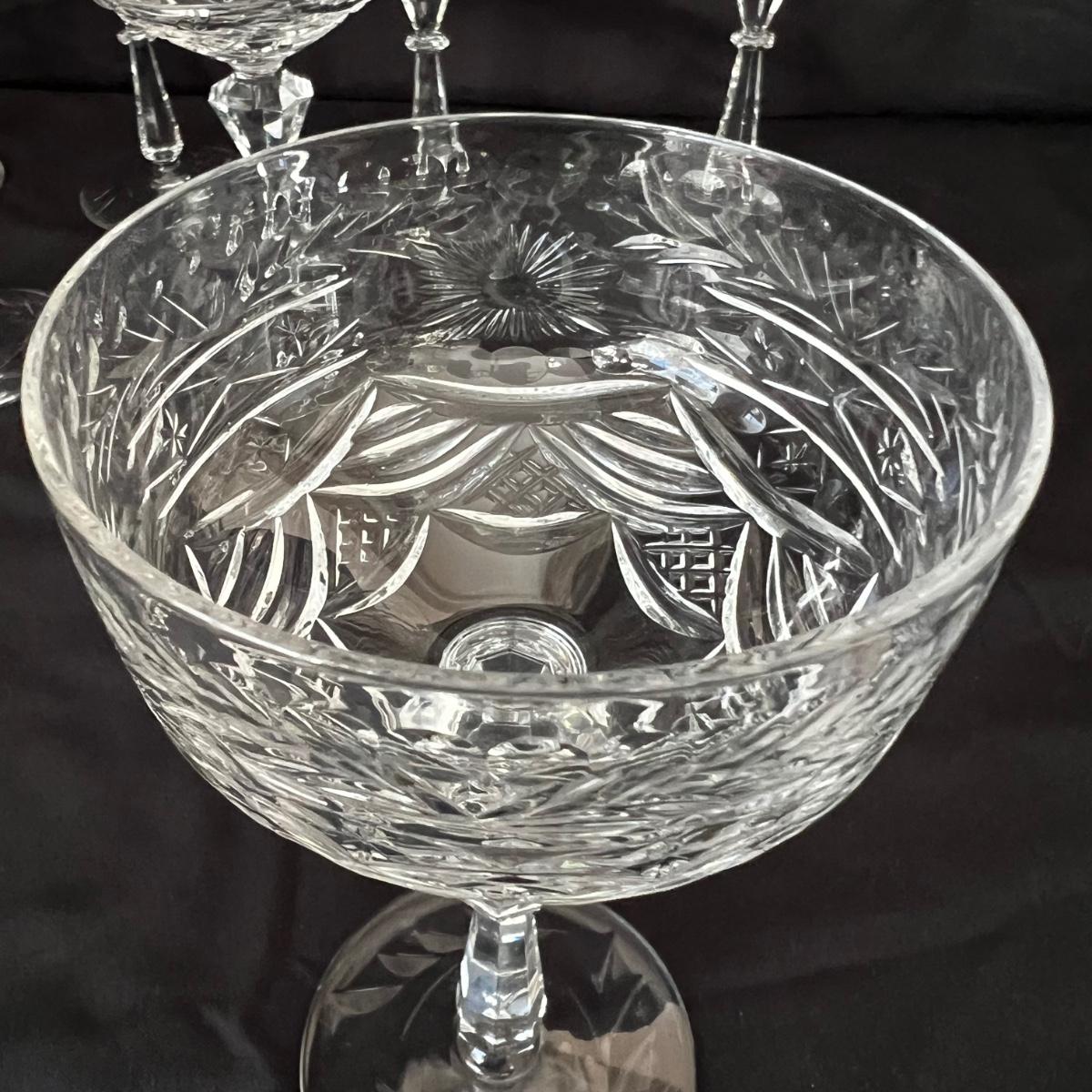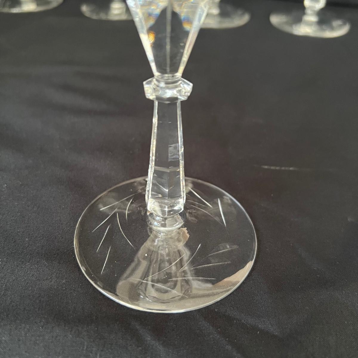Beautiful set of etched glasses featuring a sunburst and hatch design. All have faceted stems. Five red wine, seven champagne/cocktail glasses plus a smaller pair that match the seven in shape.