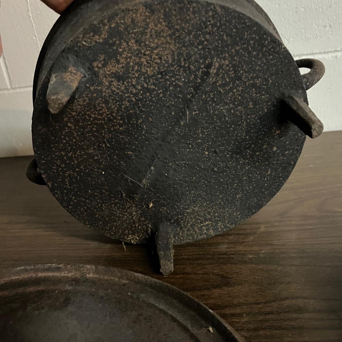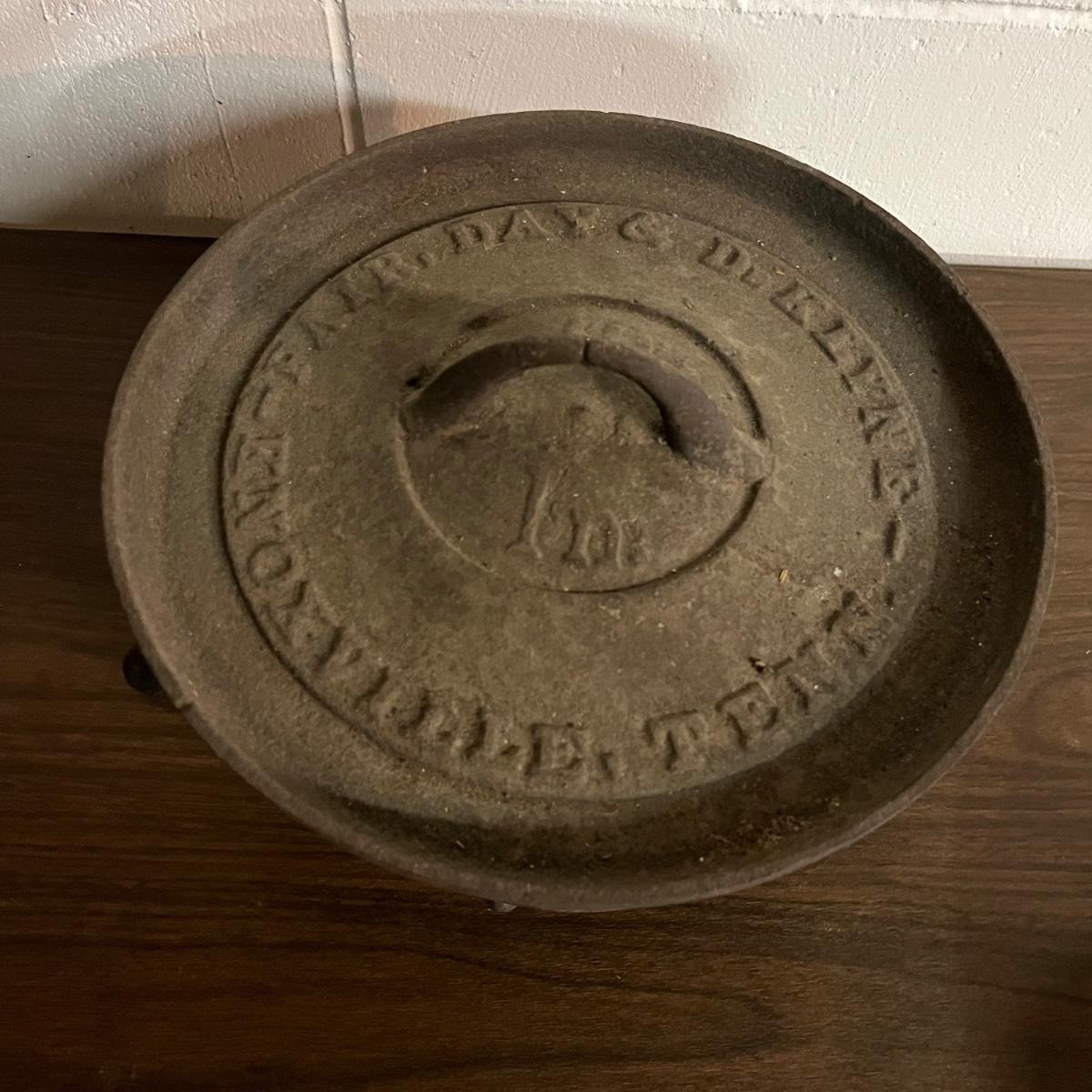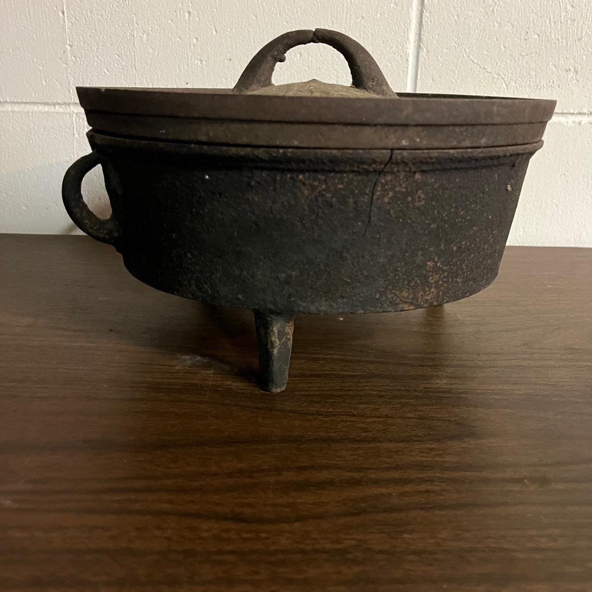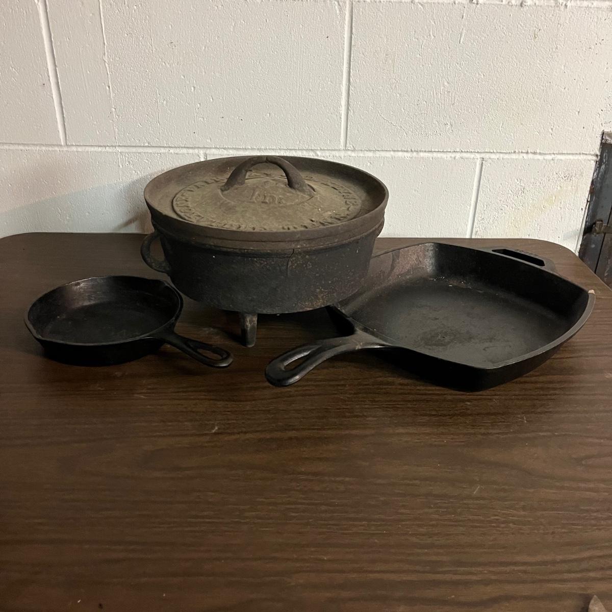 Lot includes a Fair Day and Deklyne Cast iron Dutch oven and a Lodge frying pan and a pan marked 3. Dutch oven has crack, see pictures. Dutch oven measures 10”D x 7”.