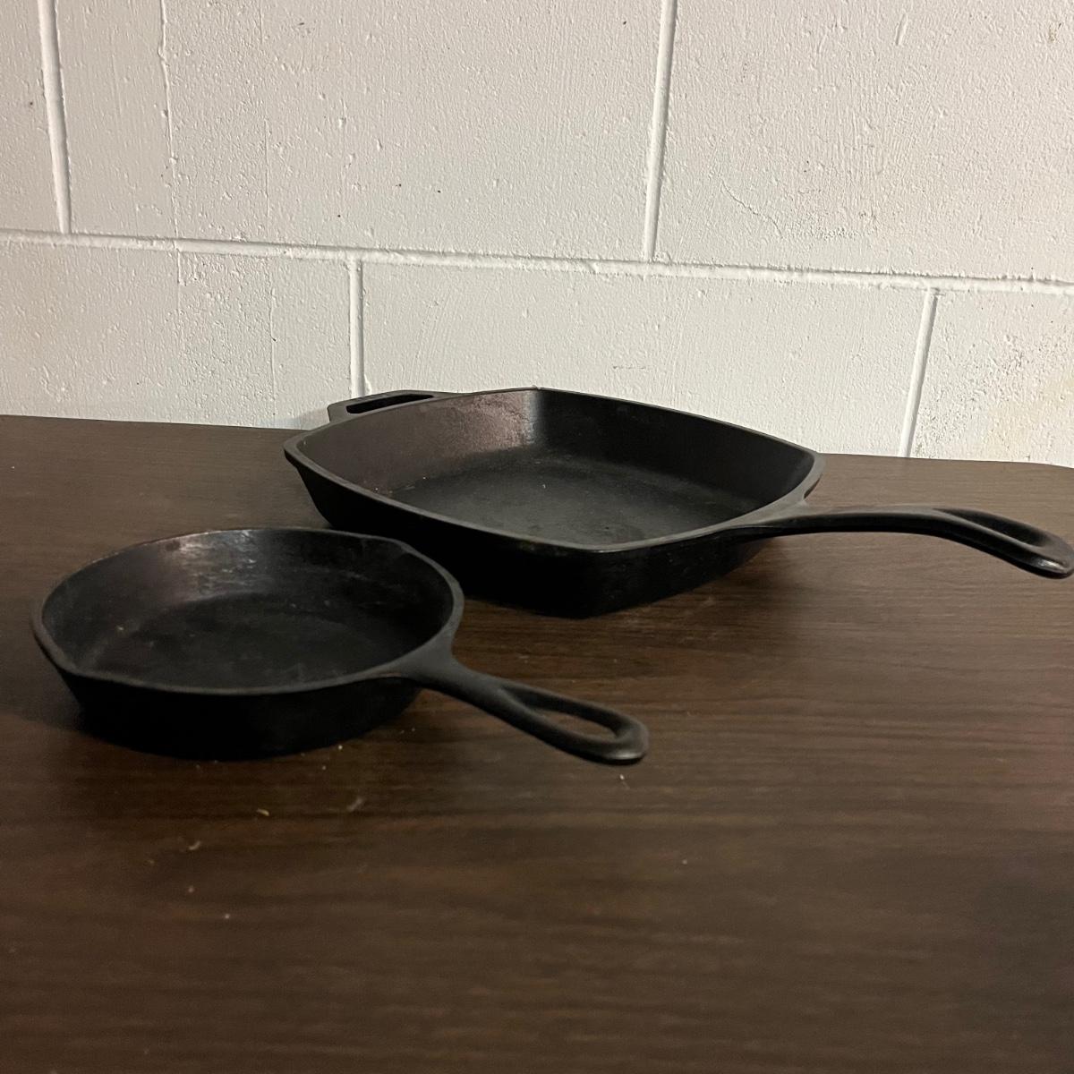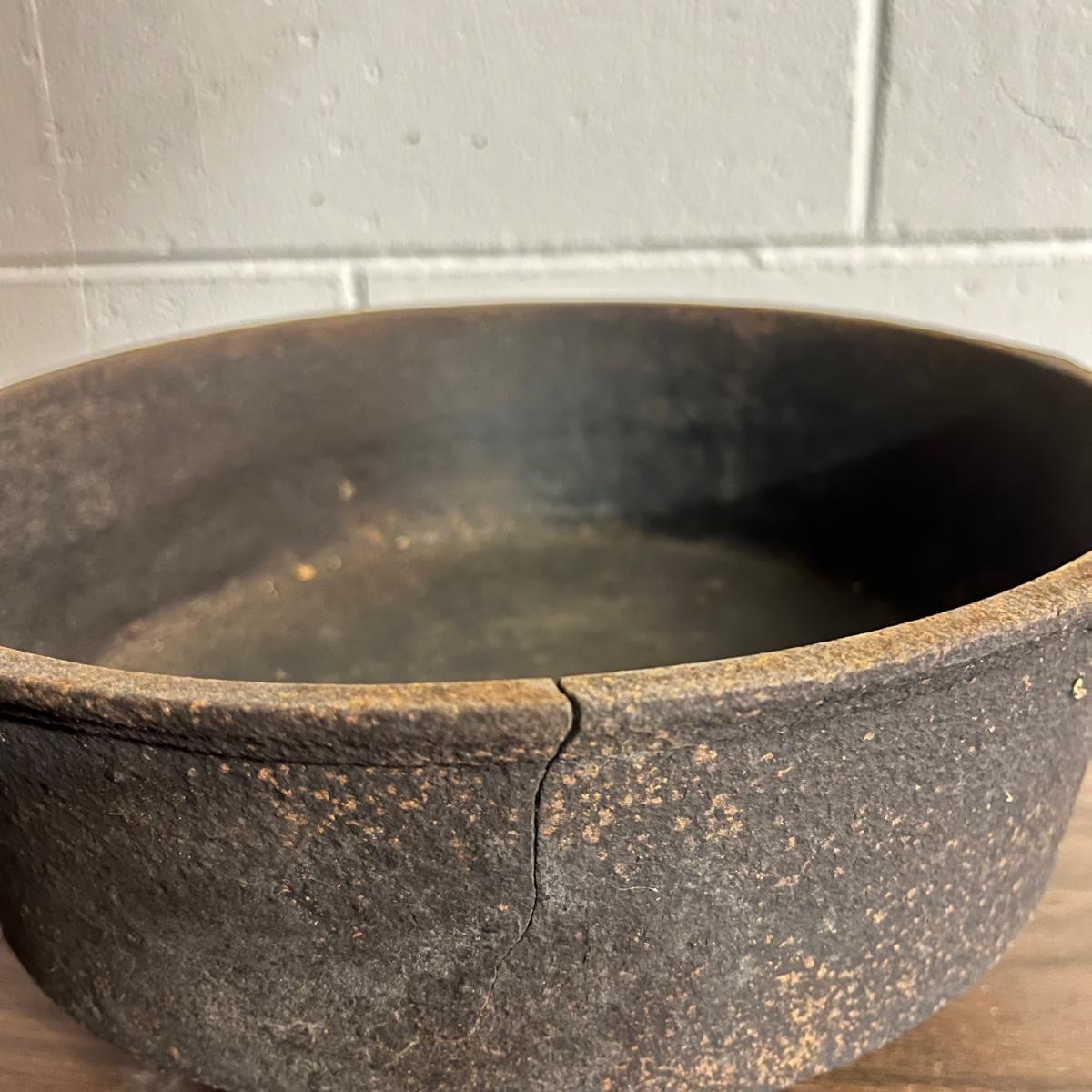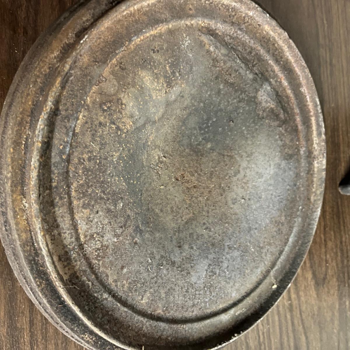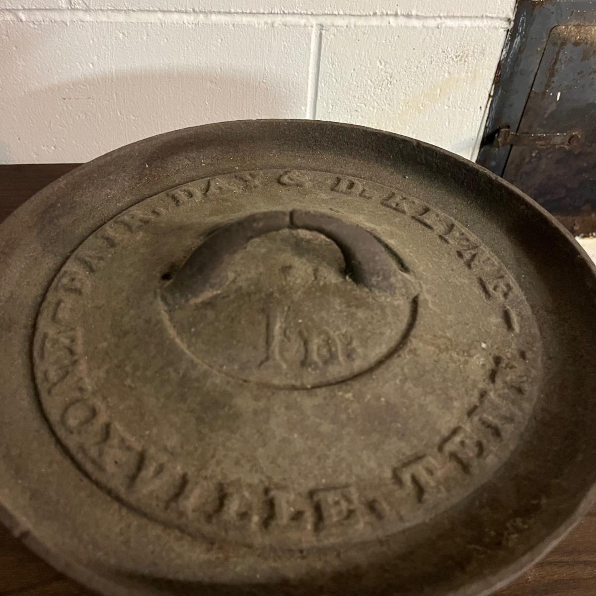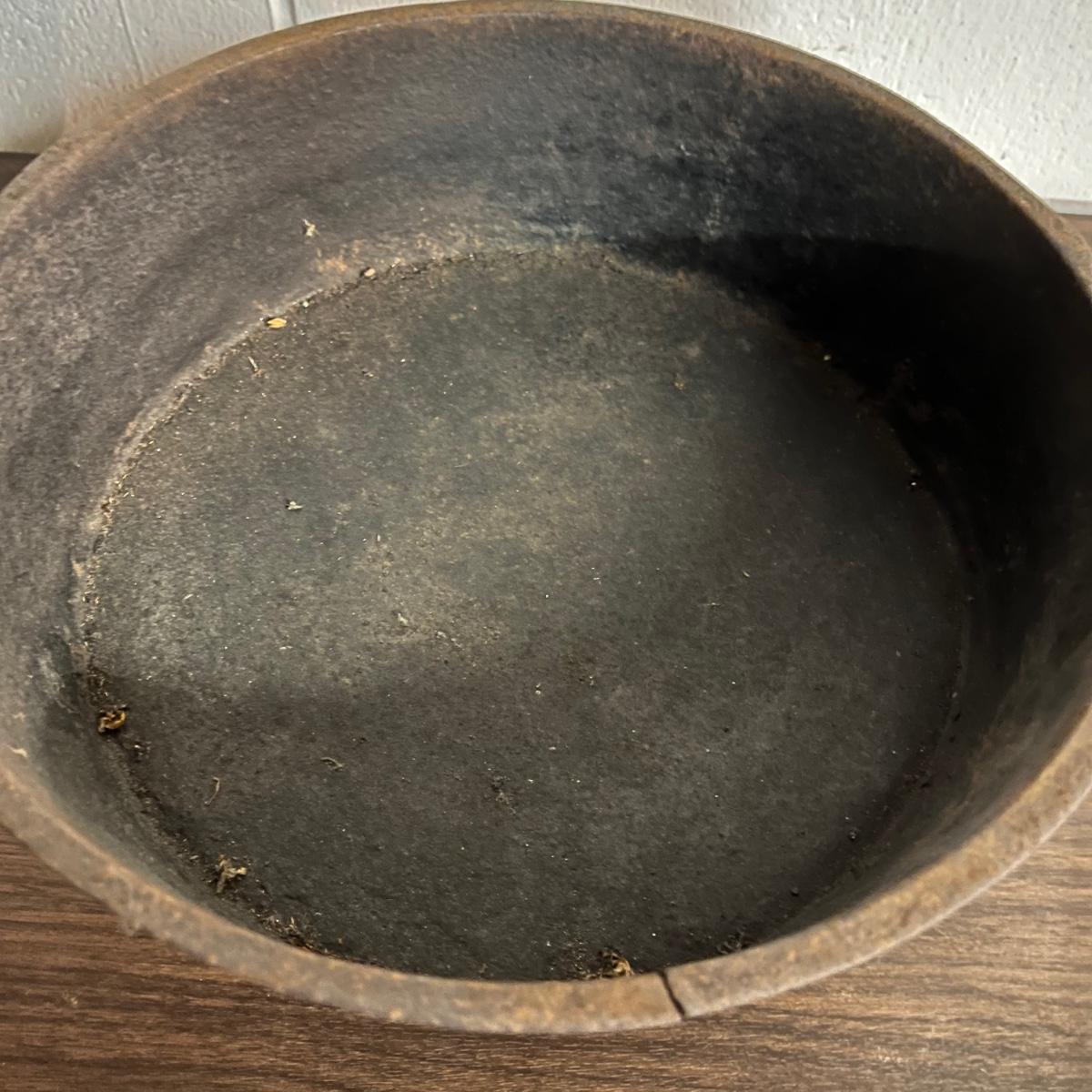 Lot includes a Fair Day and Deklyne Cast iron Dutch oven and a Lodge frying pan and a pan marked 3. Dutch oven has crack, see pictures. Dutch oven measures 10”D x 7”.