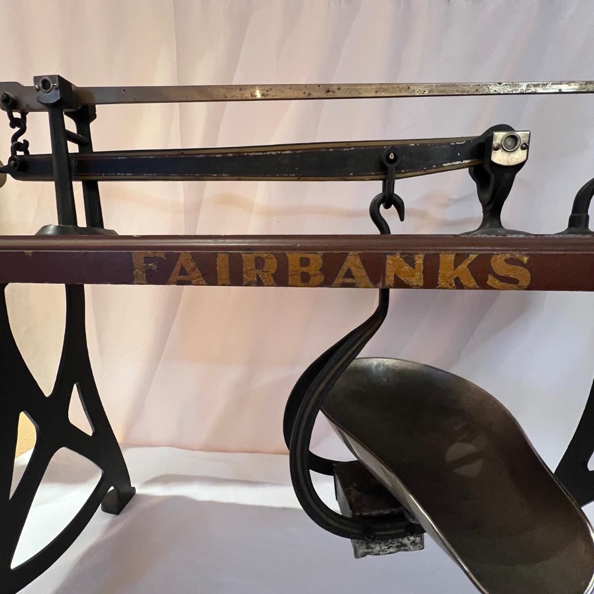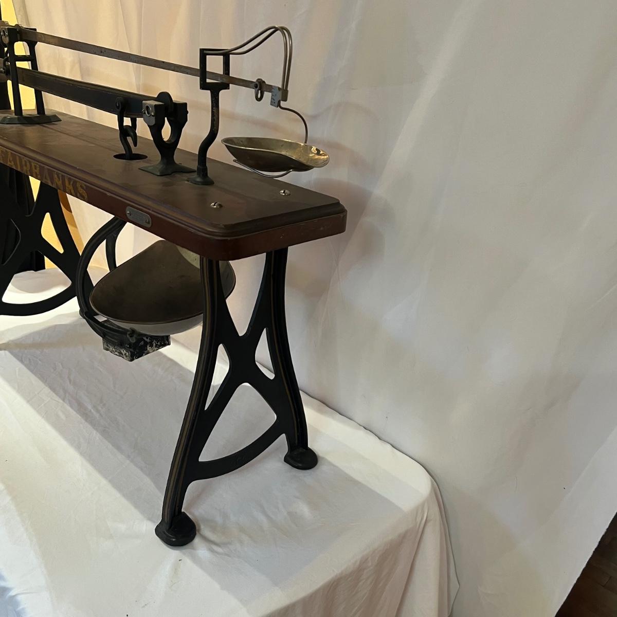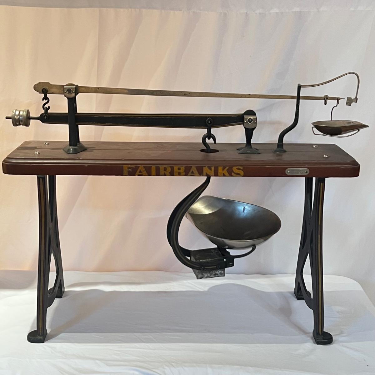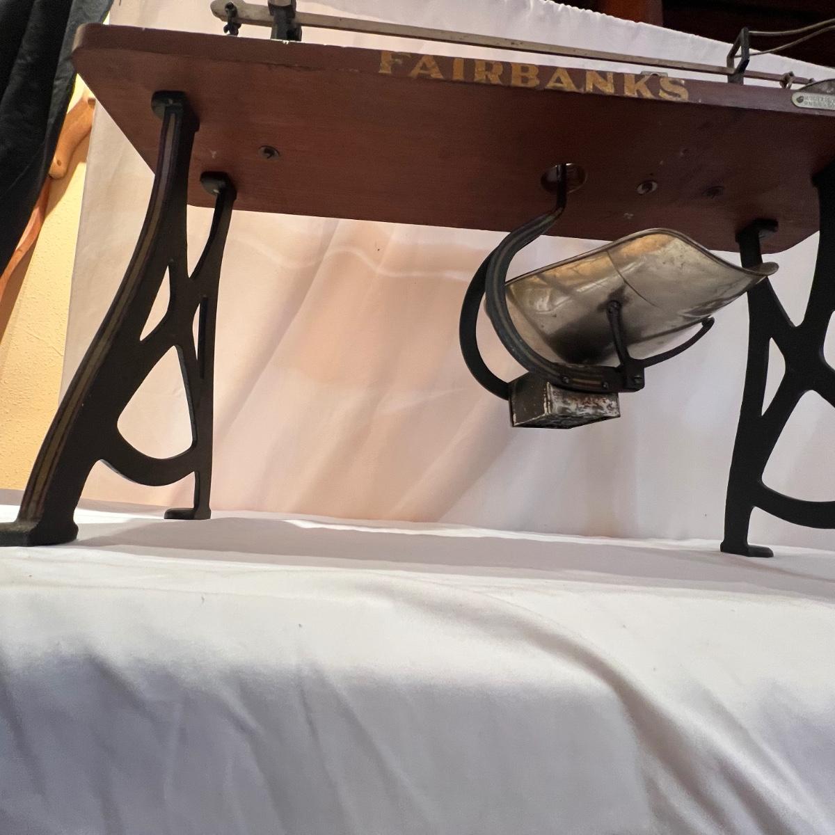 This special find is a Fairbanks counting scale. Plate has the patent date of 1896. All parts appear to be operational. It is wood on iron legs. Note the few blemishes shown in an image. Measures 34” x 9” x 28”H.