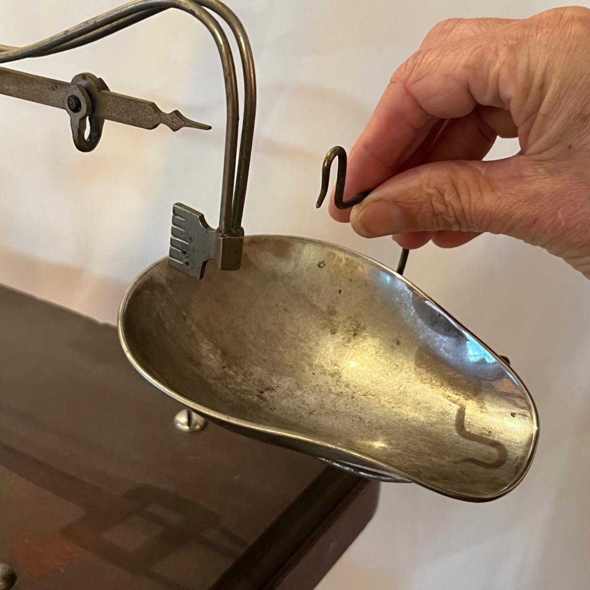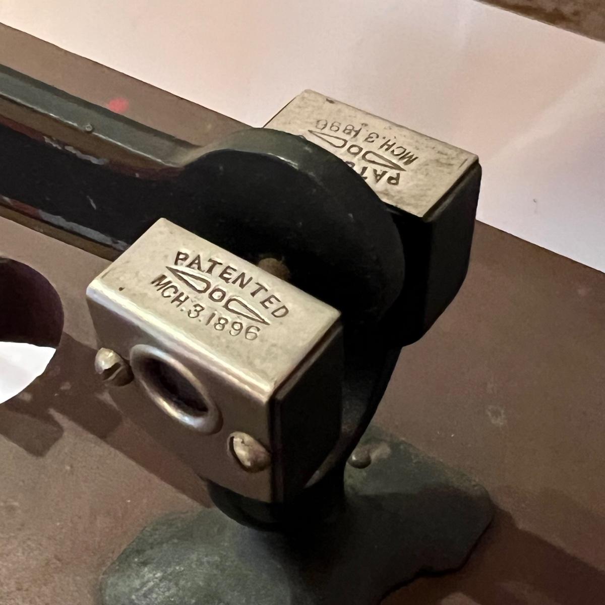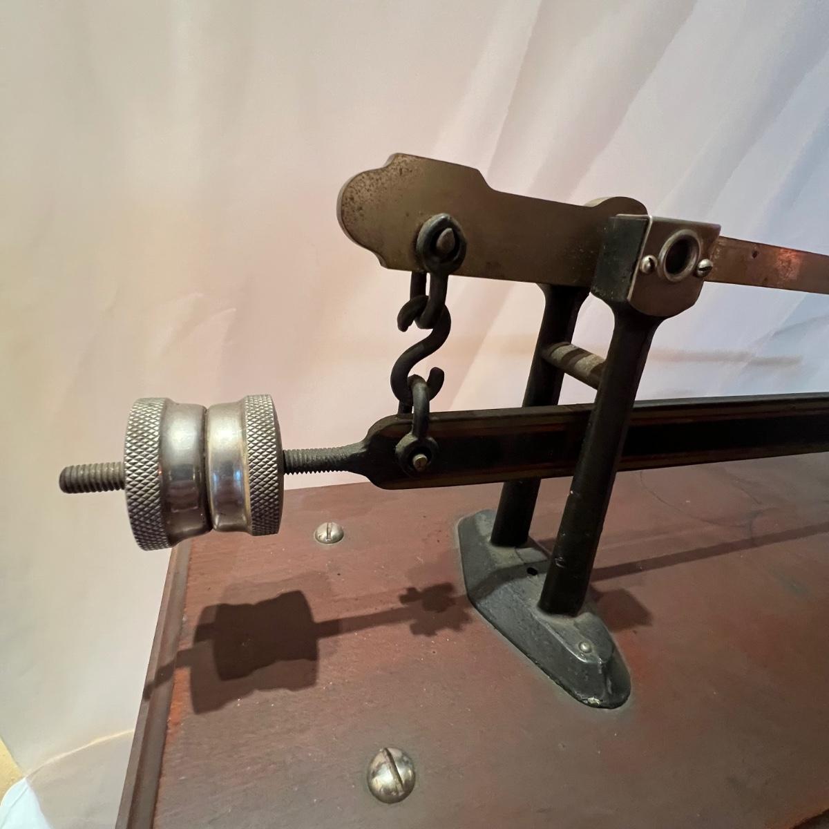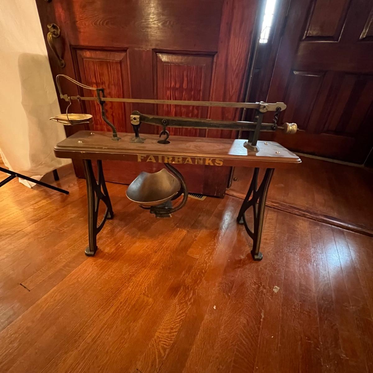 This special find is a Fairbanks counting scale. Plate has the patent date of 1896. All parts appear to be operational. It is wood on iron legs. Note the few blemishes shown in an image. Measures 34” x 9” x 28”H.