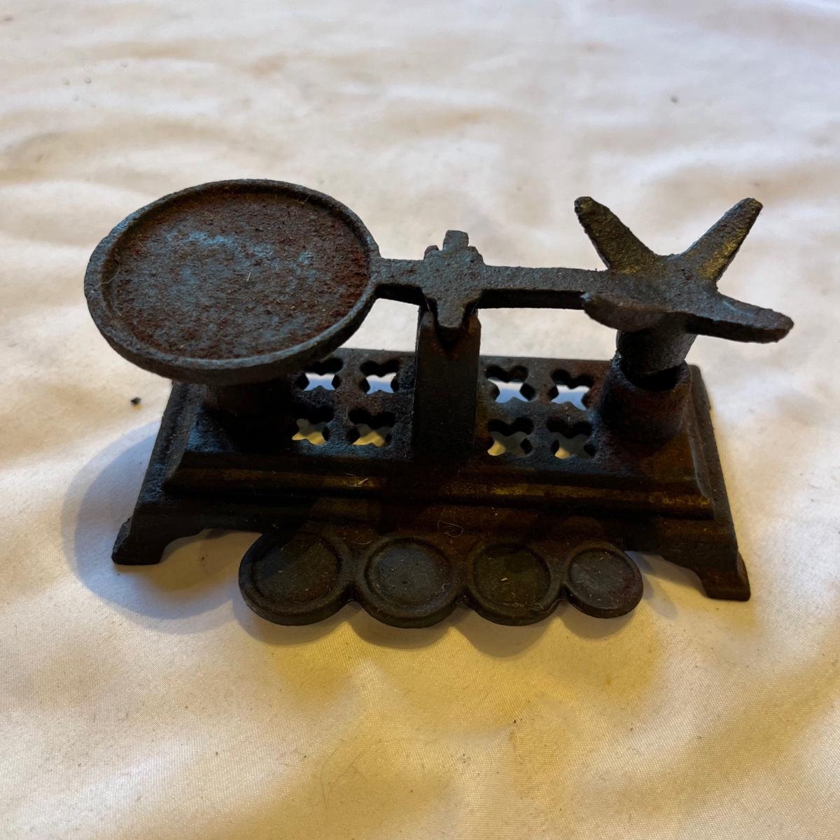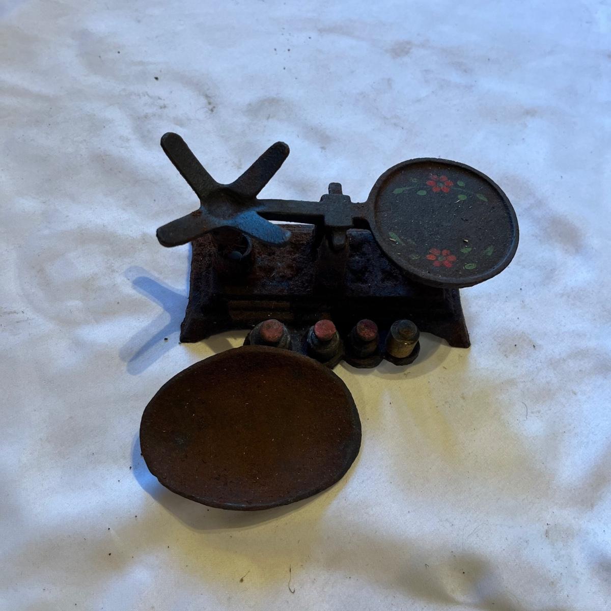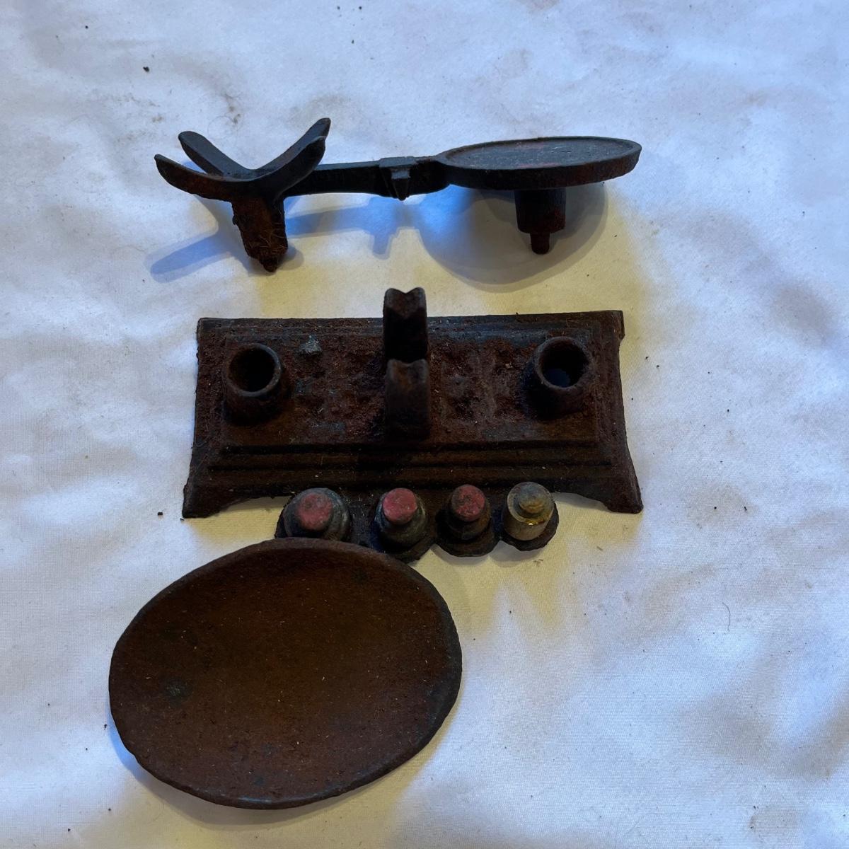 Lot includes a Fairbanks balance scale with one marble piece, small balance scale with four weight and a small balance scale with no weights. Two small scales have no markings. All three scales appear to be cast iron. Fairbanks scale measures 6” x 14” x 5.25”.