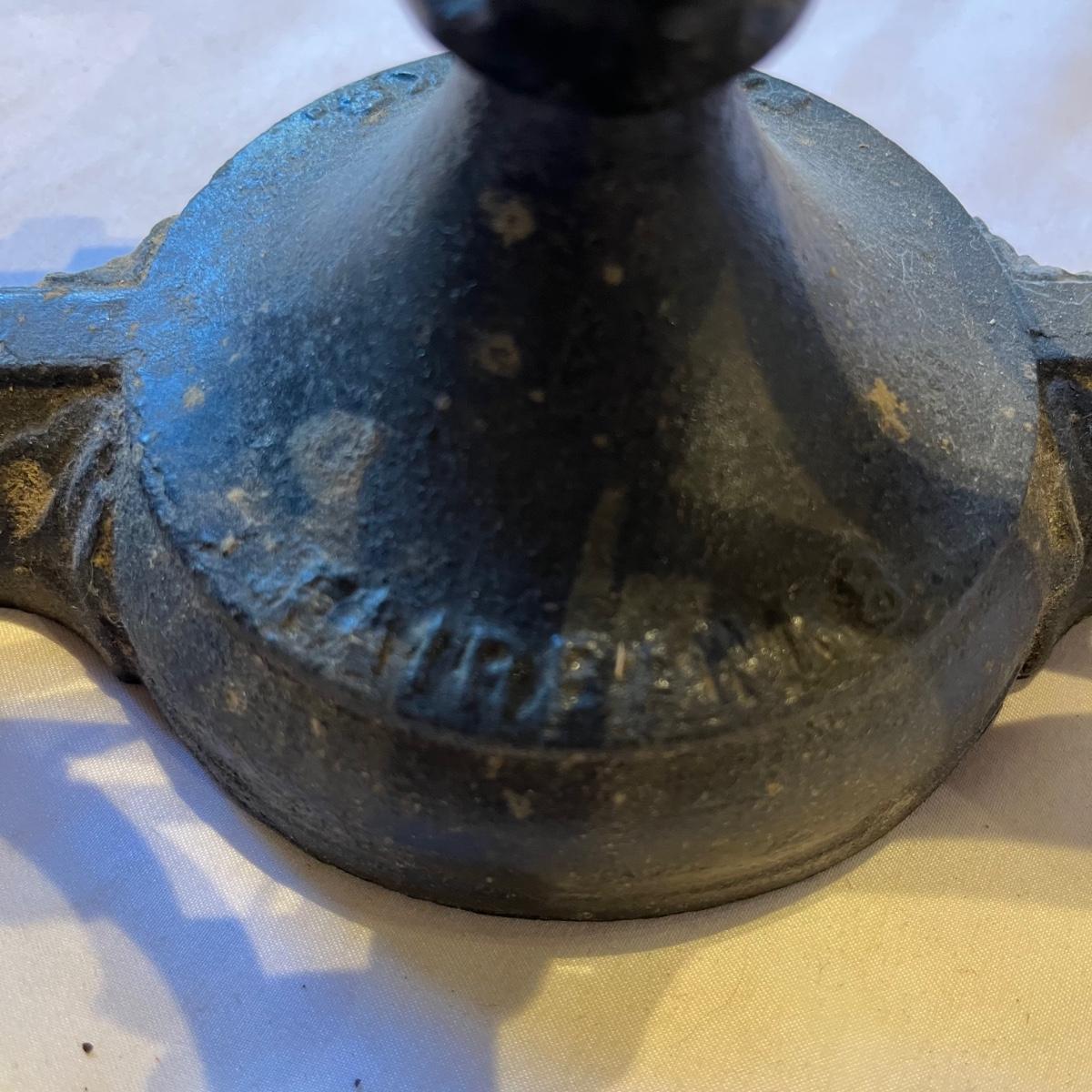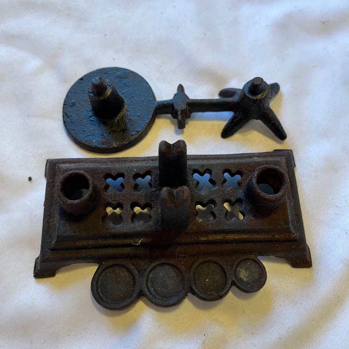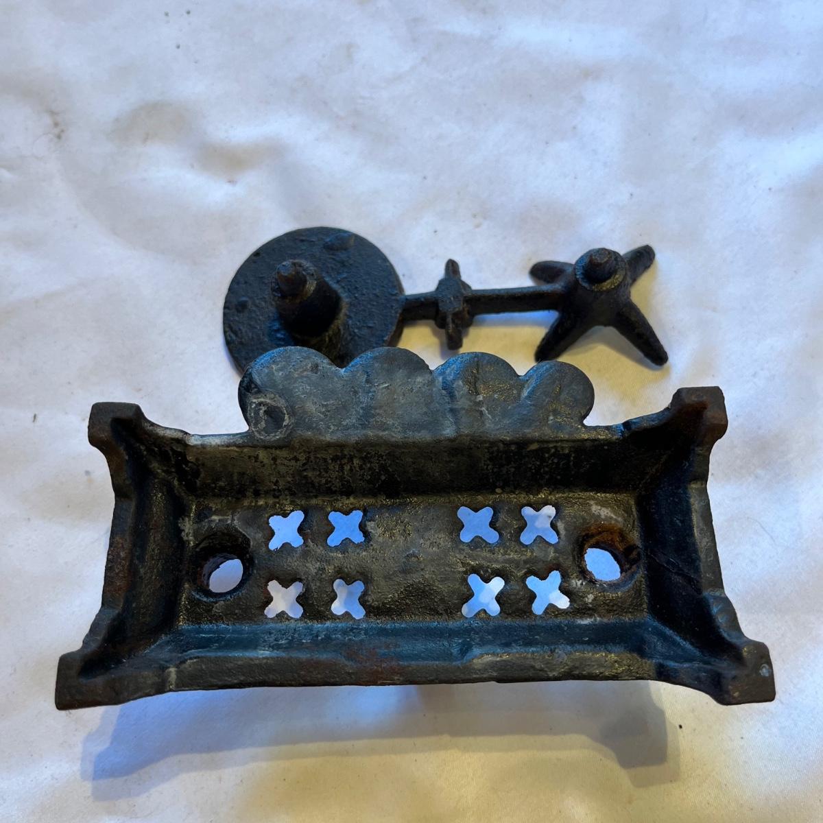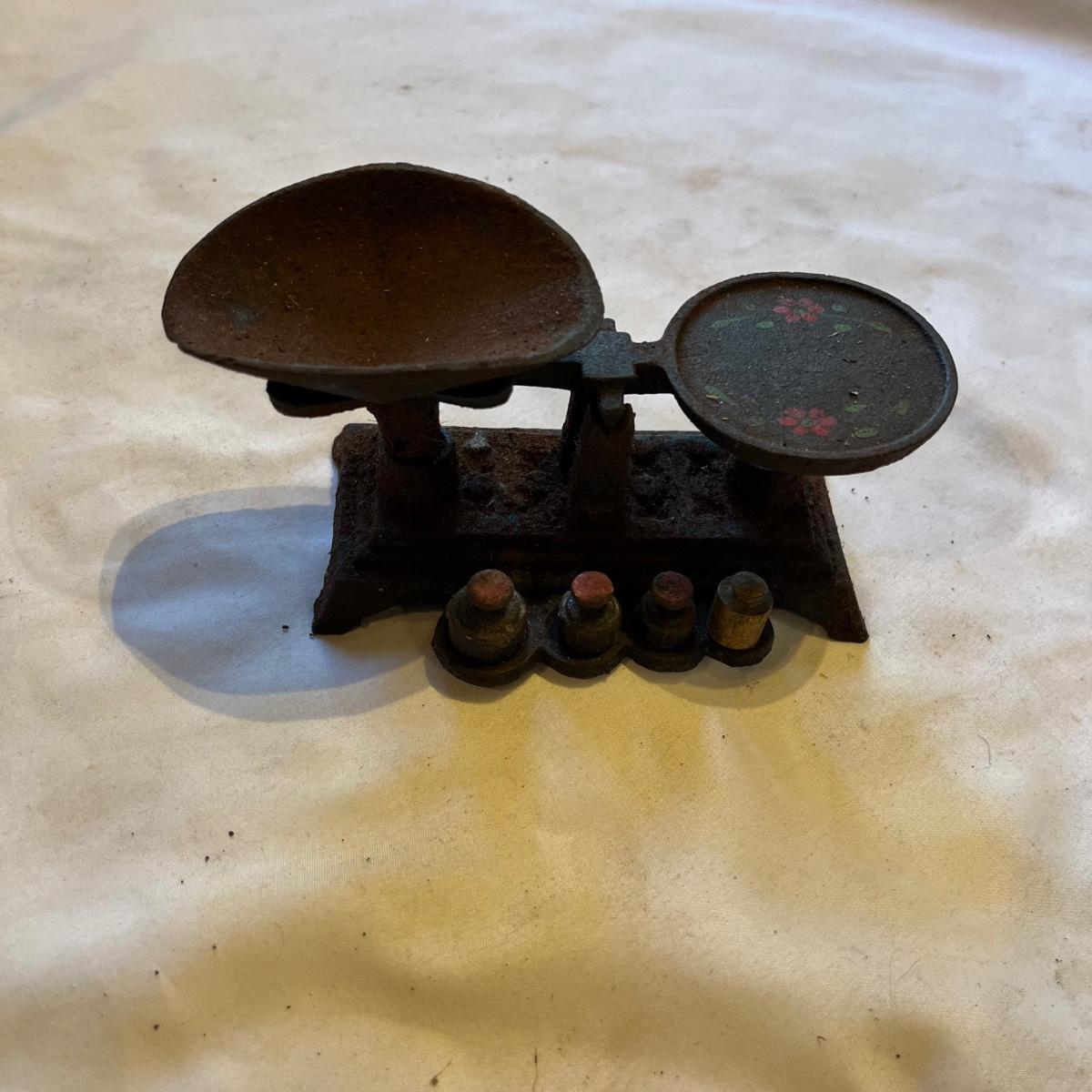 Lot includes a Fairbanks balance scale with one marble piece, small balance scale with four weight and a small balance scale with no weights. Two small scales have no markings. All three scales appear to be cast iron. Fairbanks scale measures 6” x 14” x 5.25”.