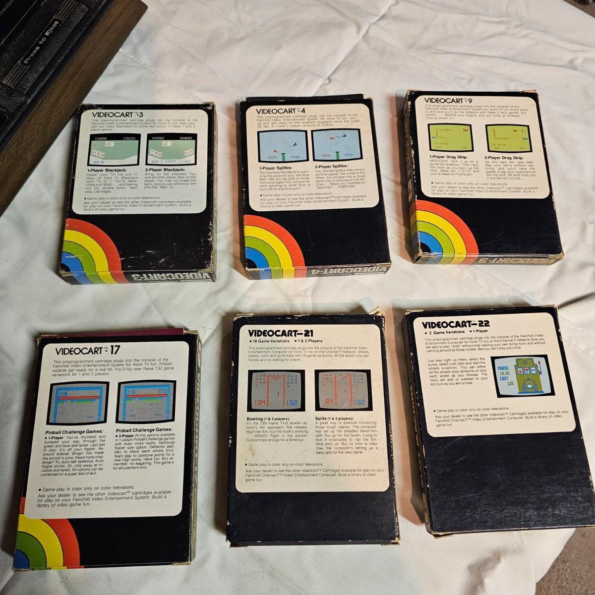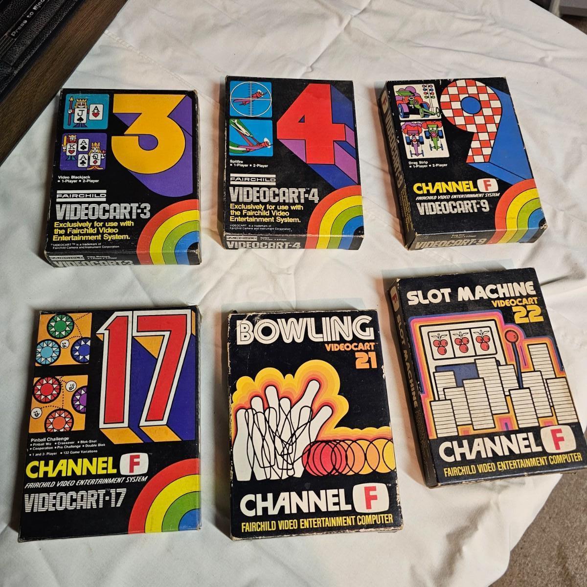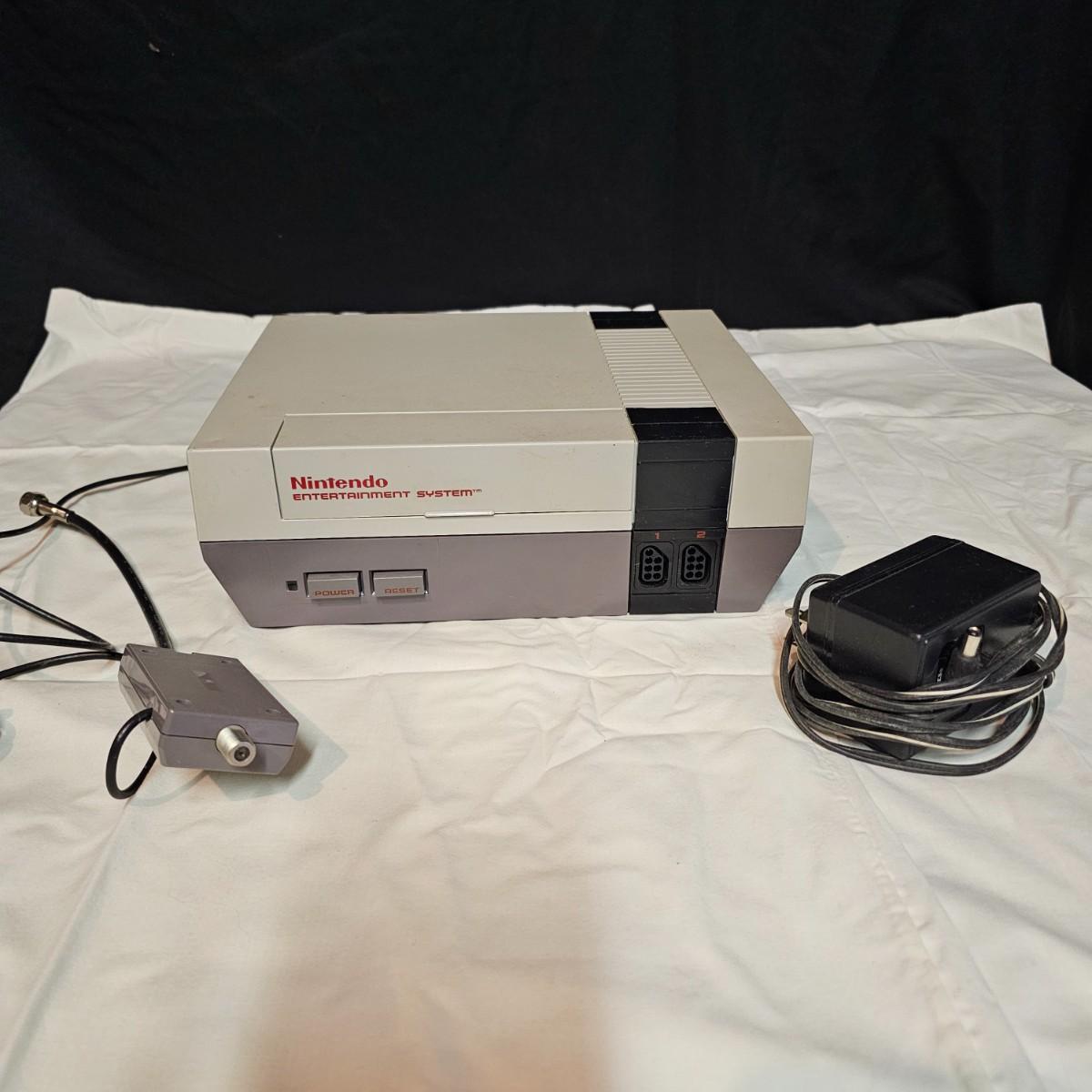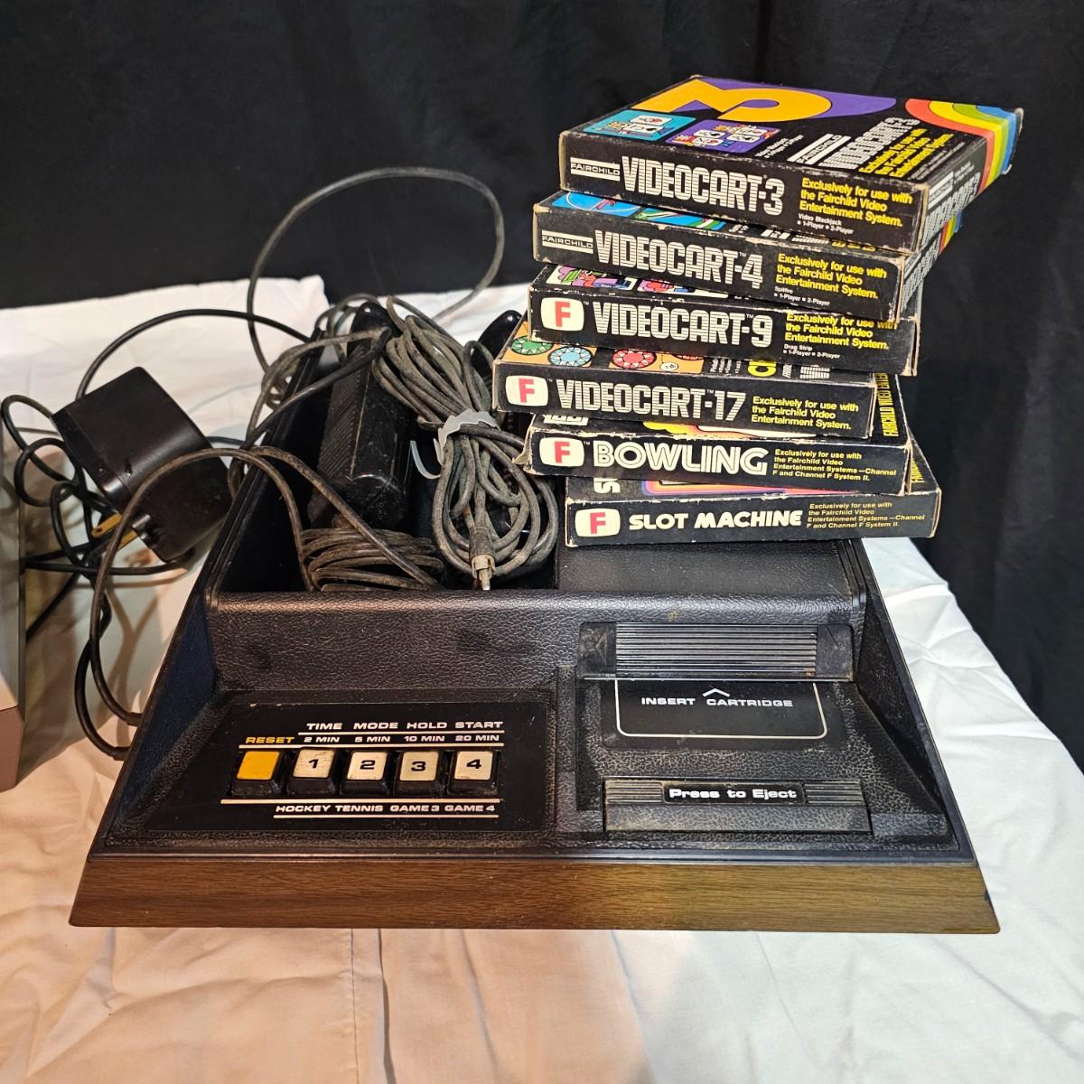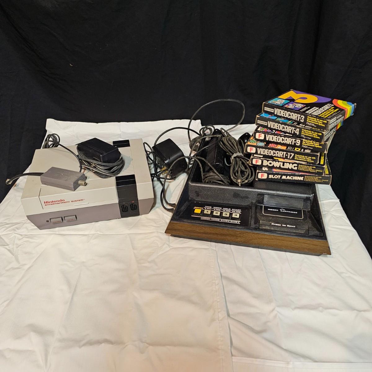 From the 1970's two early gaming systems. One Nintendo NES-001 console unit with power adapter and tv hook up cable. Does not include controllers or games. Powered on when plugged in. Also included is a Fairchild FVE100 system with power adapter, two controllers and six game cartridges, Videocart #'s 3, 4, 9, 17, 21 and 22. Instruction sheets in all games except #22. Console powered on when plugged in and also some game audio. See photos for details. Both systems will need some clean up. Shipping available.