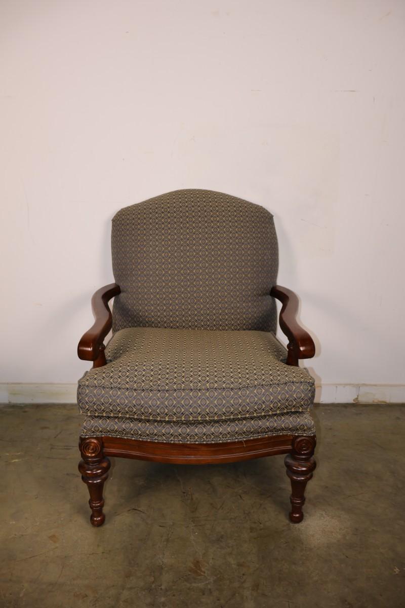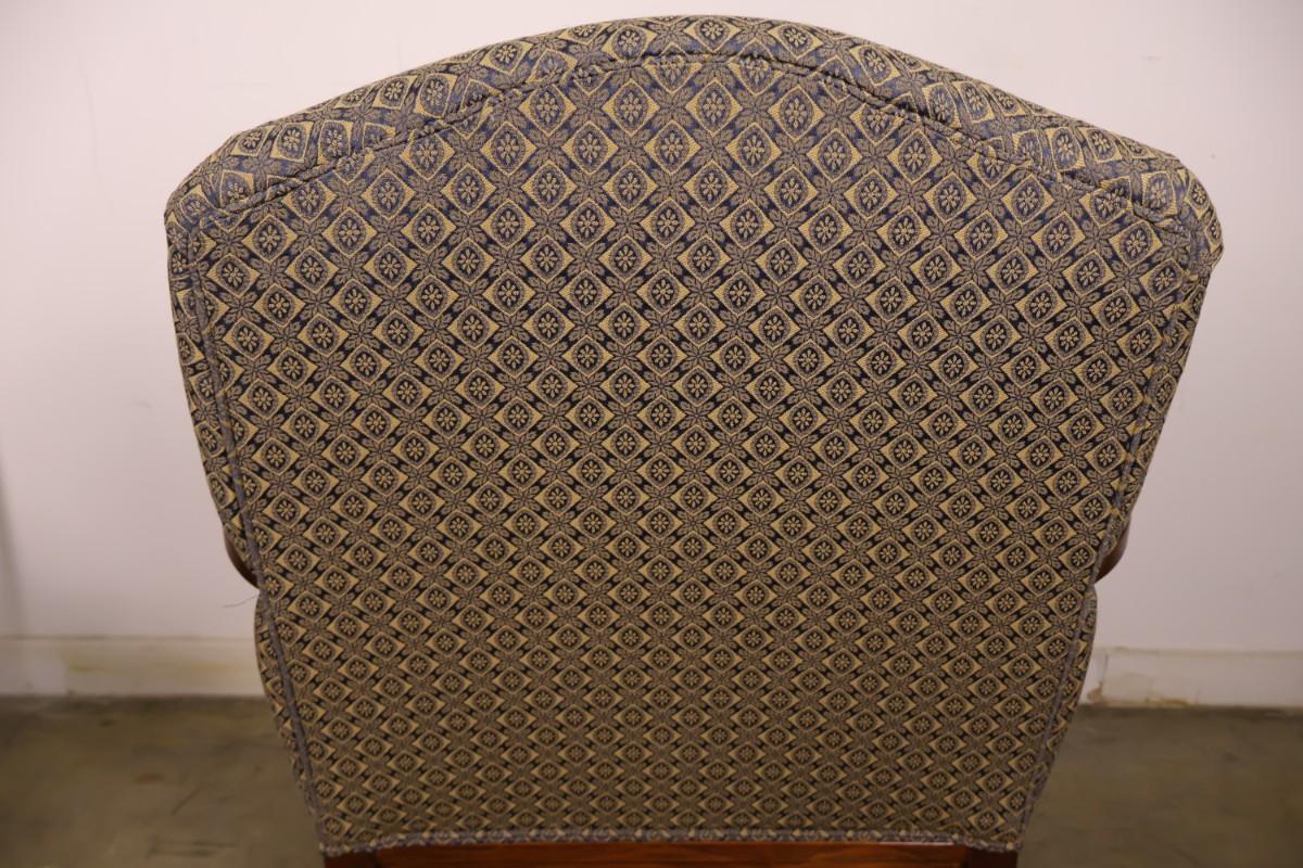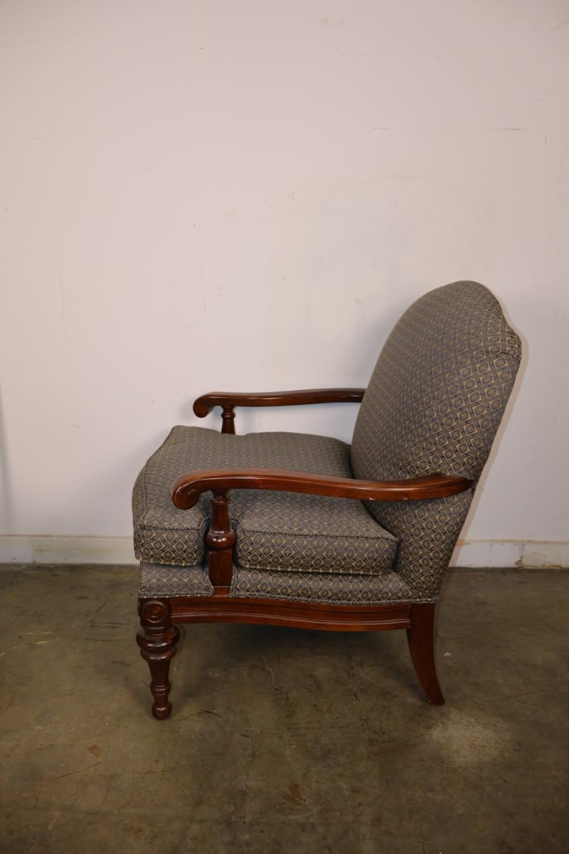 Fairfield Chair Custom Upholstered Arm Chair with Blue & Gold Fabric