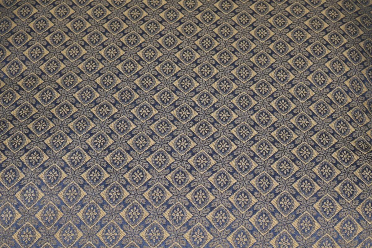 Custom upholstered arm chair by Fairfield Chair Co. Has blue and cold fabric. 27" x 38". Seat height 21" x 22" deep.