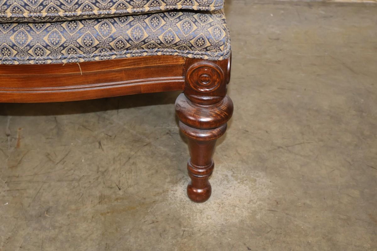 Custom upholstered arm chair by Fairfield Chair Co. Has blue and cold fabric. 27" x 38". Seat height 21" x 22" deep.