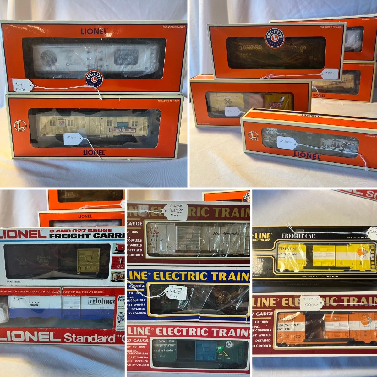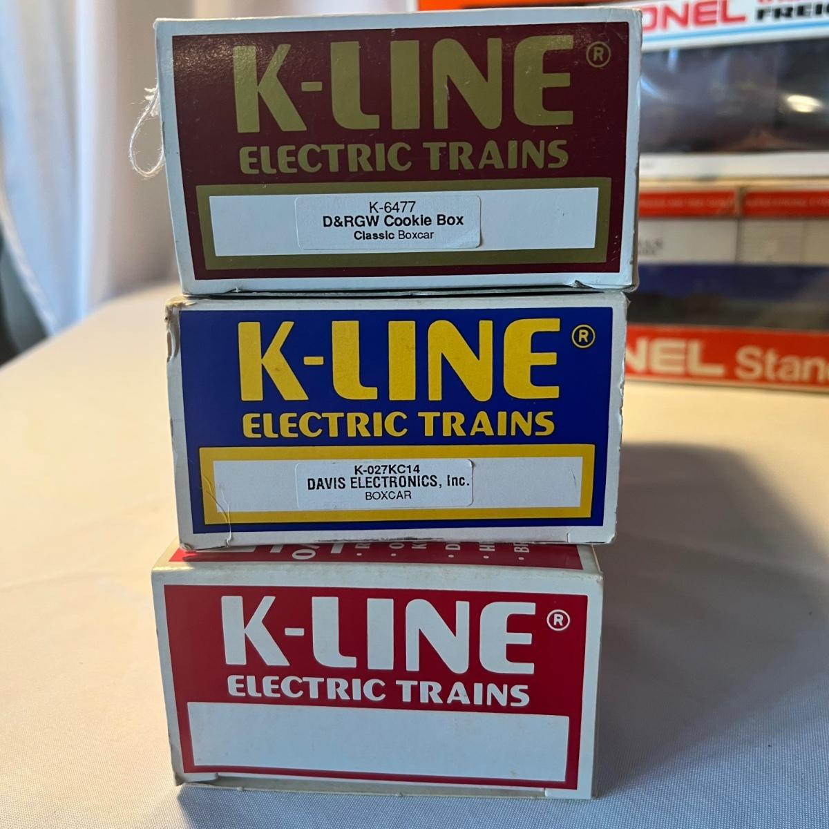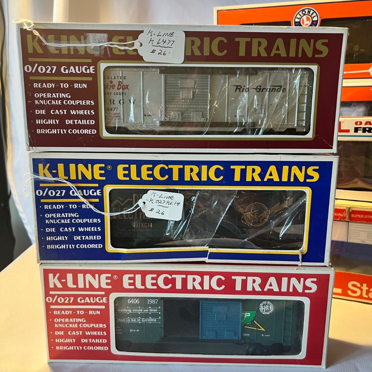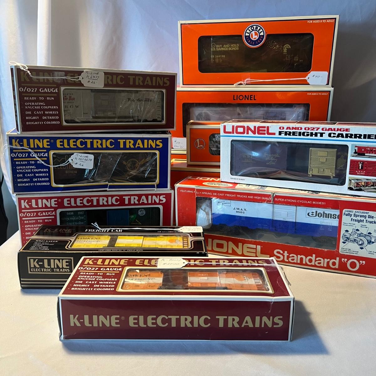 Five K-Line and seven Lionel cars altogether with original boxes. See photos for full inventory and more information. Please note that any price tag seen on an item was not put there by Sterling Transitions and does not reflect the current value of the item.