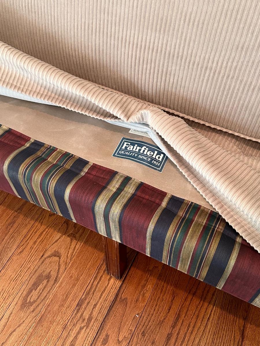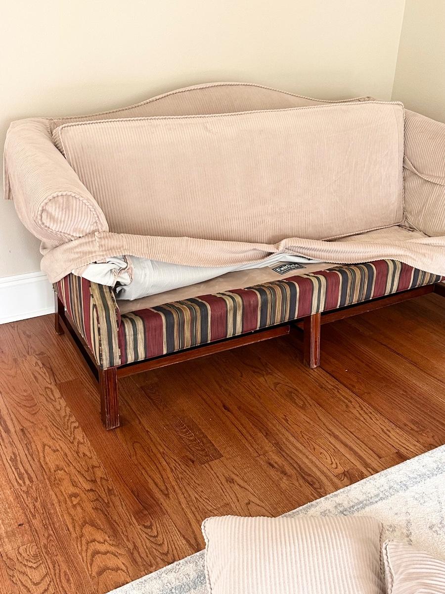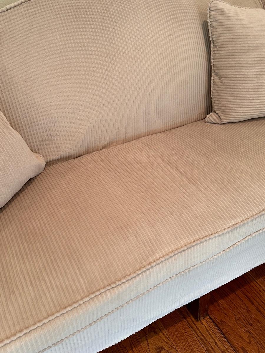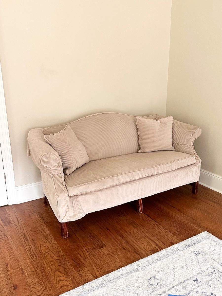 Corduroy type material~ taupe/beige in color ~ comes with 2 matching throw pillows ~ Seat cushion cover and slipcover can be removed for cleaning ~ has arm covers as well ~ overall good condition ~ 36" H x 61" W x 27" D