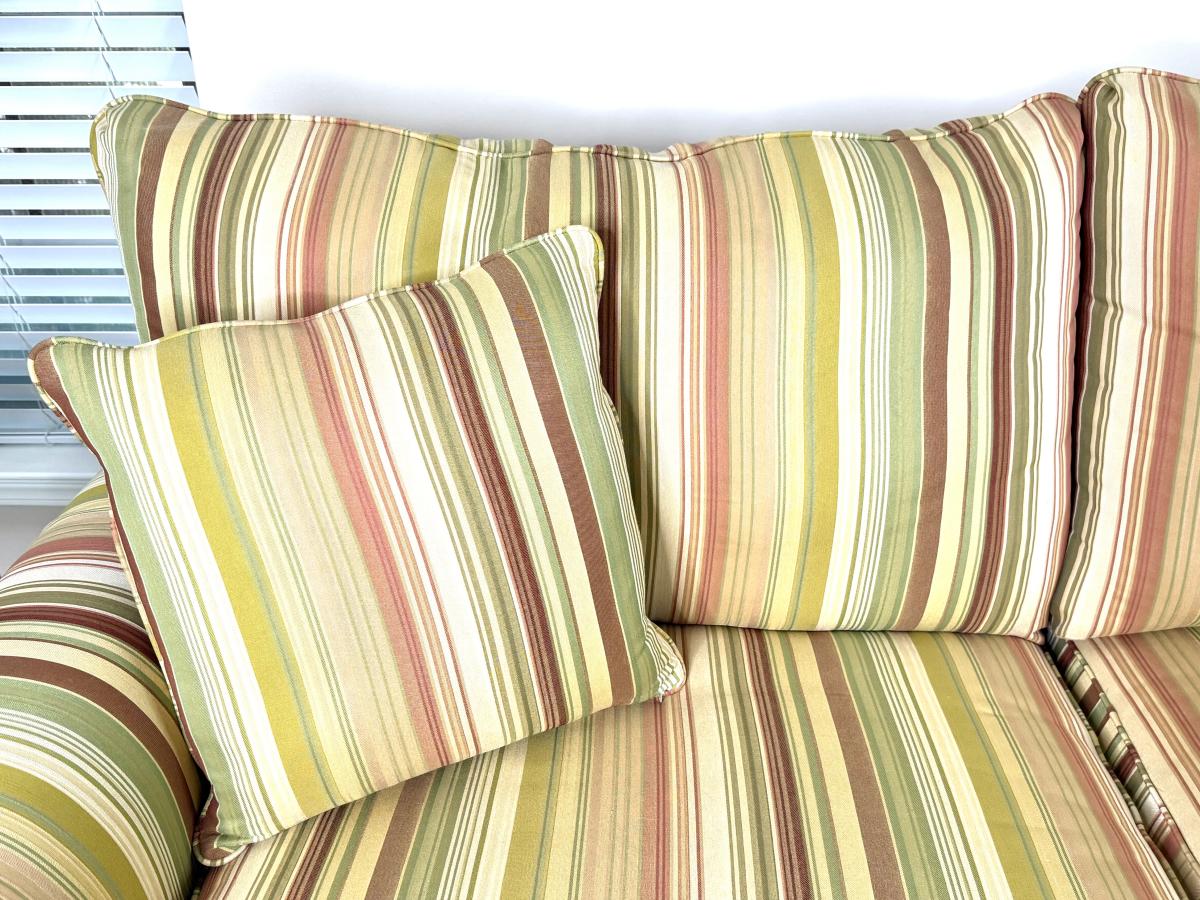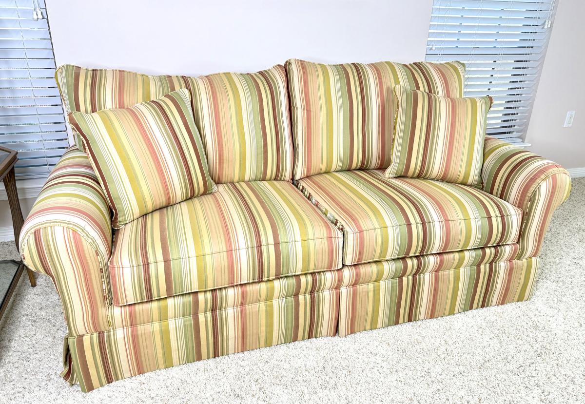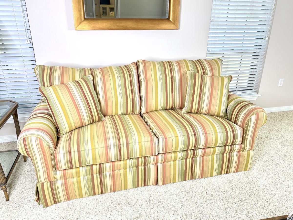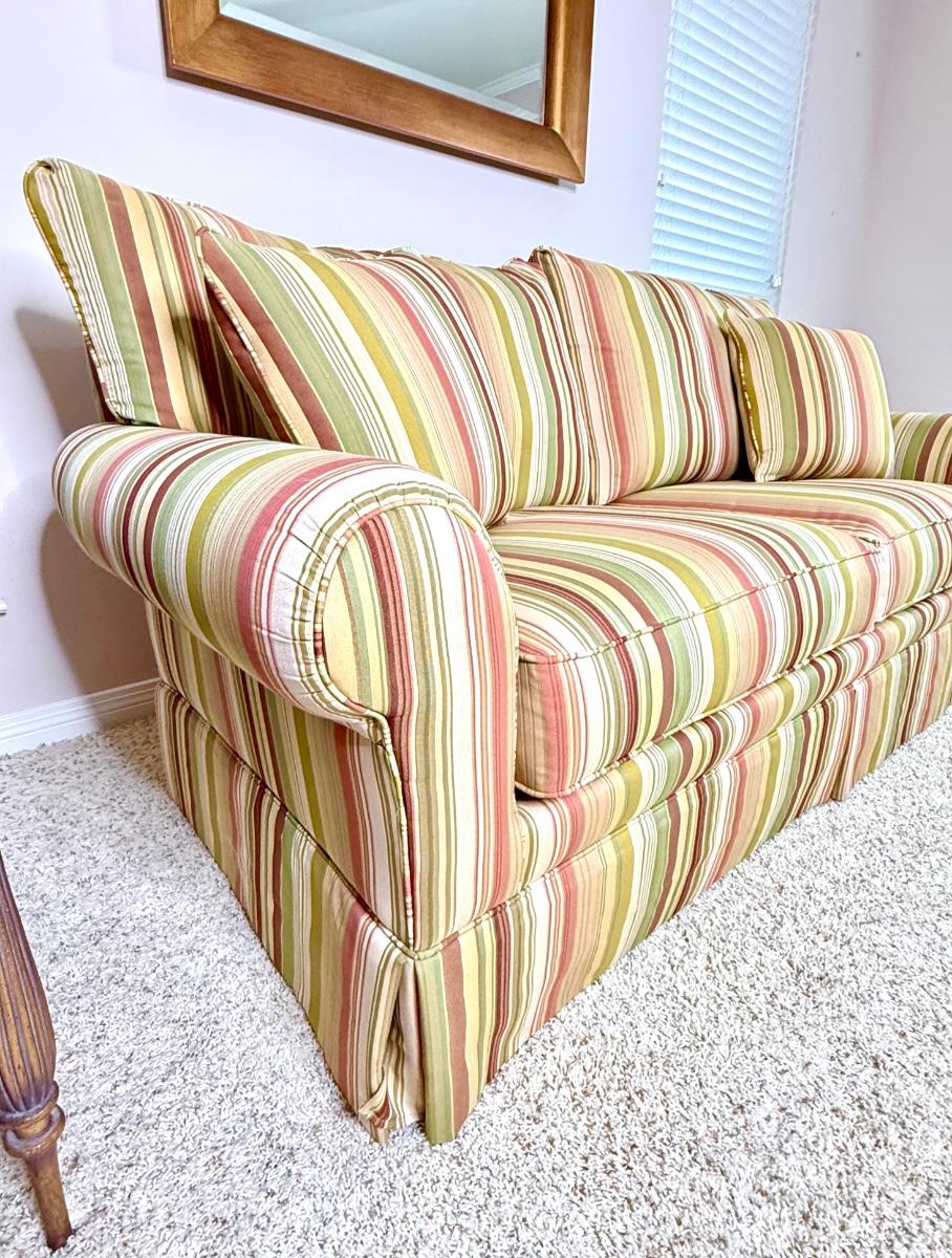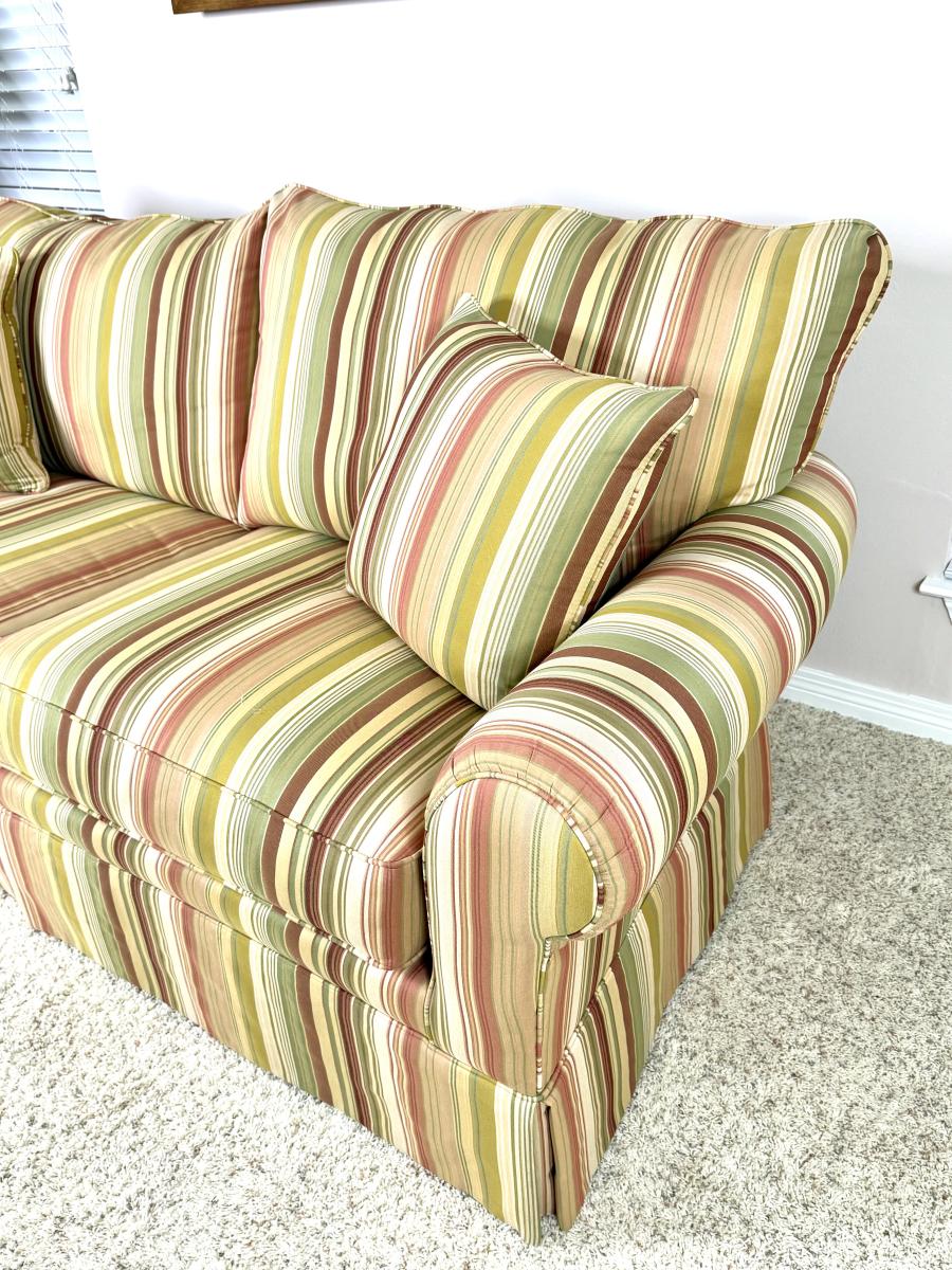 Measures 37” tall to top of back cushions and 31” tall to actual back of couch.