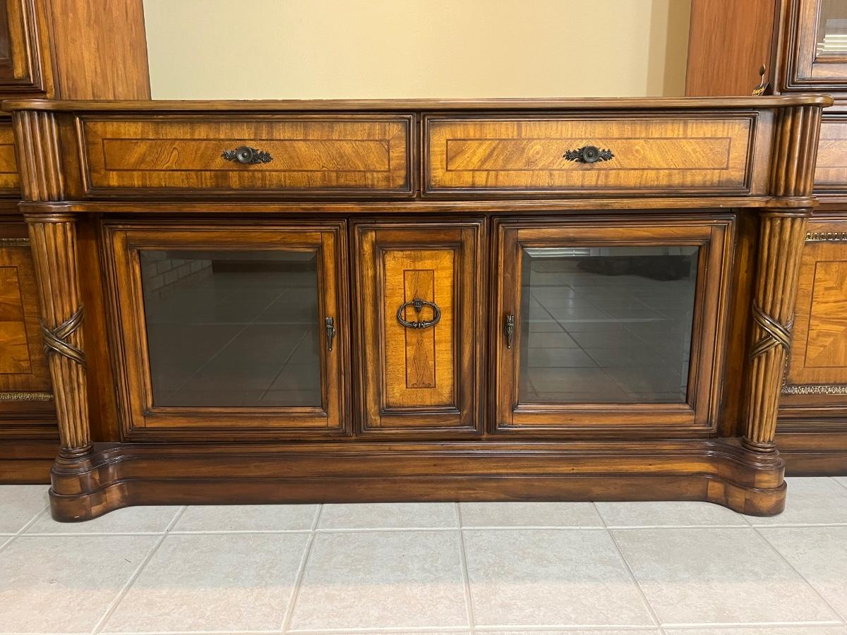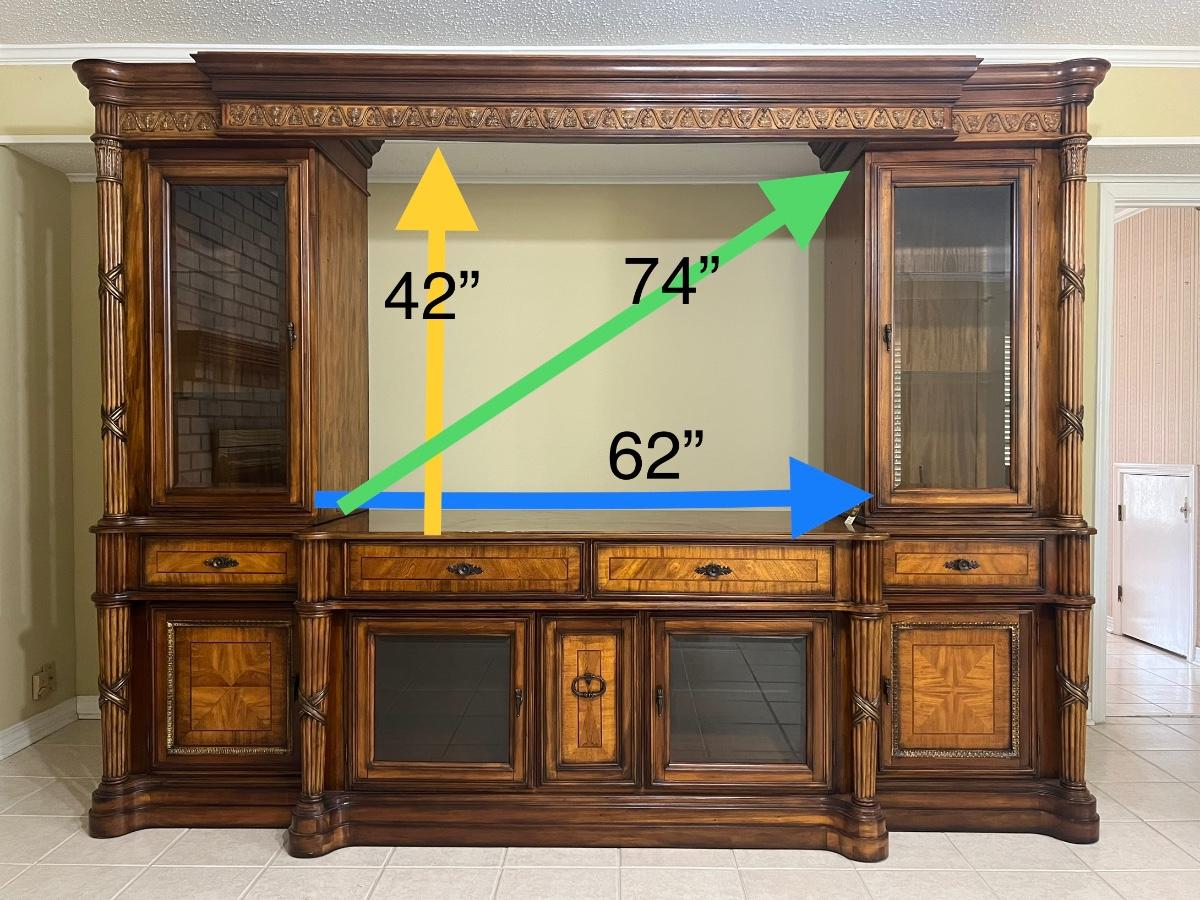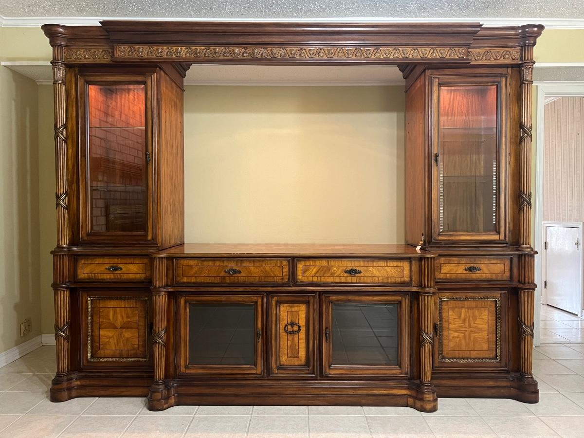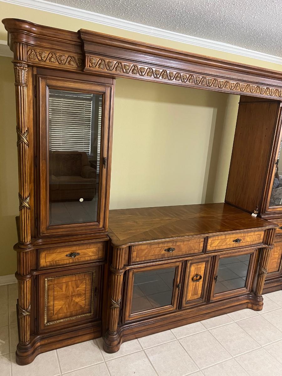 Beautiful detailed entertainment center. All lights work as it should as well as all drawers and doors. Measurements for TV area are in one of the pictures, please reference that for considering what size TV will fit.
