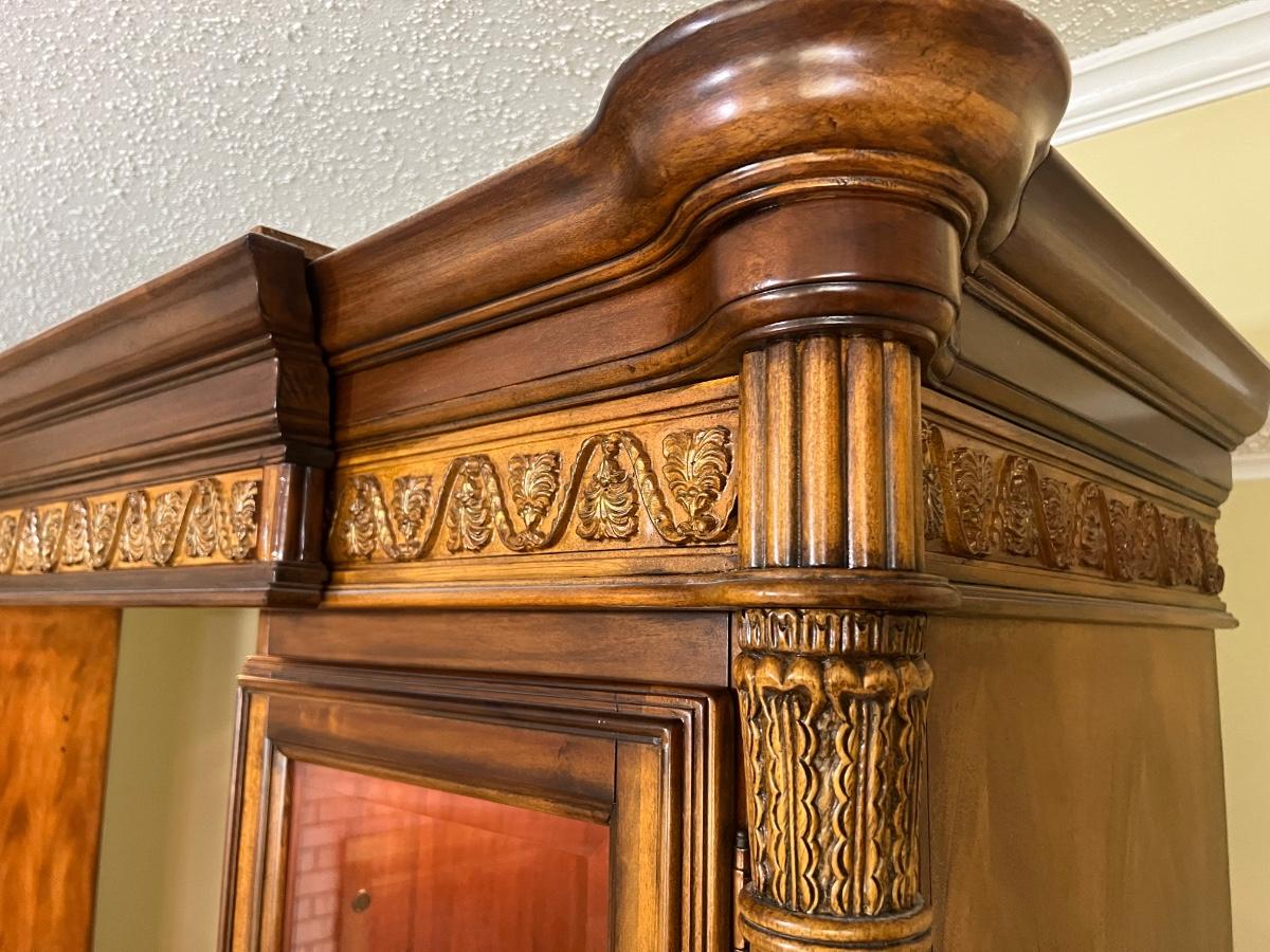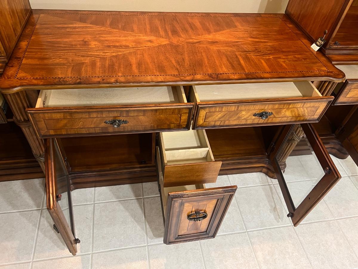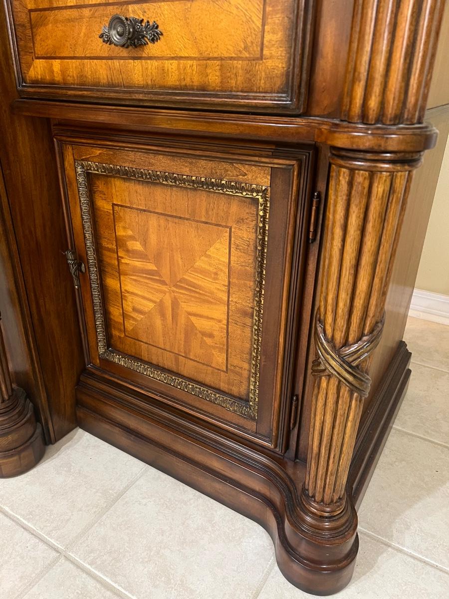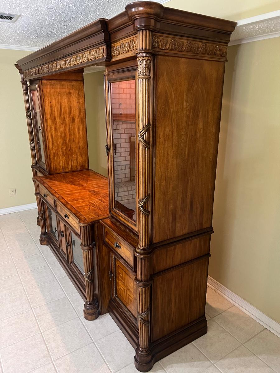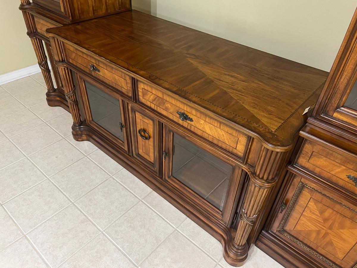 Beautiful detailed entertainment center. All lights work as it should as well as all drawers and doors. Measurements for TV area are in one of the pictures, please reference that for considering what size TV will fit.