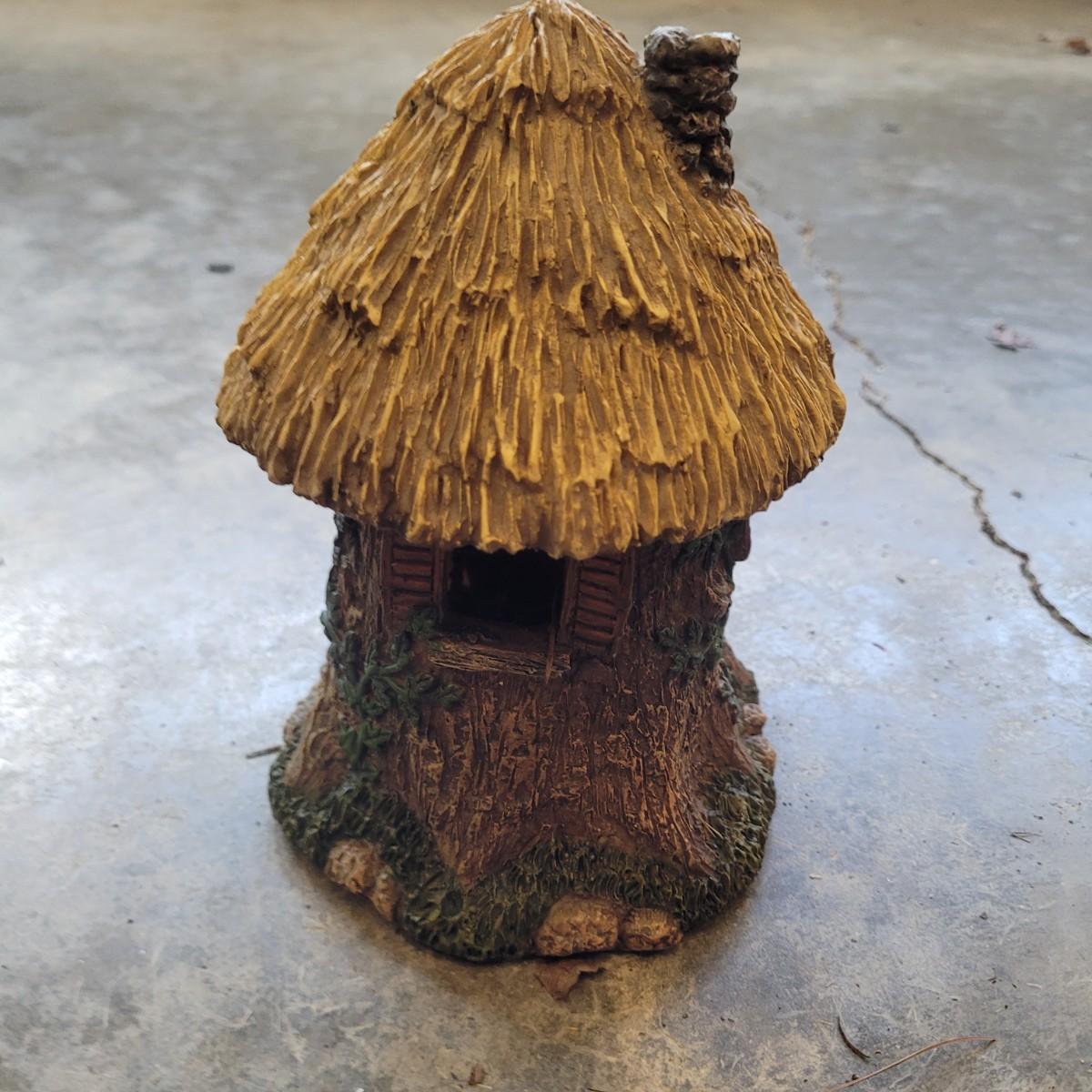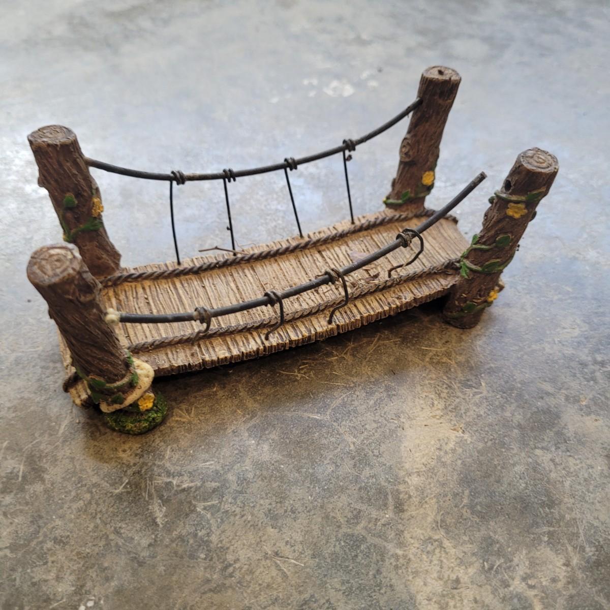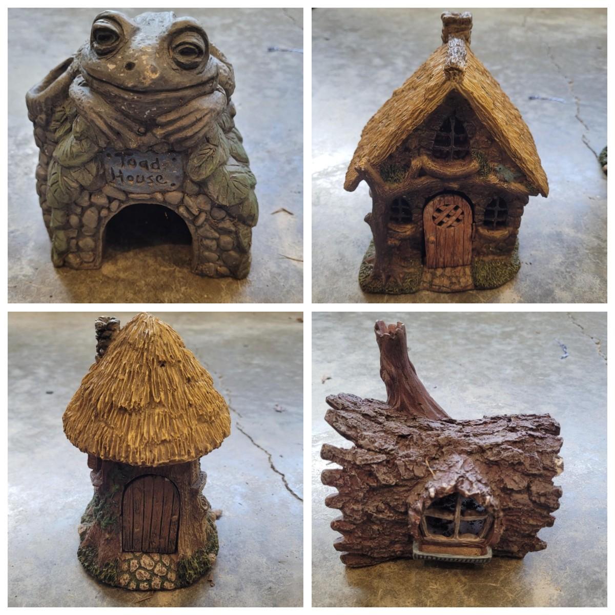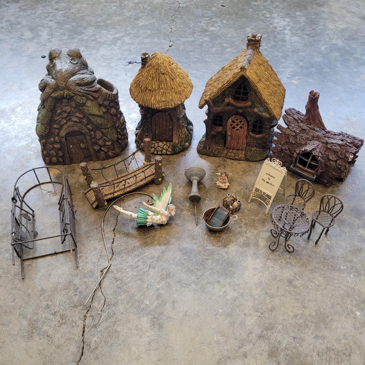This lot includes various fairy garden decorations. There are four miniature houses, a bridge, hanging fairy, and other small furniture. Some of the houses have doors and windows. The largest house measures 8" x 5" x 8"H.