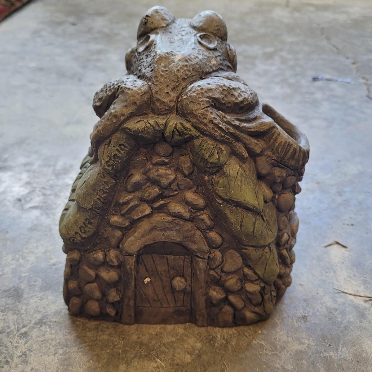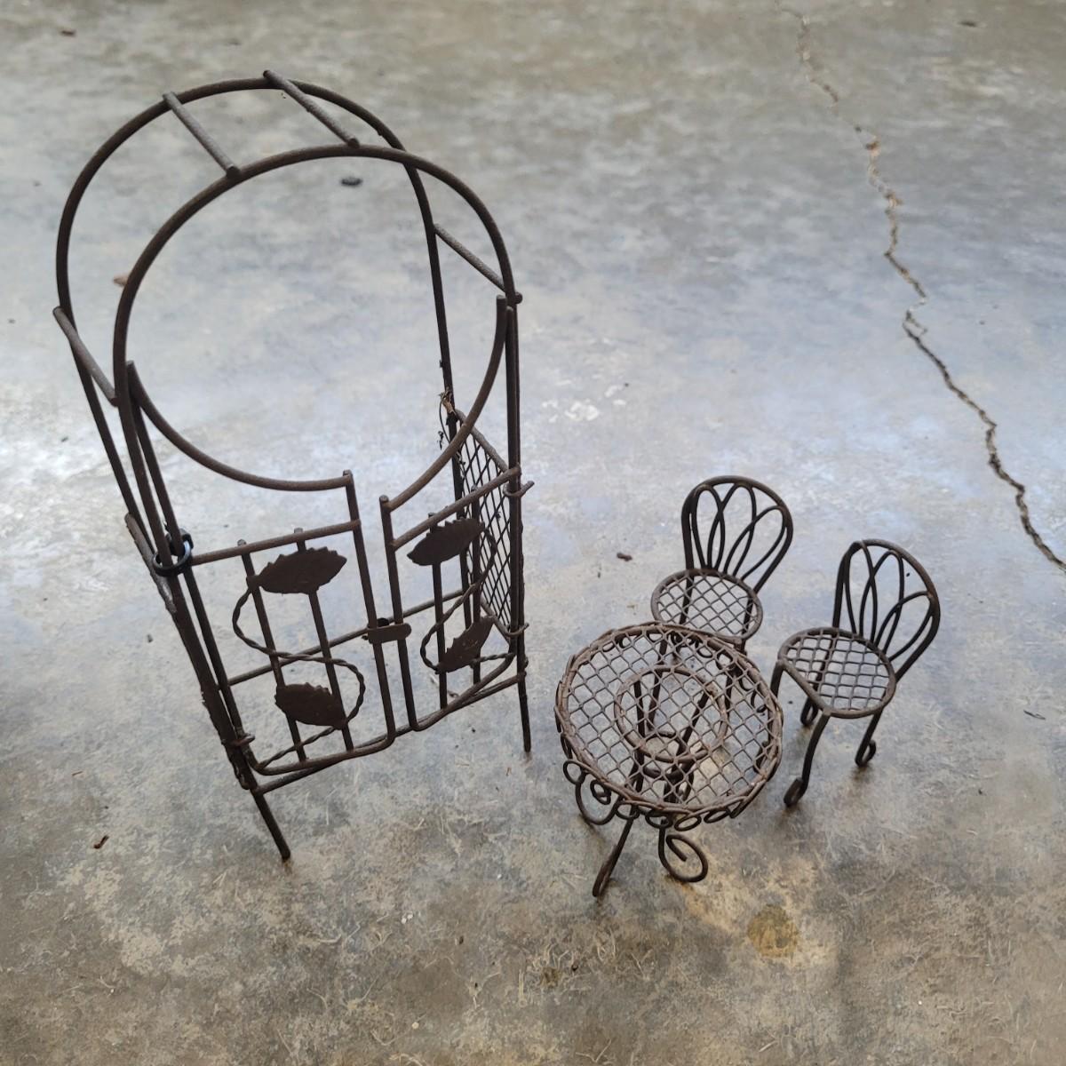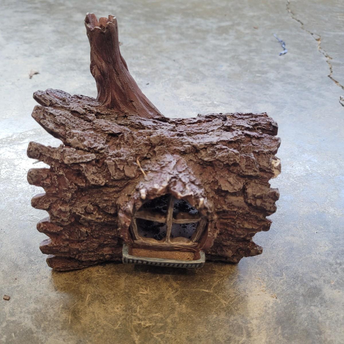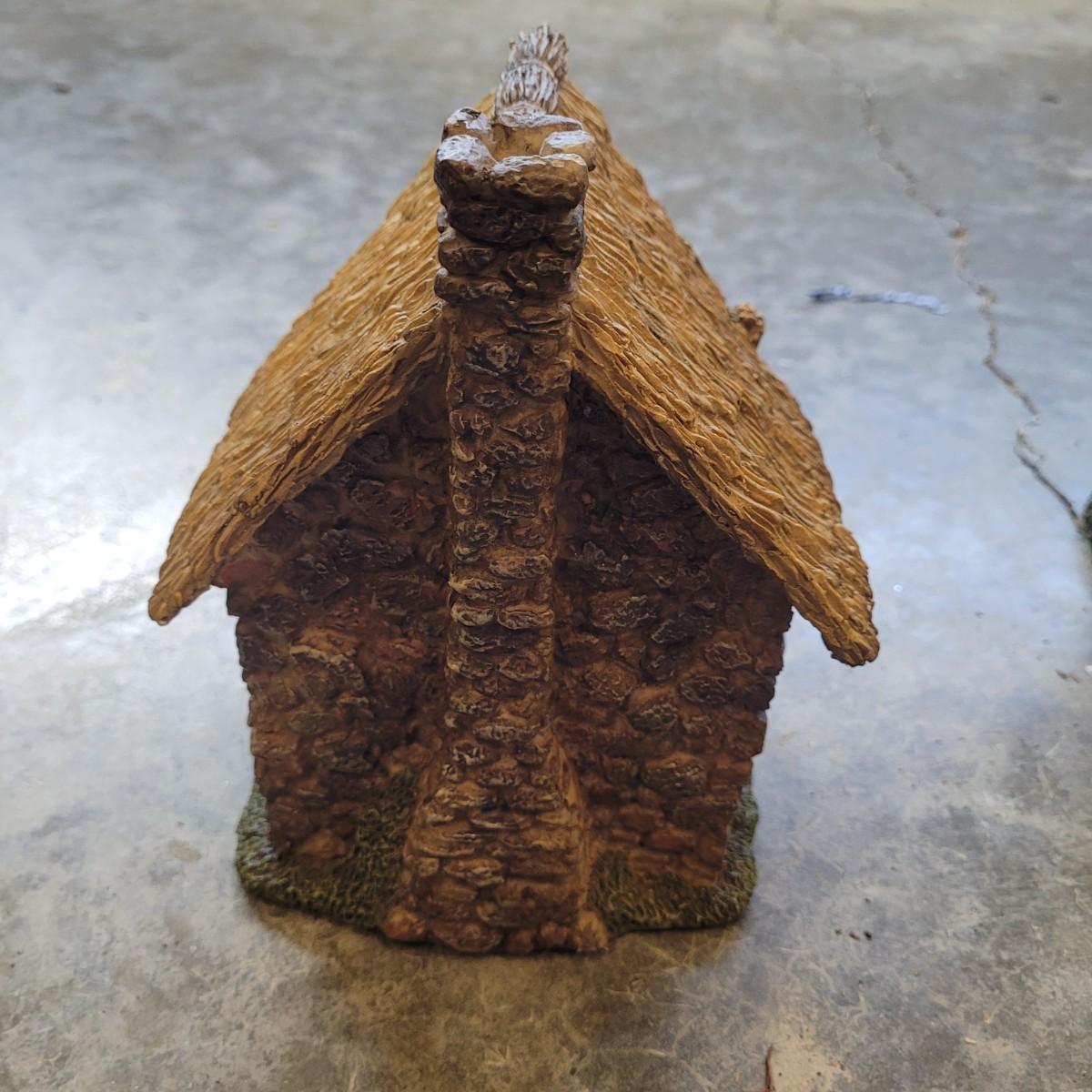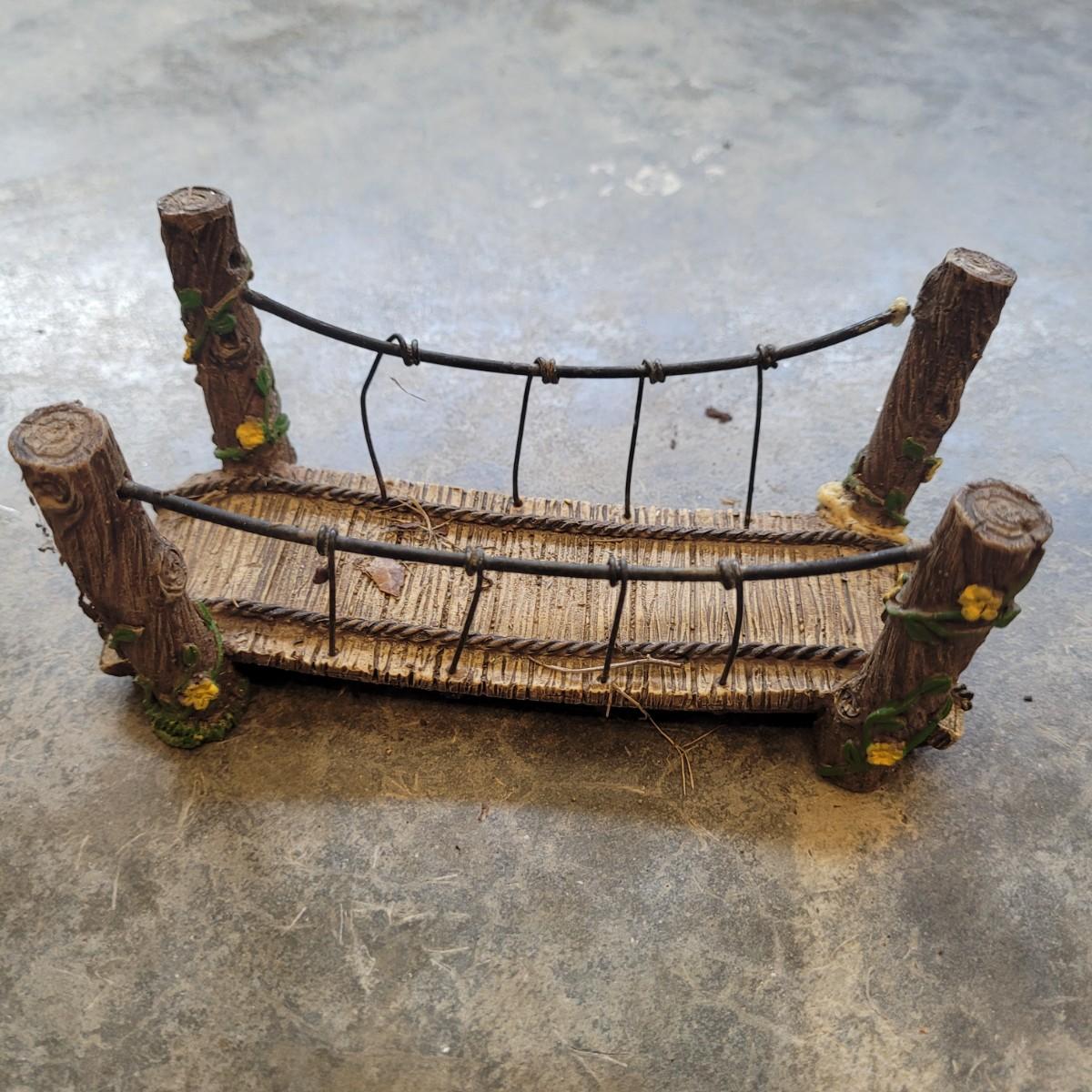 This lot includes various fairy garden decorations. There are four miniature houses, a bridge, hanging fairy, and other small furniture. Some of the houses have doors and windows. The largest house measures 8" x 5" x 8"H.