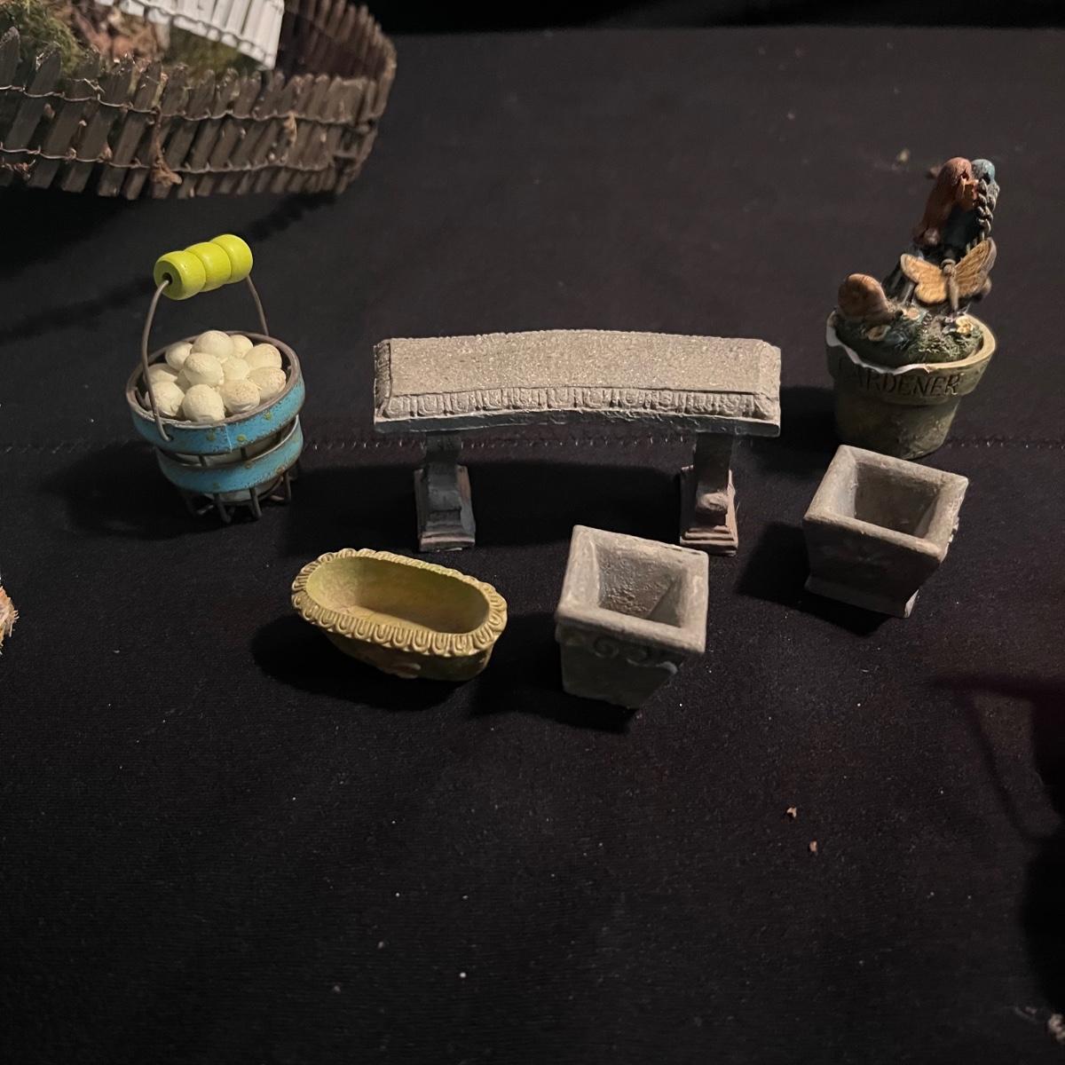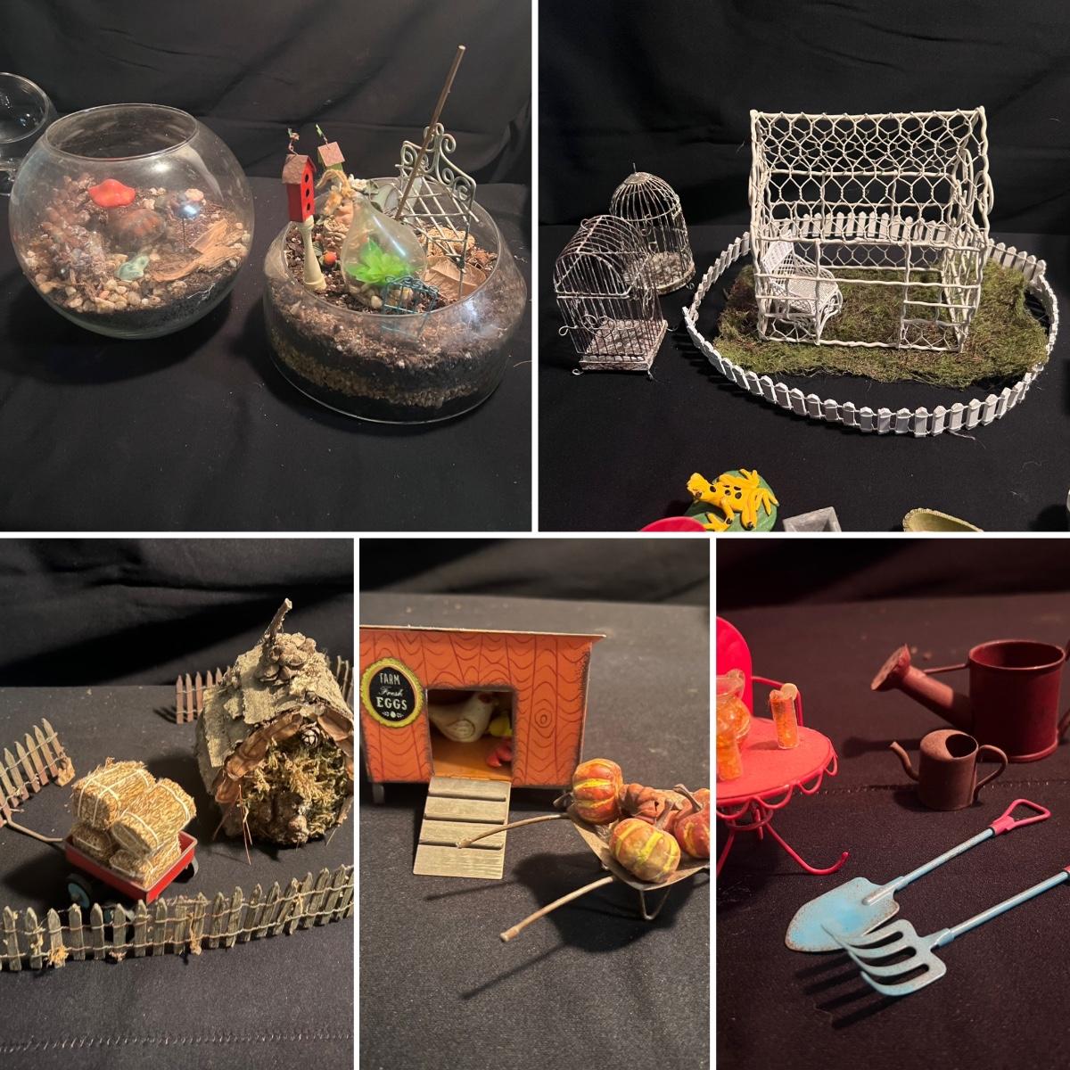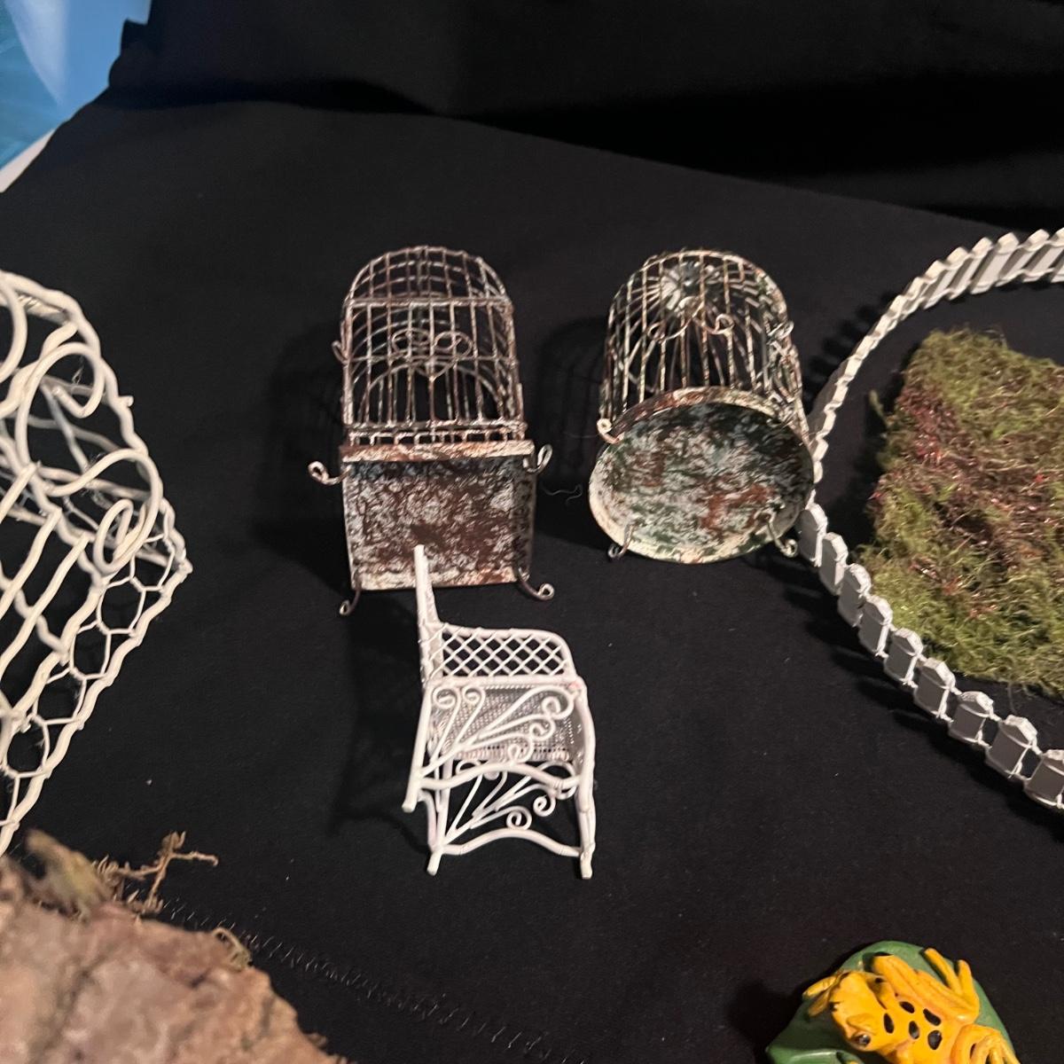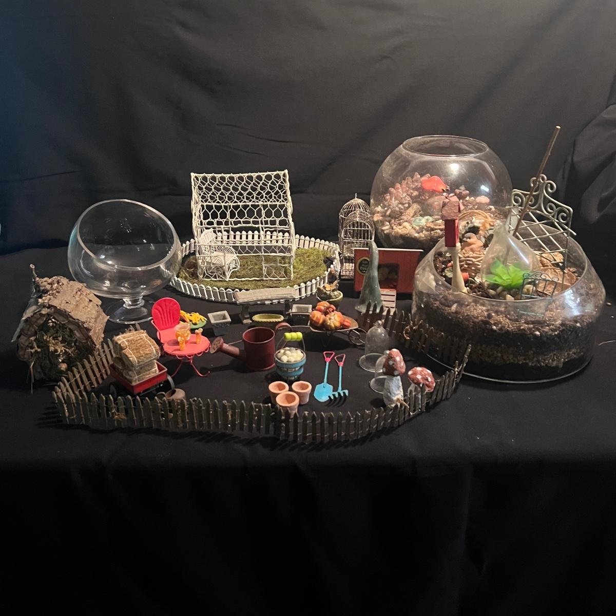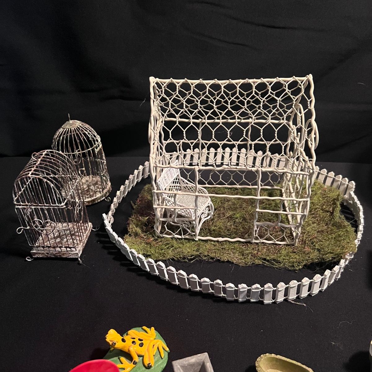 This adorable lot includes four glass terrariums. The tallest one which is the Moroccan style terrarium has faux plants in it; it measures measures 11”D x 12”H. Lots of miniature pieces for future projects such as fairy gardens. A mix of materials, mini patio table, bird cages, watering cans etc are metal. Lots of resin pieces as well and this lot even has straw bales.