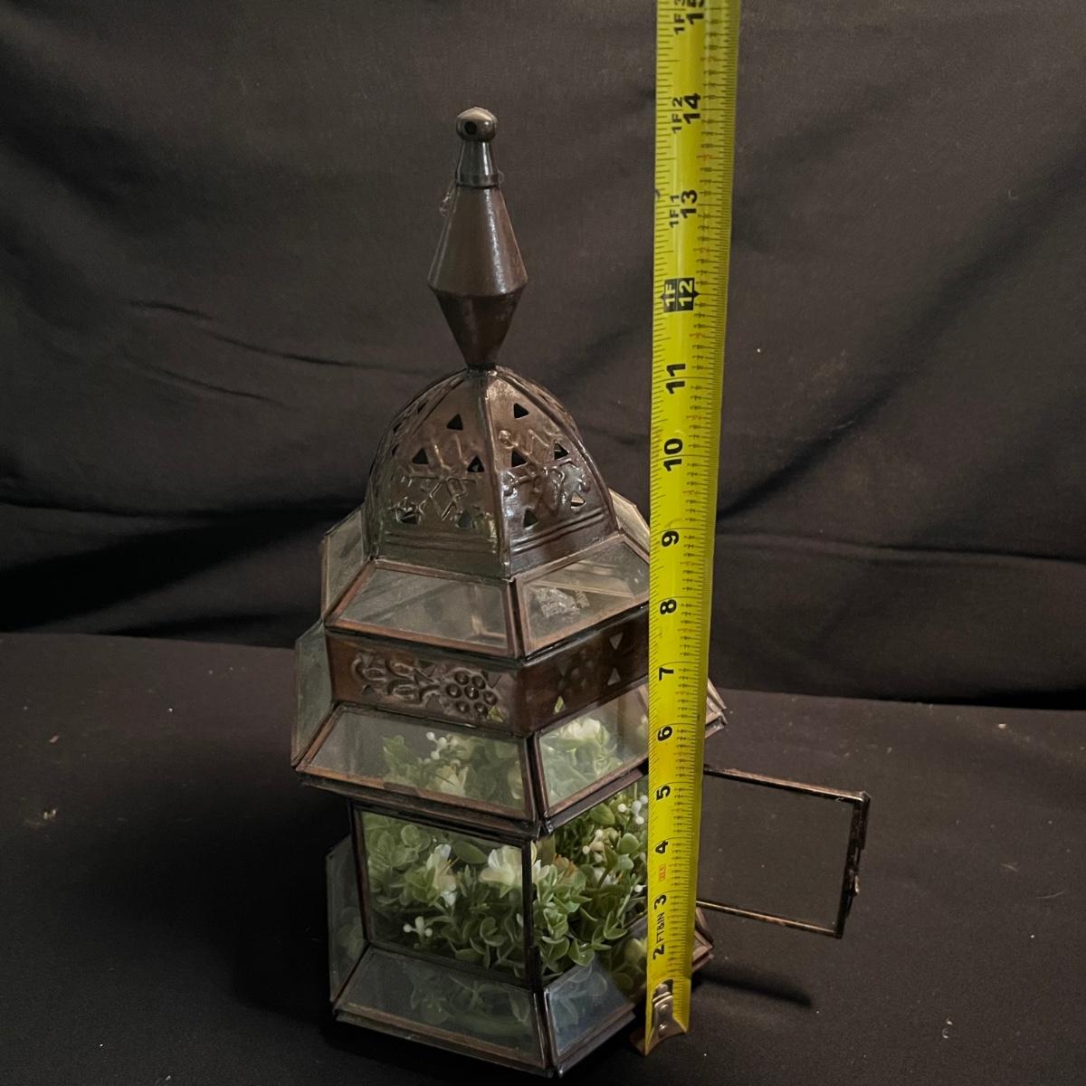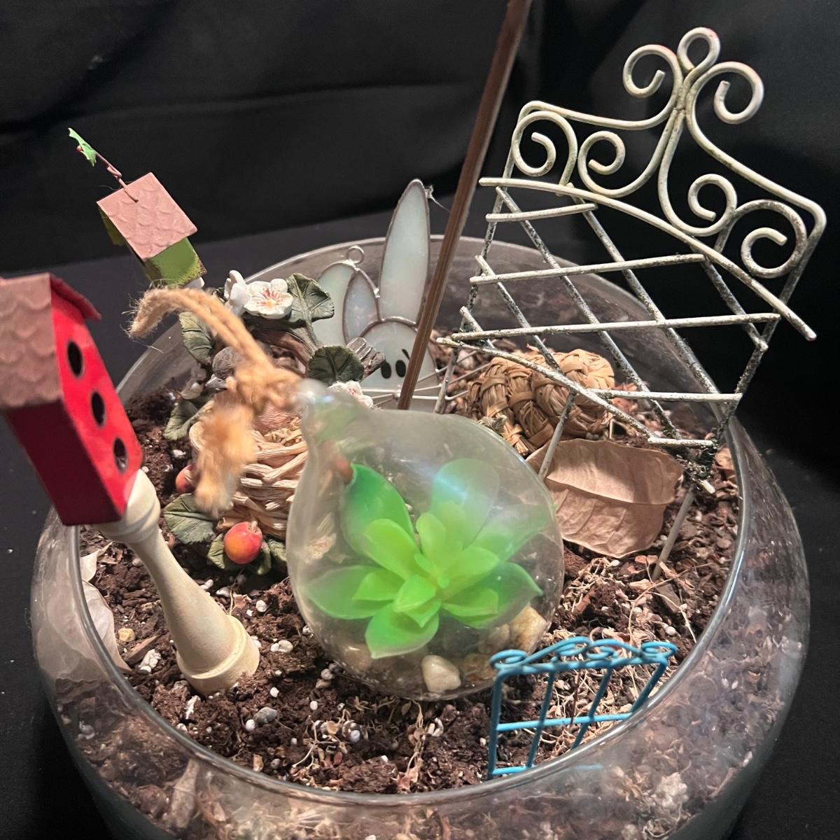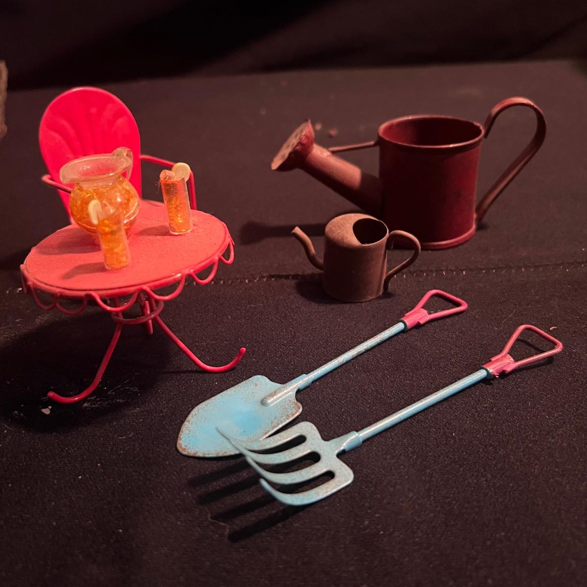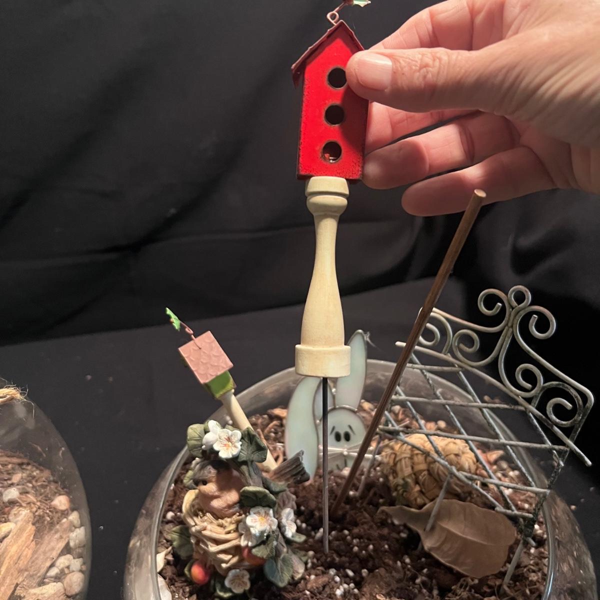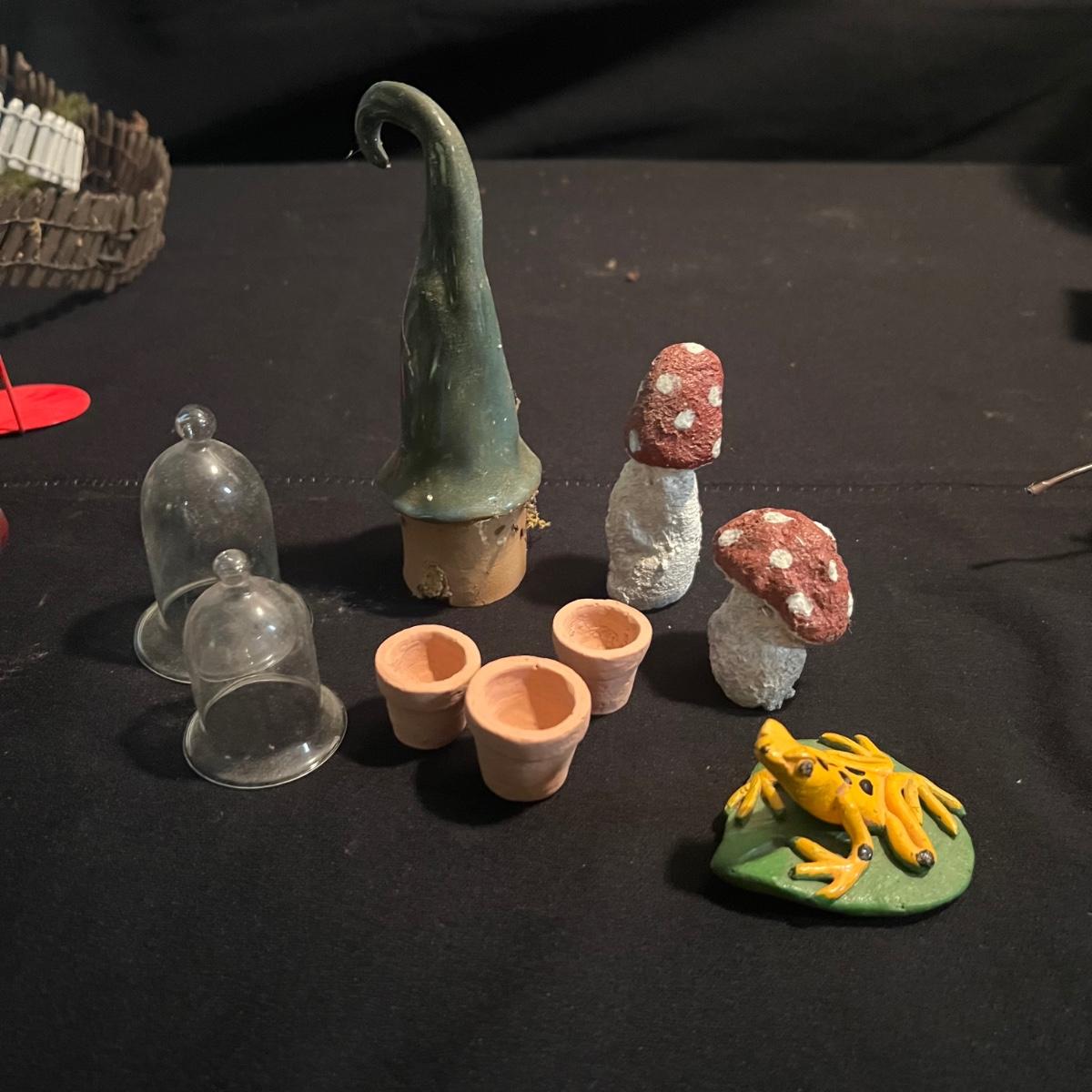 This adorable lot includes four glass terrariums. The tallest one which is the Moroccan style terrarium has faux plants in it; it measures measures 11”D x 12”H. Lots of miniature pieces for future projects such as fairy gardens. A mix of materials, mini patio table, bird cages, watering cans etc are metal. Lots of resin pieces as well and this lot even has straw bales.