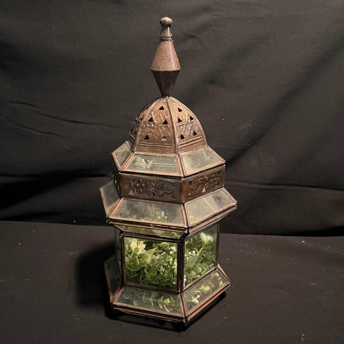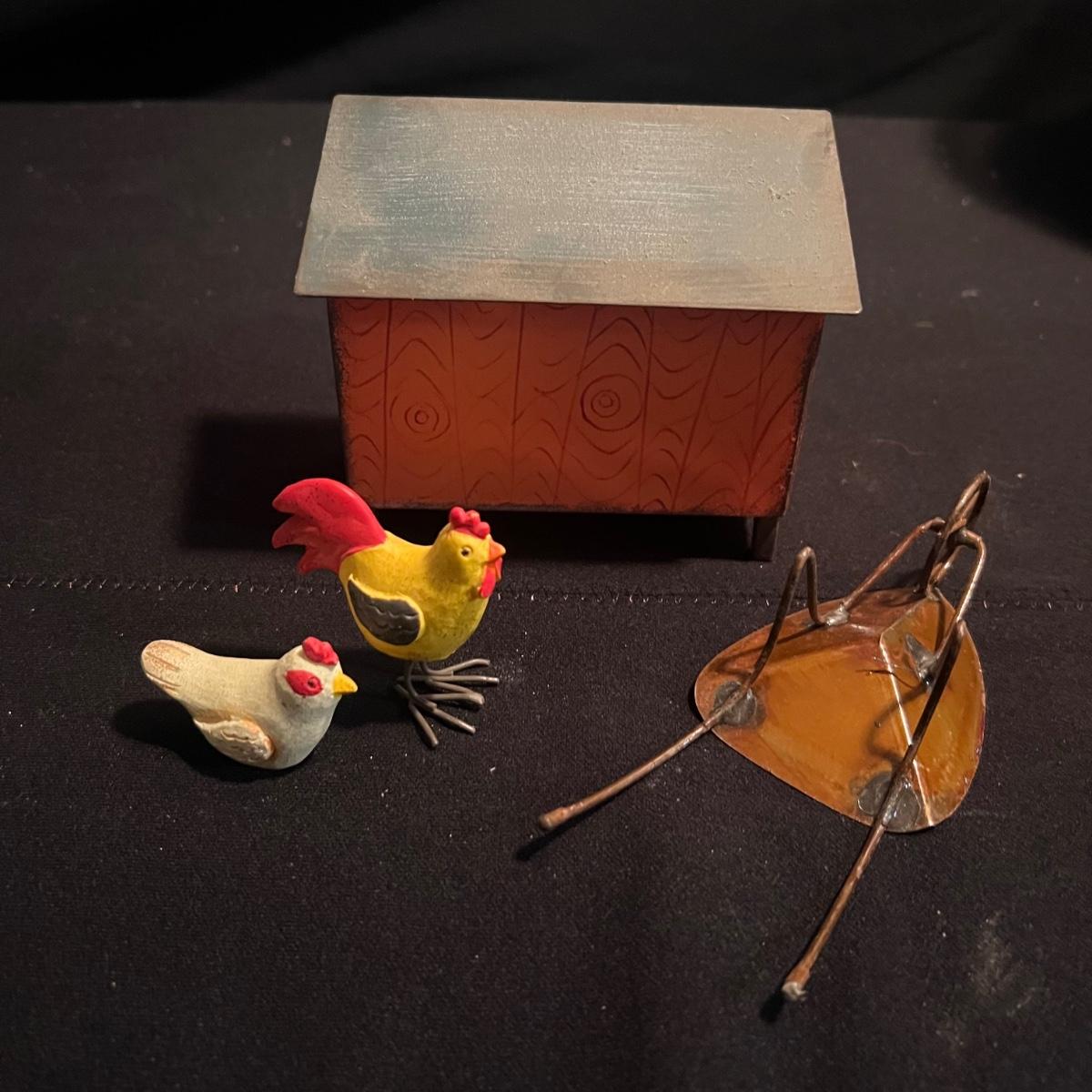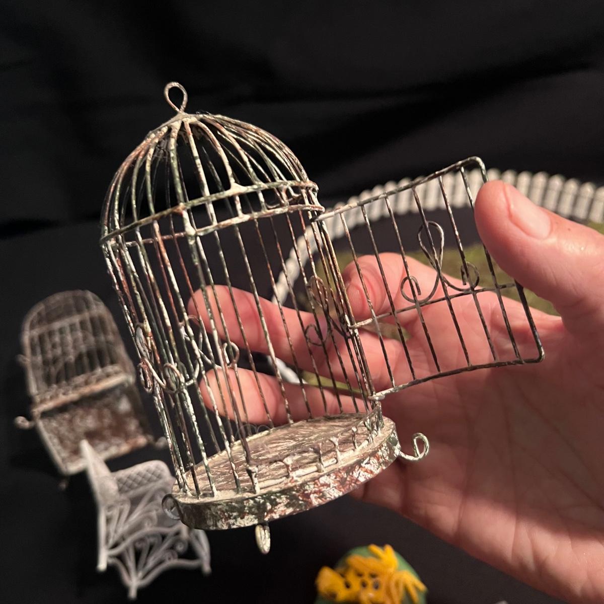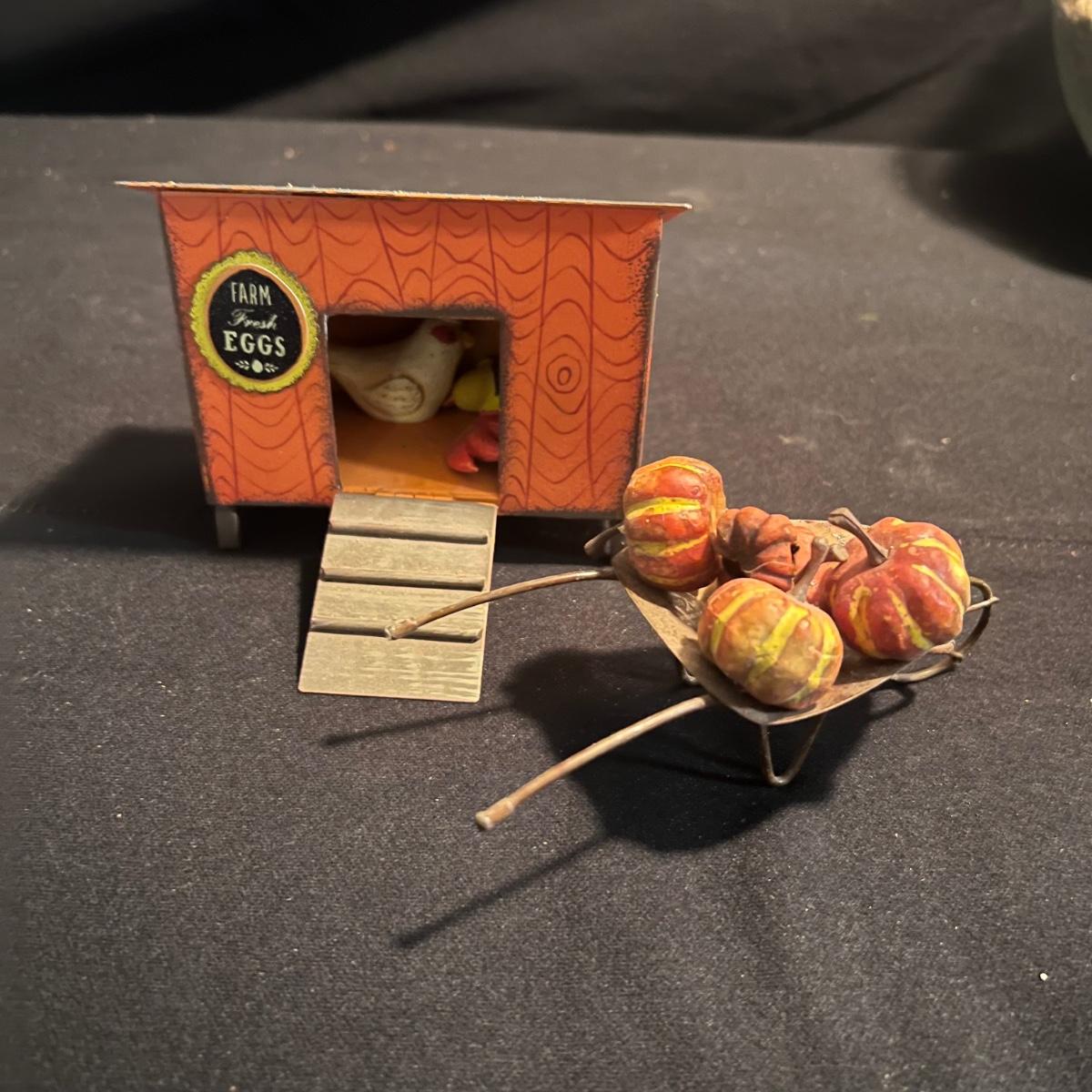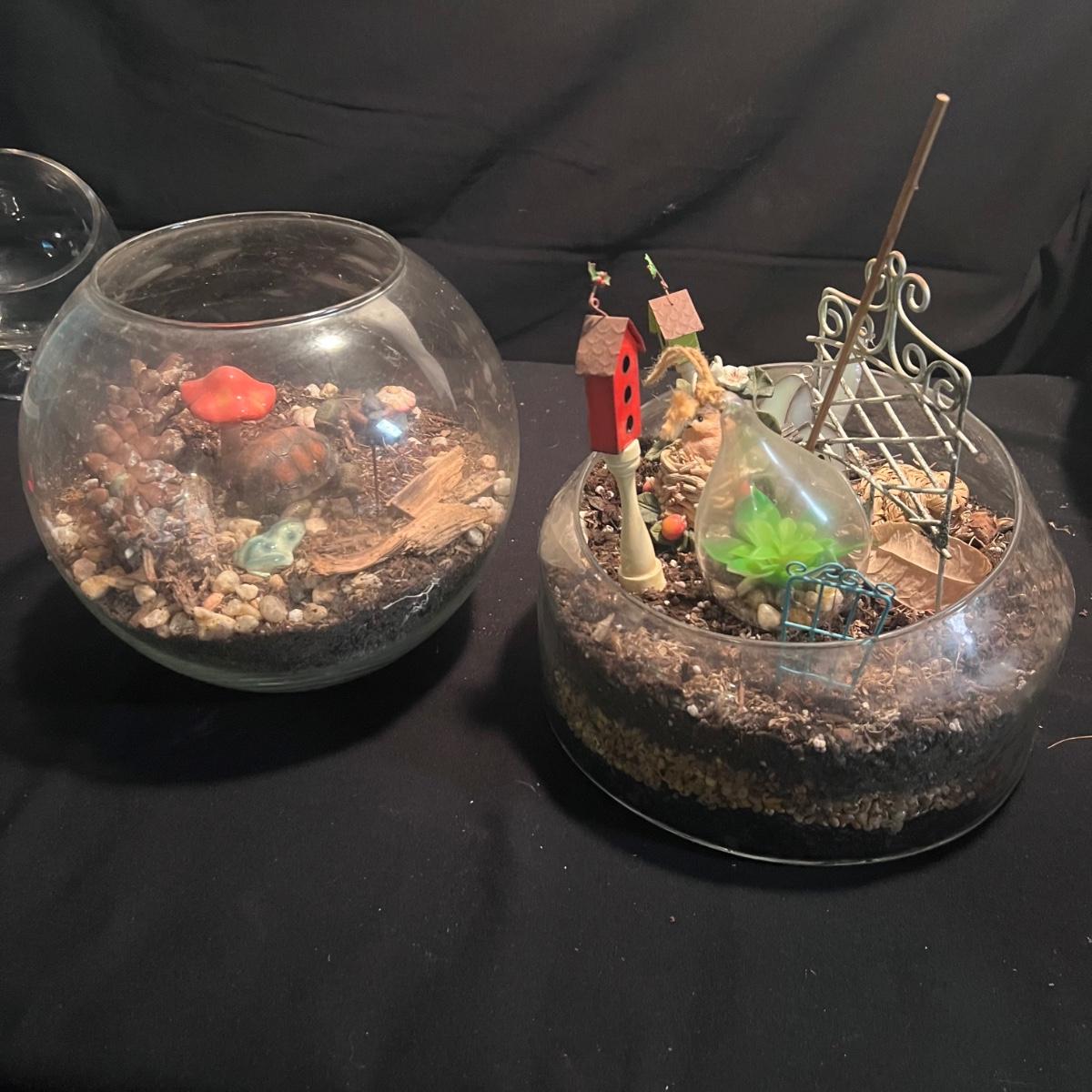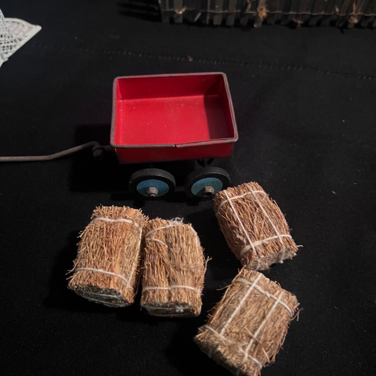 This adorable lot includes four glass terrariums. The tallest one which is the Moroccan style terrarium has faux plants in it; it measures measures 11”D x 12”H. Lots of miniature pieces for future projects such as fairy gardens. A mix of materials, mini patio table, bird cages, watering cans etc are metal. Lots of resin pieces as well and this lot even has straw bales.